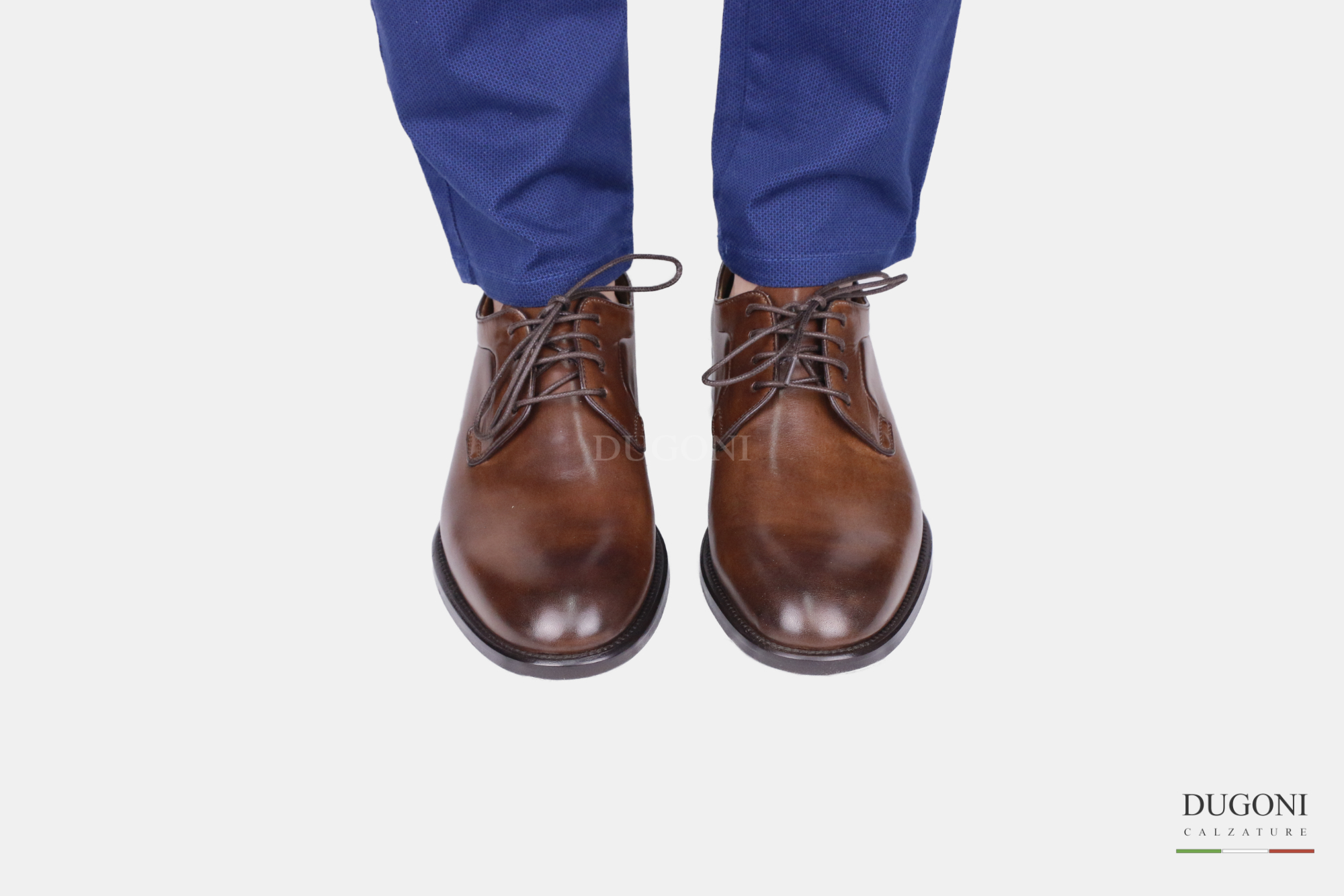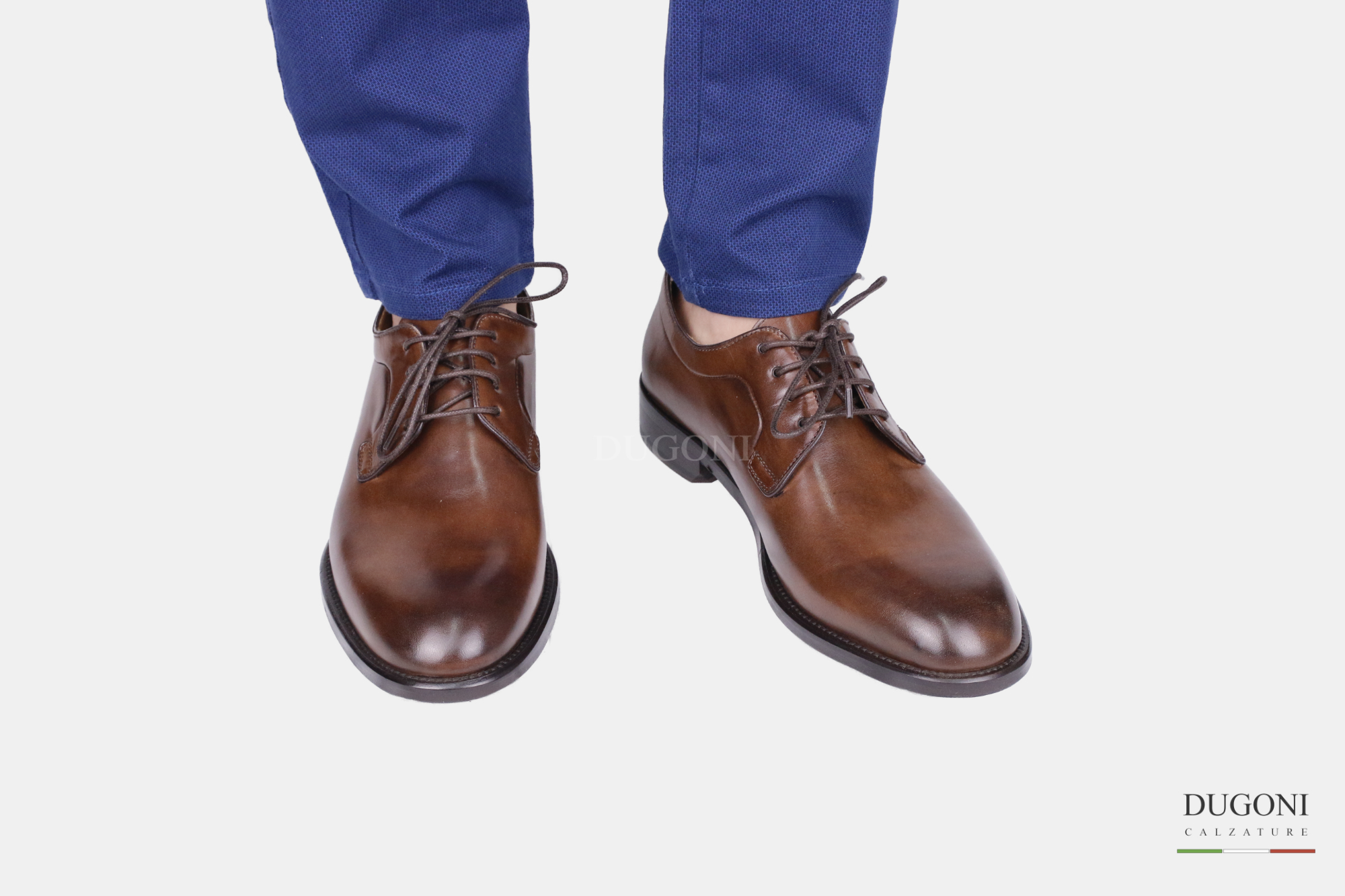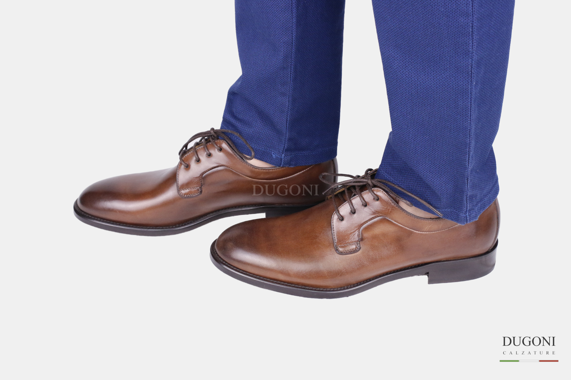 Stringata in pelle liscia sfoderata marrone chiaro con 4 fori. Fondo in cuoio con ovalino in gomma. Lavorazione blake.