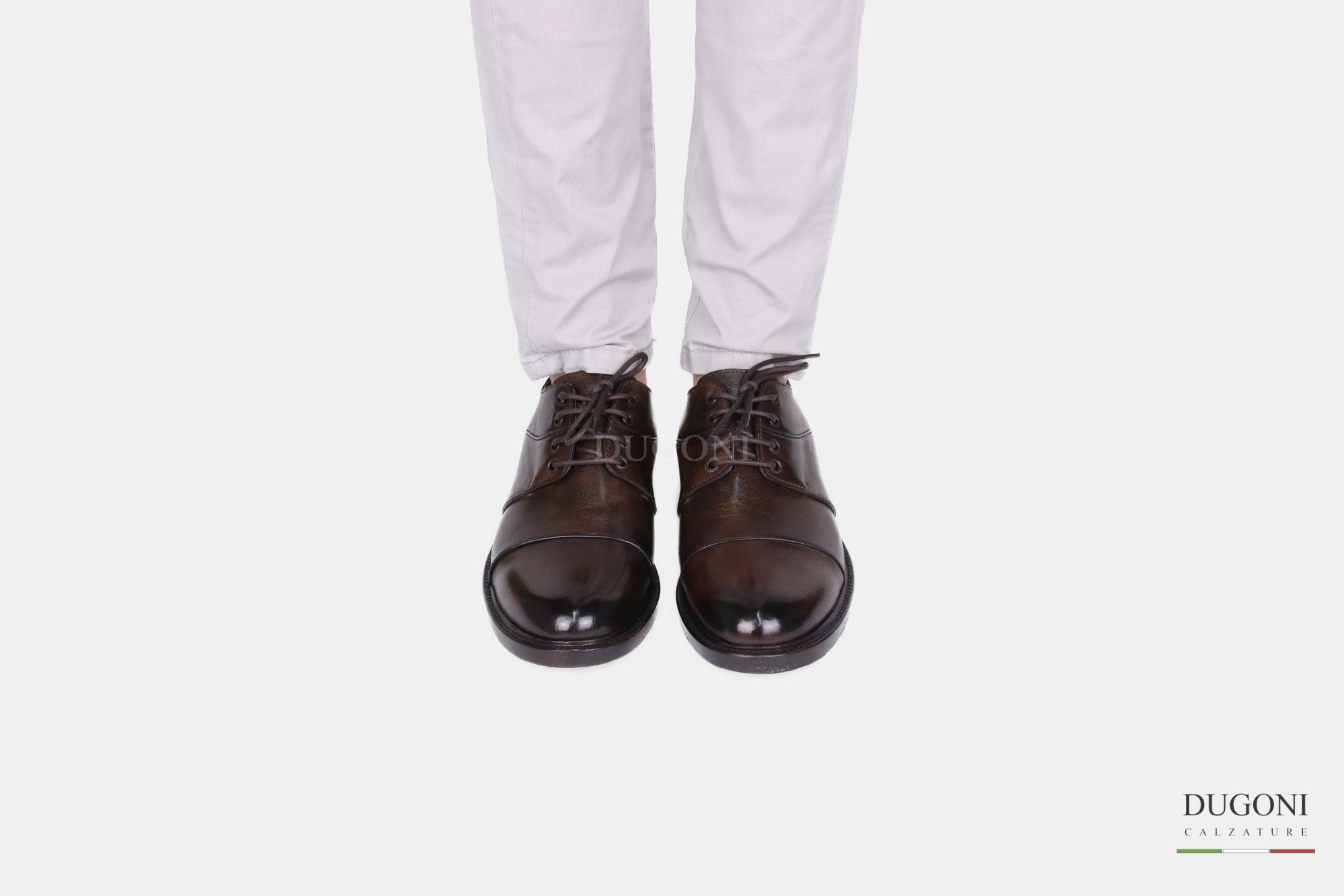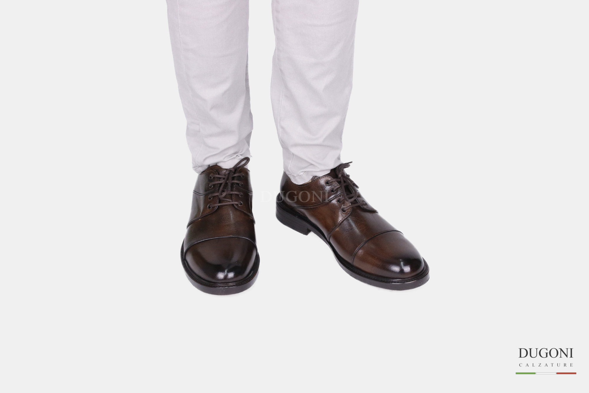 Derby in pelle color cioccolato con puntale e motivo in rilievo. Allacciatura a 4 fori con occhielli. Suola in cuoio con iniezione gomma antiscivolo trasparente.