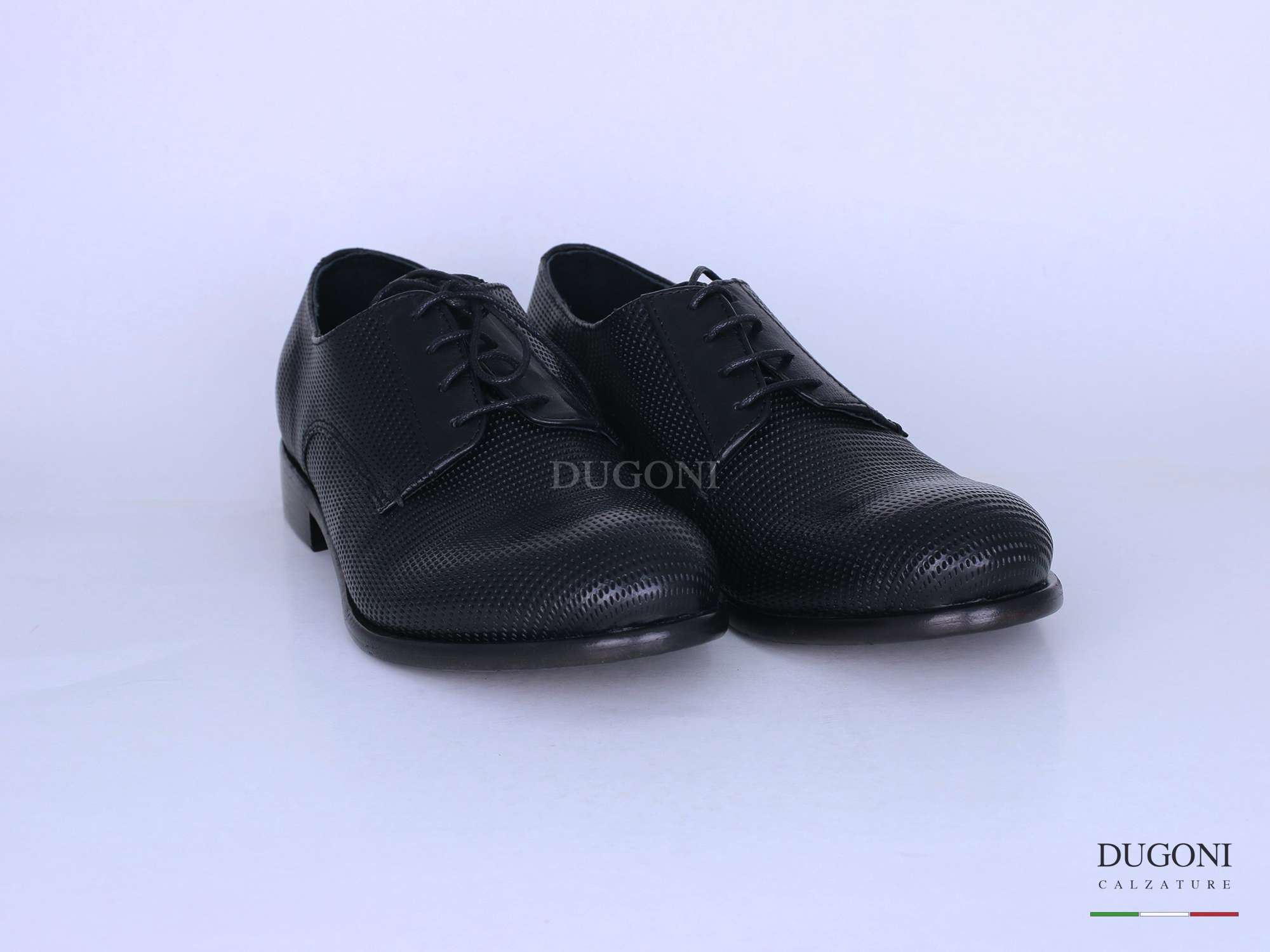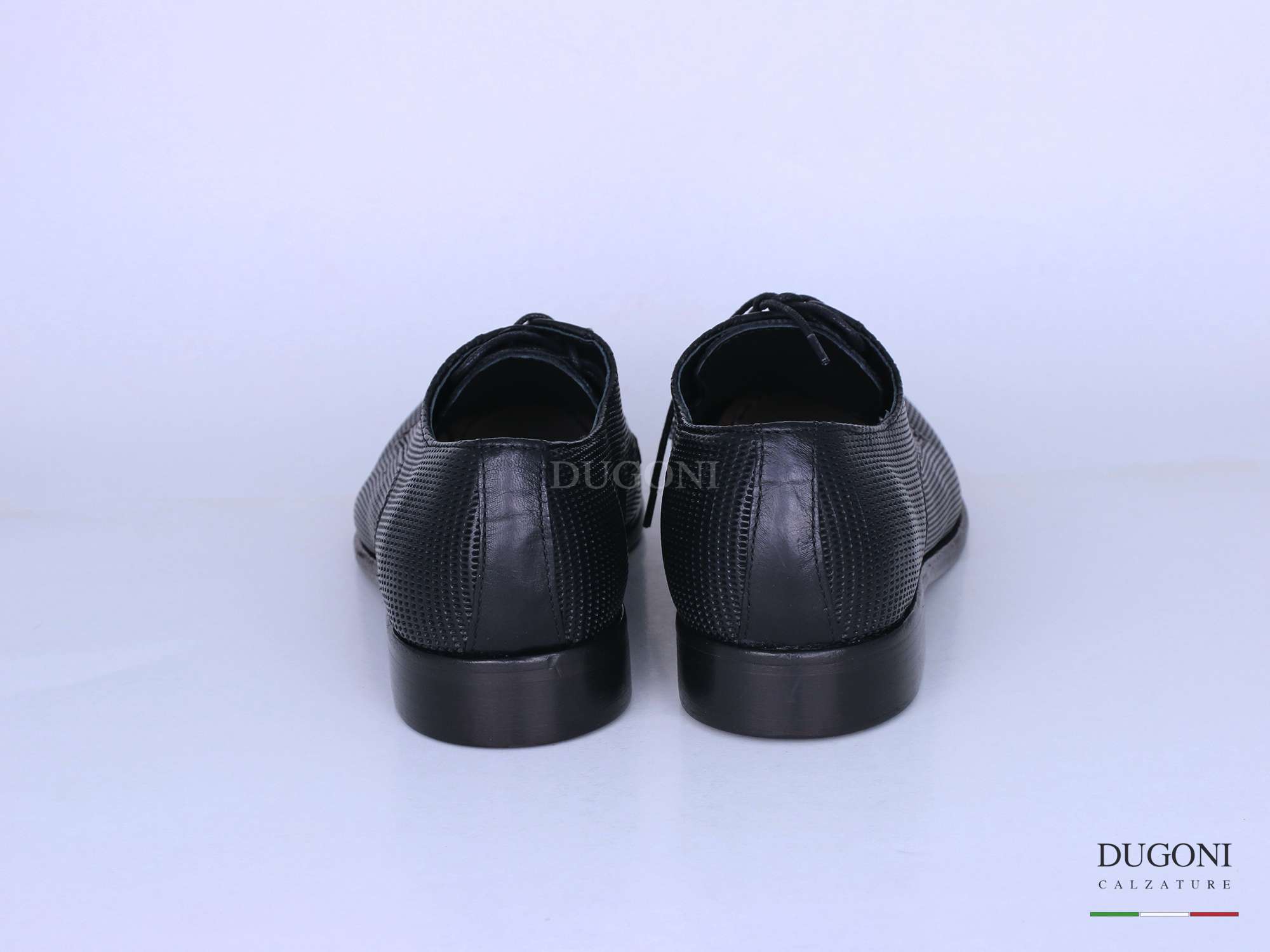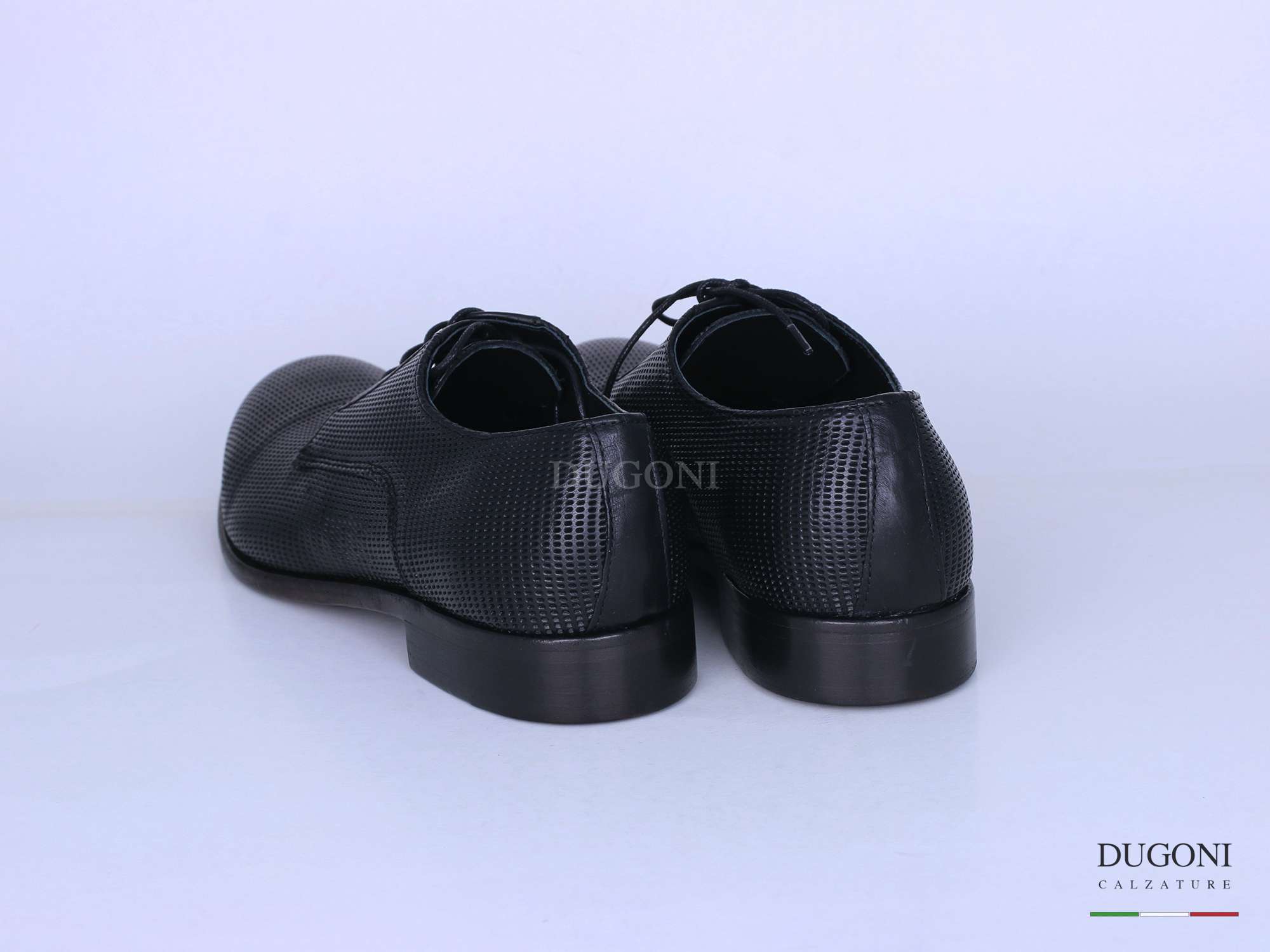 Stringata in pelle nera microforo, forma tonda e allacciatura derby a 5 fori.