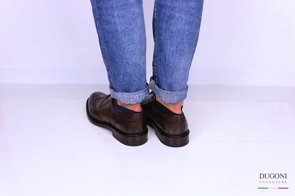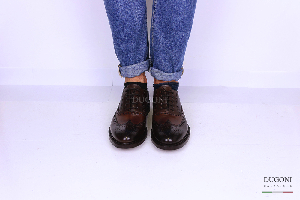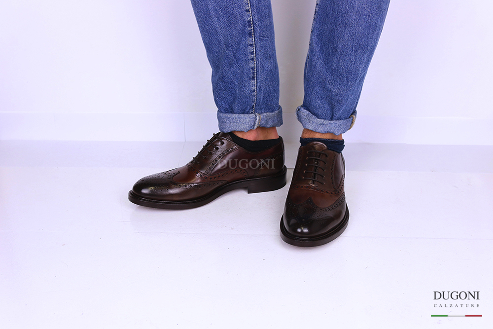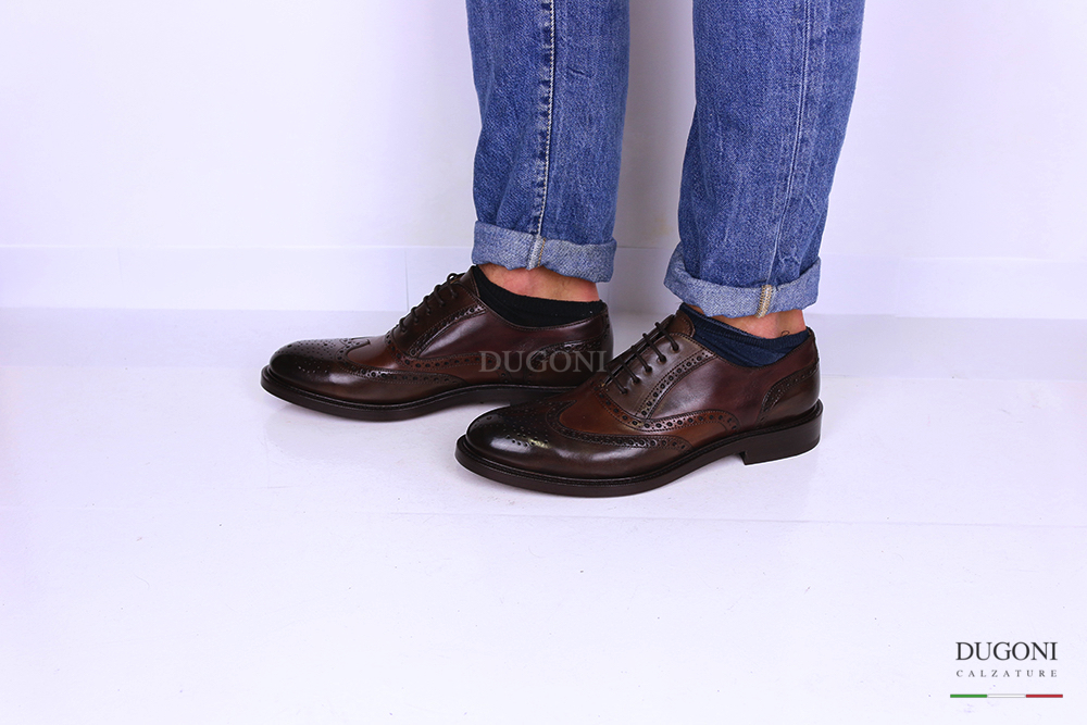 Stringata tricolor marrone-brandy-bordeaux. Lavorazione all’inglese con coda di rondine e fiore sulla punta. Allacciatura francesina. Fondo cuoio.