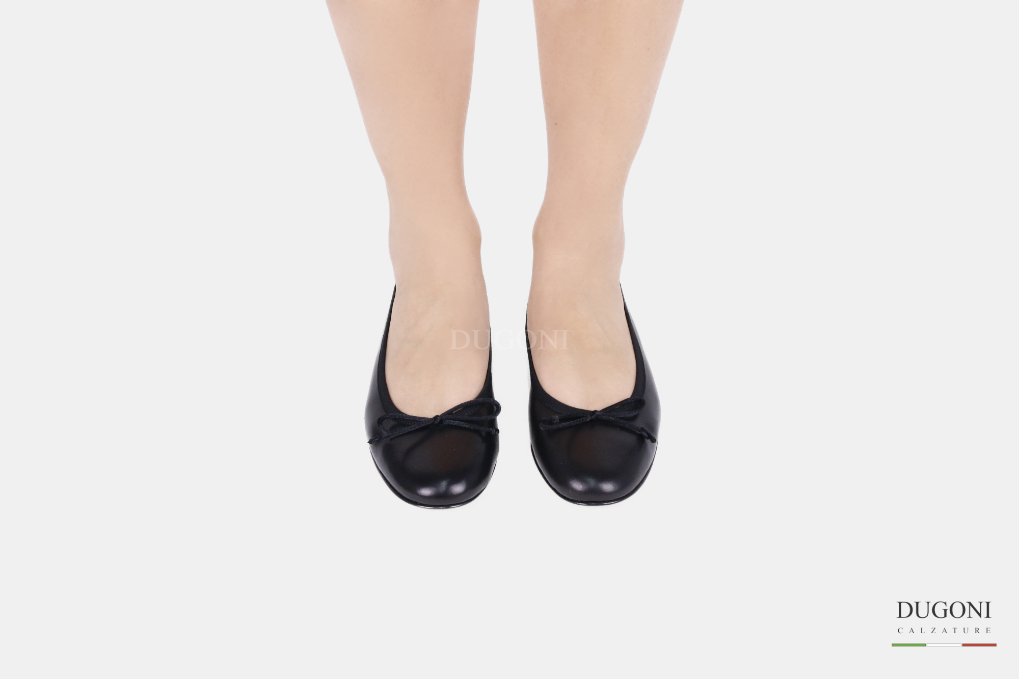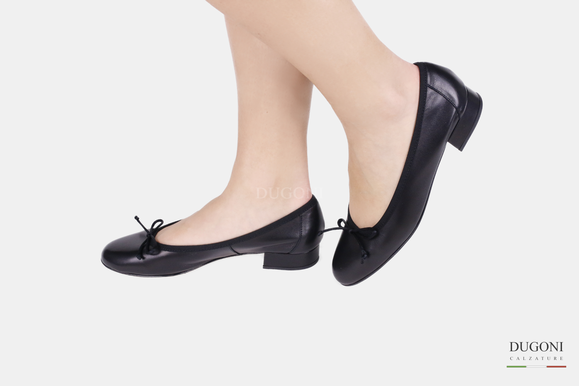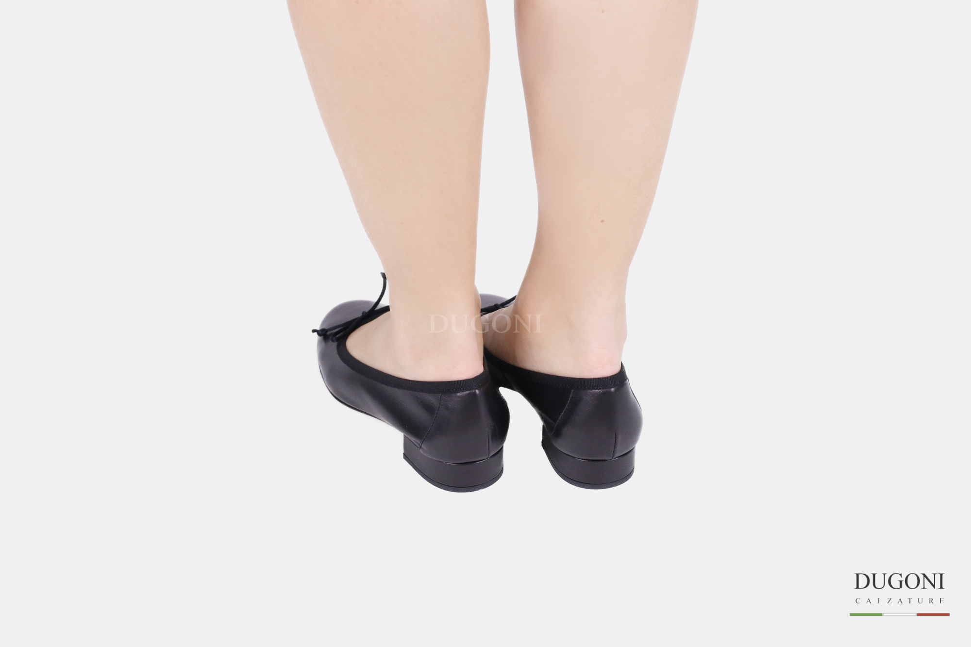 Ballerina in pelle nera con bordino cucito in cotone gros grein e fiocchetto in raso in tinta. Tacco 20 mm ricoperto in tinta . Forma accollata, pelle sfoderata . Suola in cuoio.