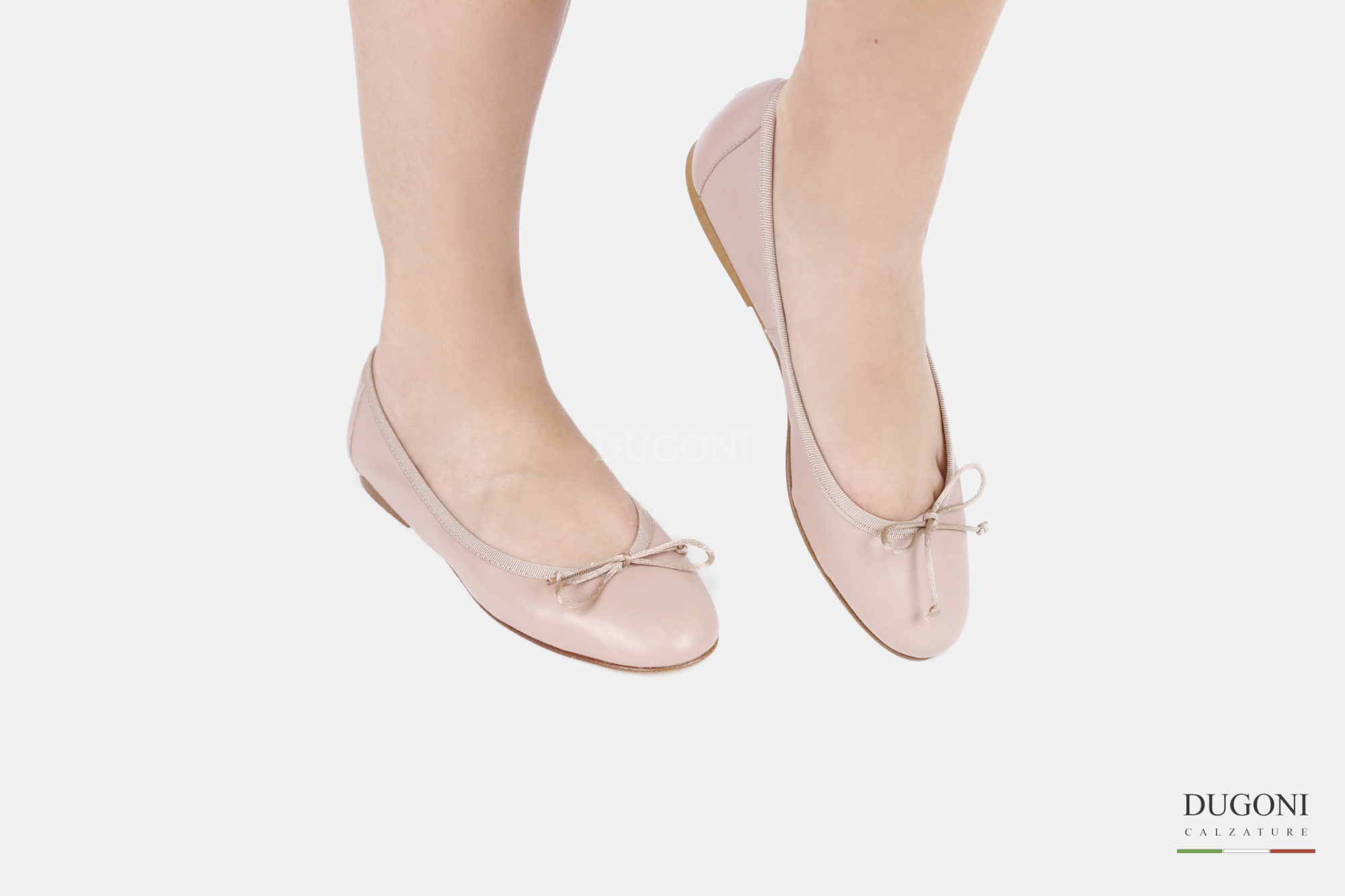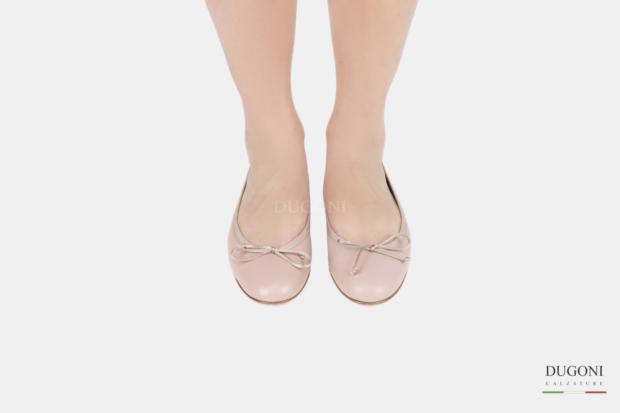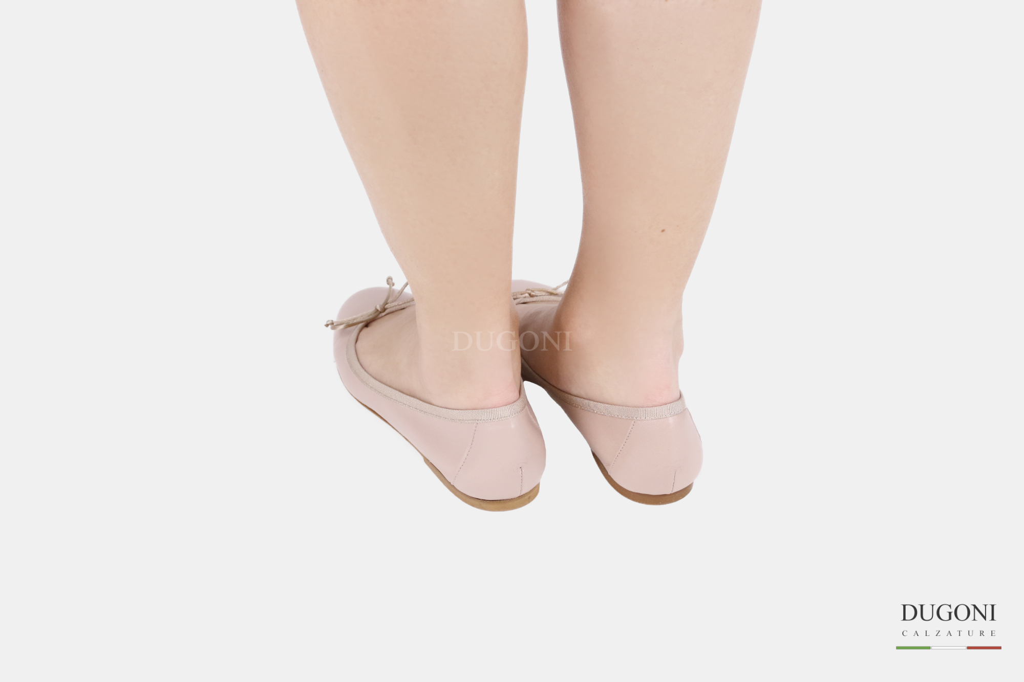 Ballerine in pelle cipria con bordino cucito in gros grein e fiocchetto in raso in tinta . Forma scollata, pelle sfoderata . Suola in cuoio.