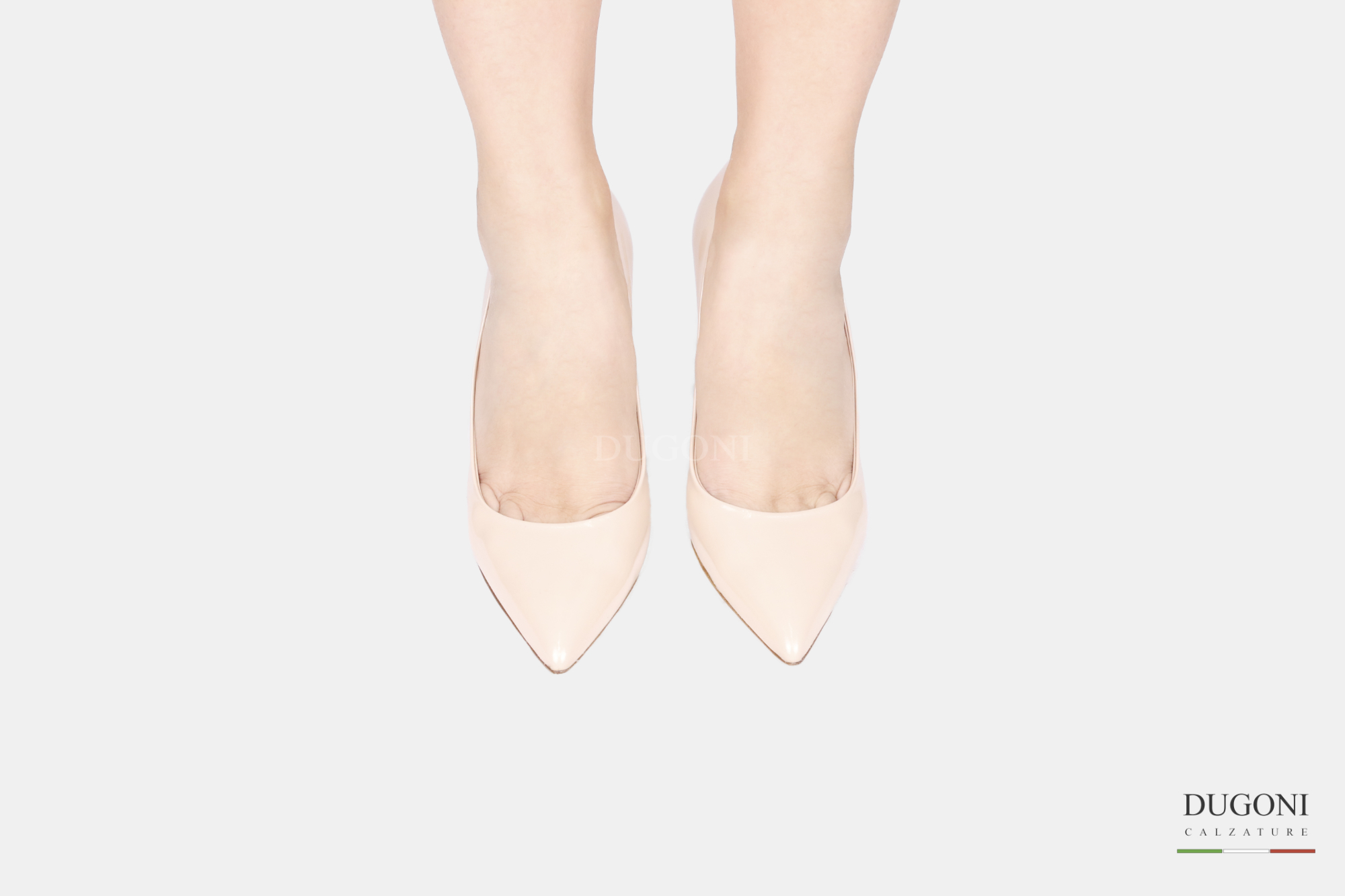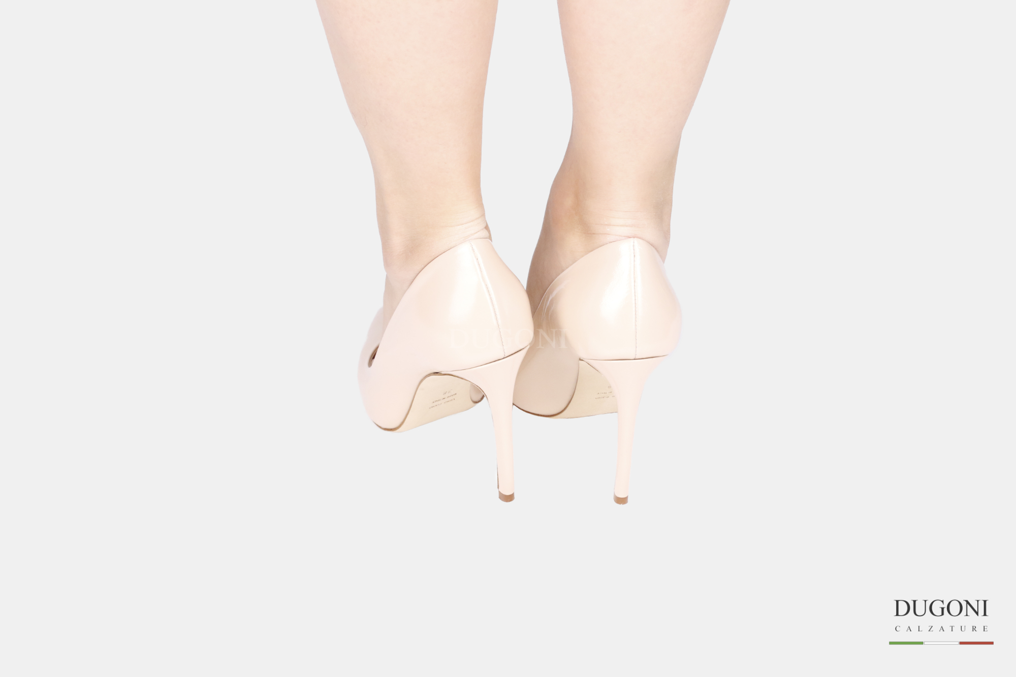Décolleté sfilato in verlux nude. Tacco stiletto 110 mm a coda. Suola in cuoio.