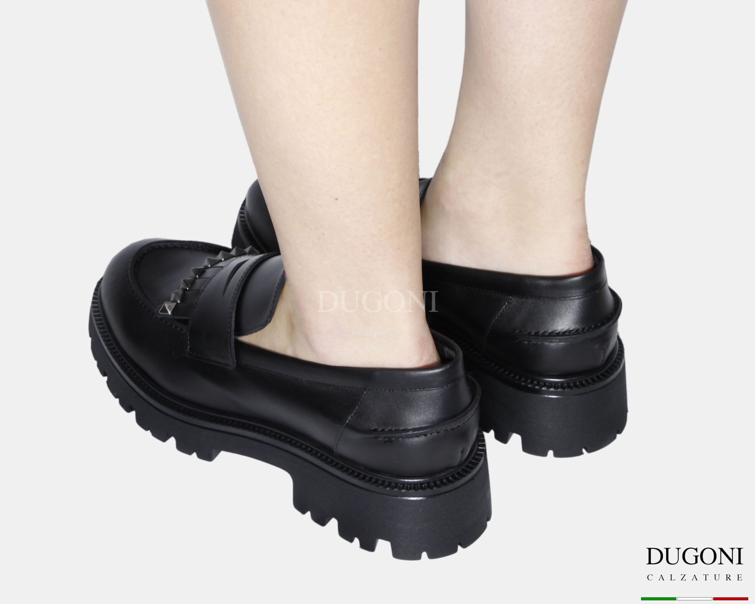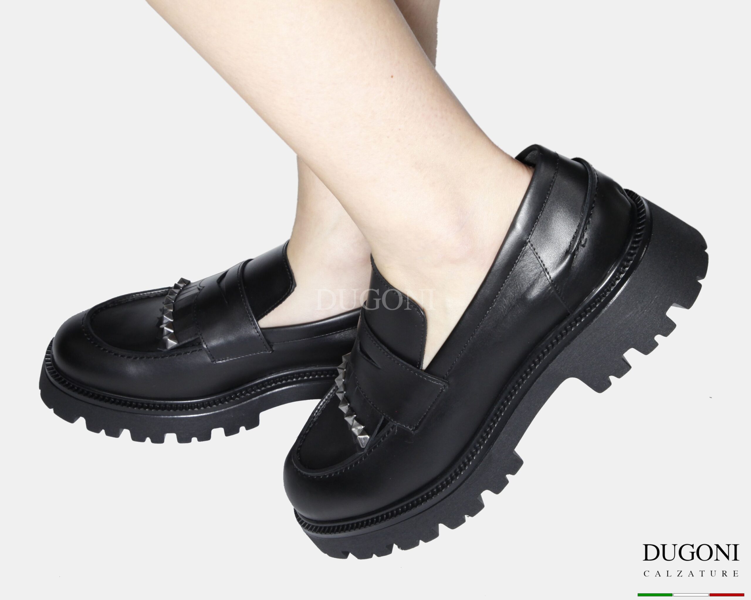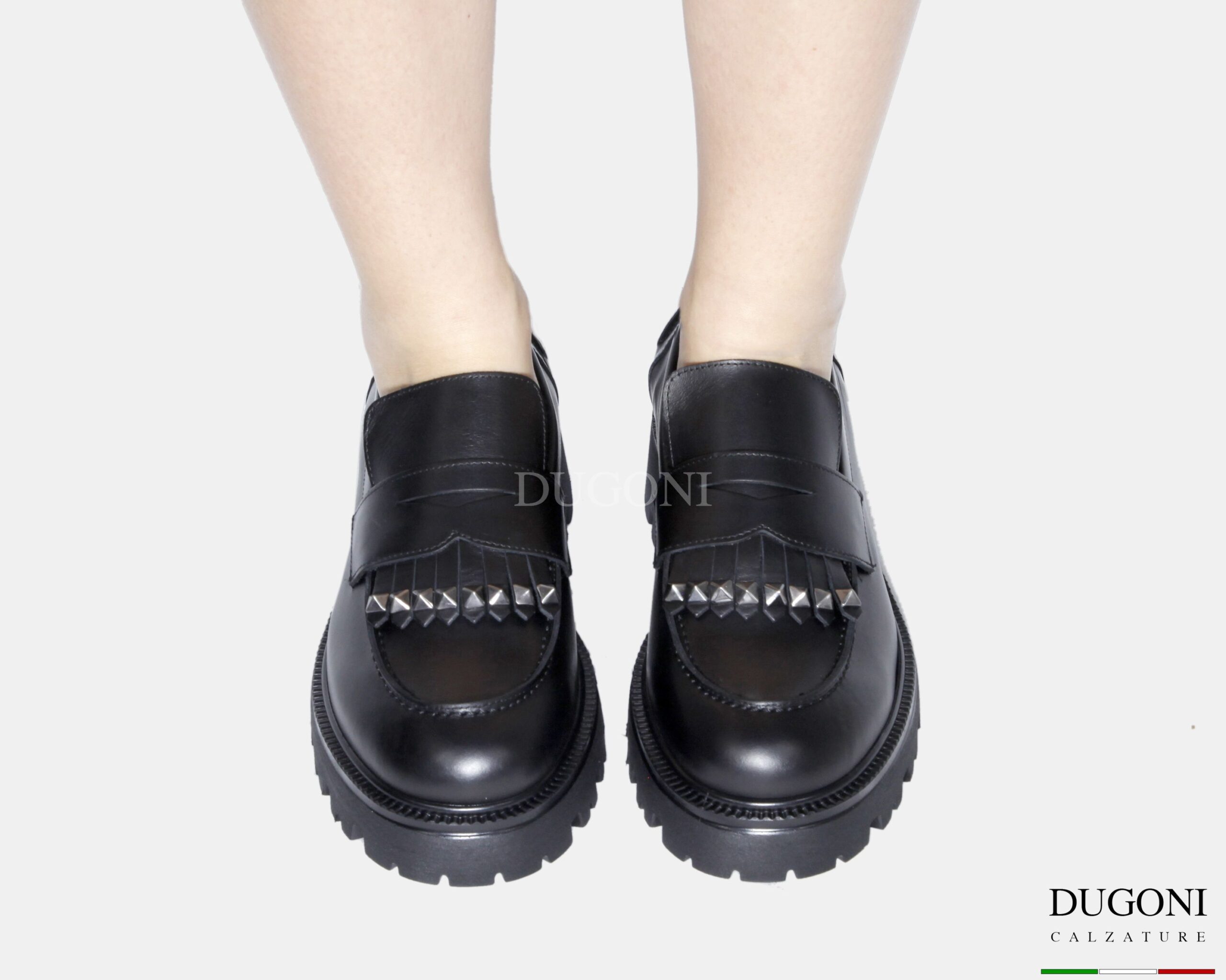 Mocassino in pelle nera con frangia e borchie . Suola in gomma carrarmato Wellf-light.