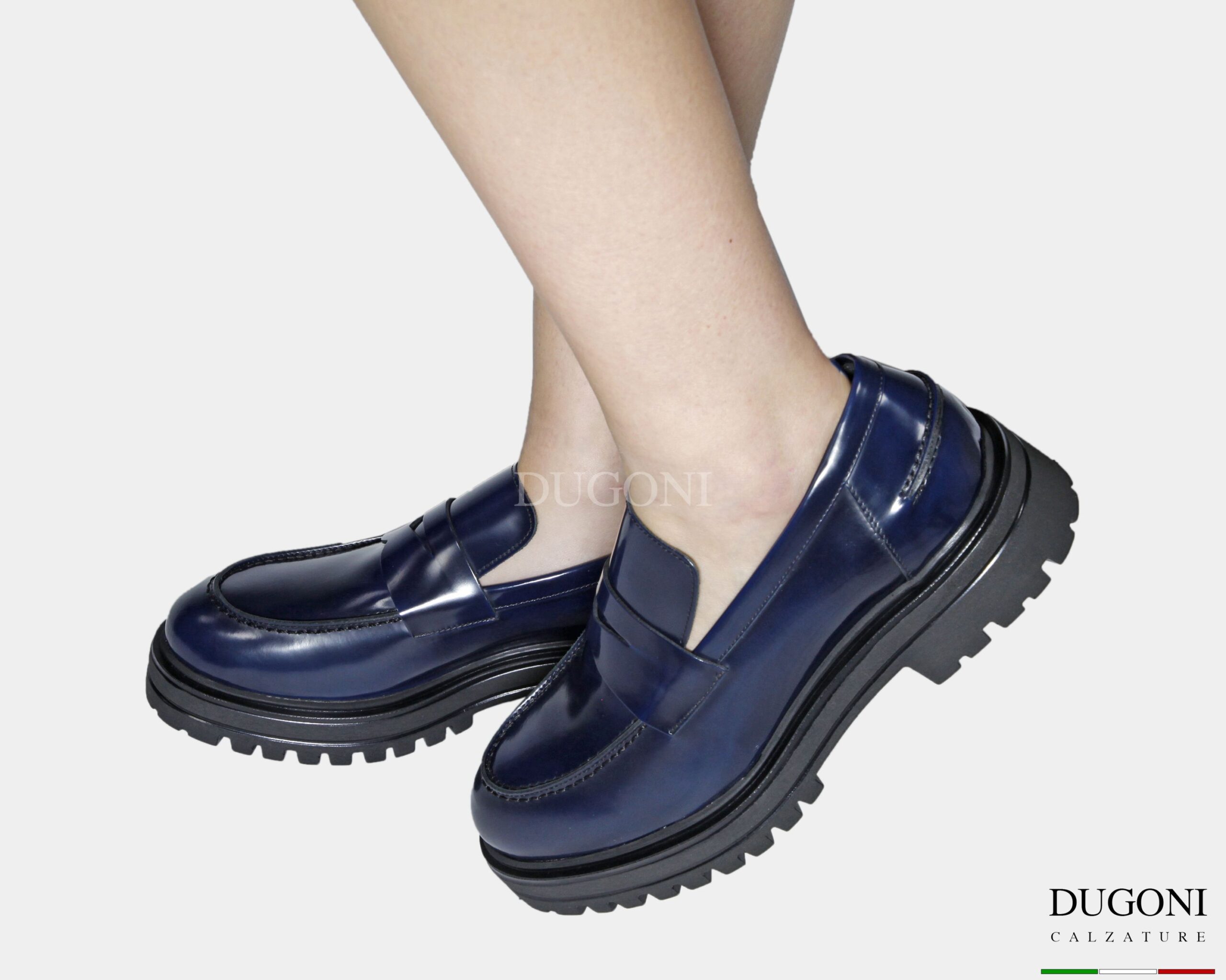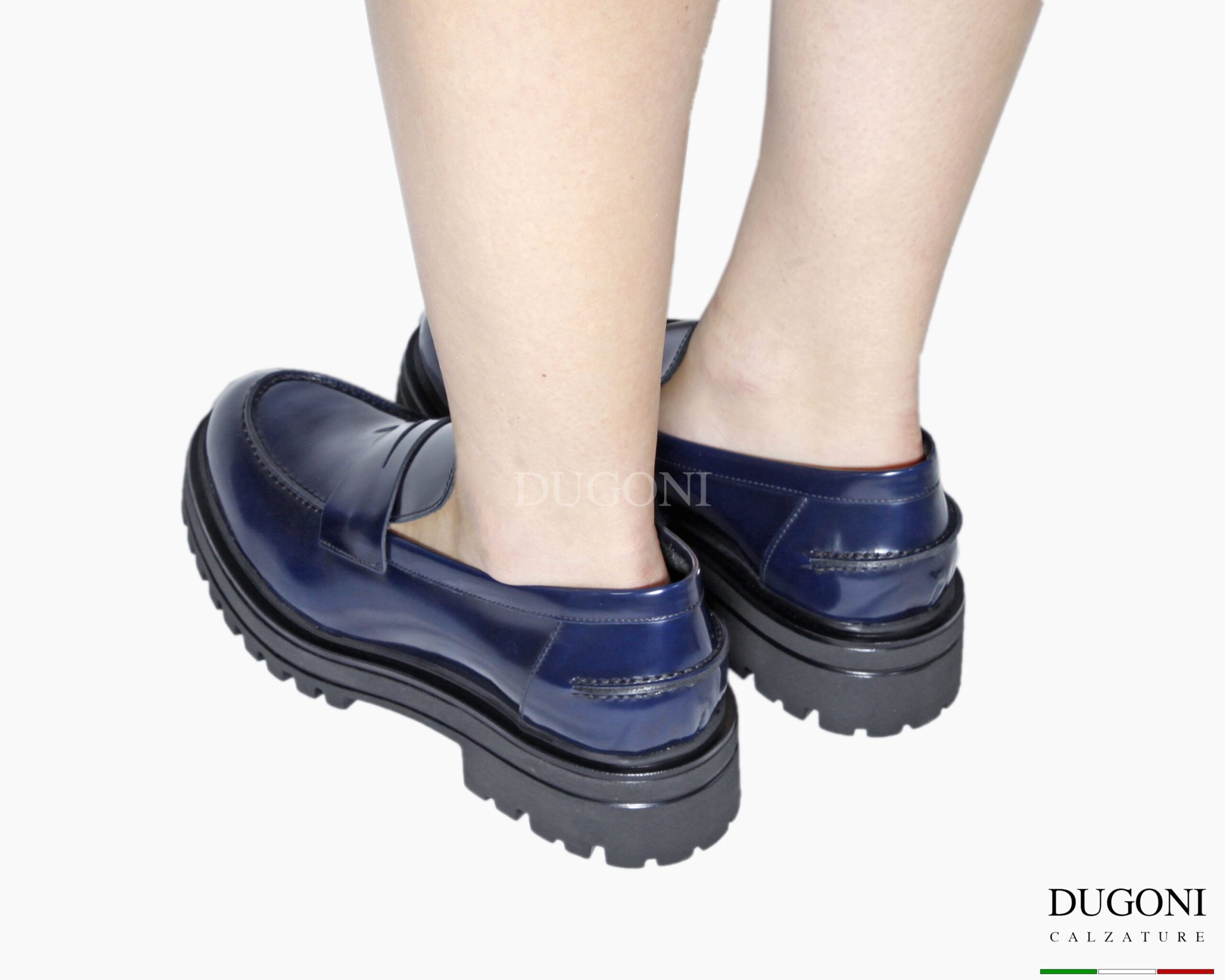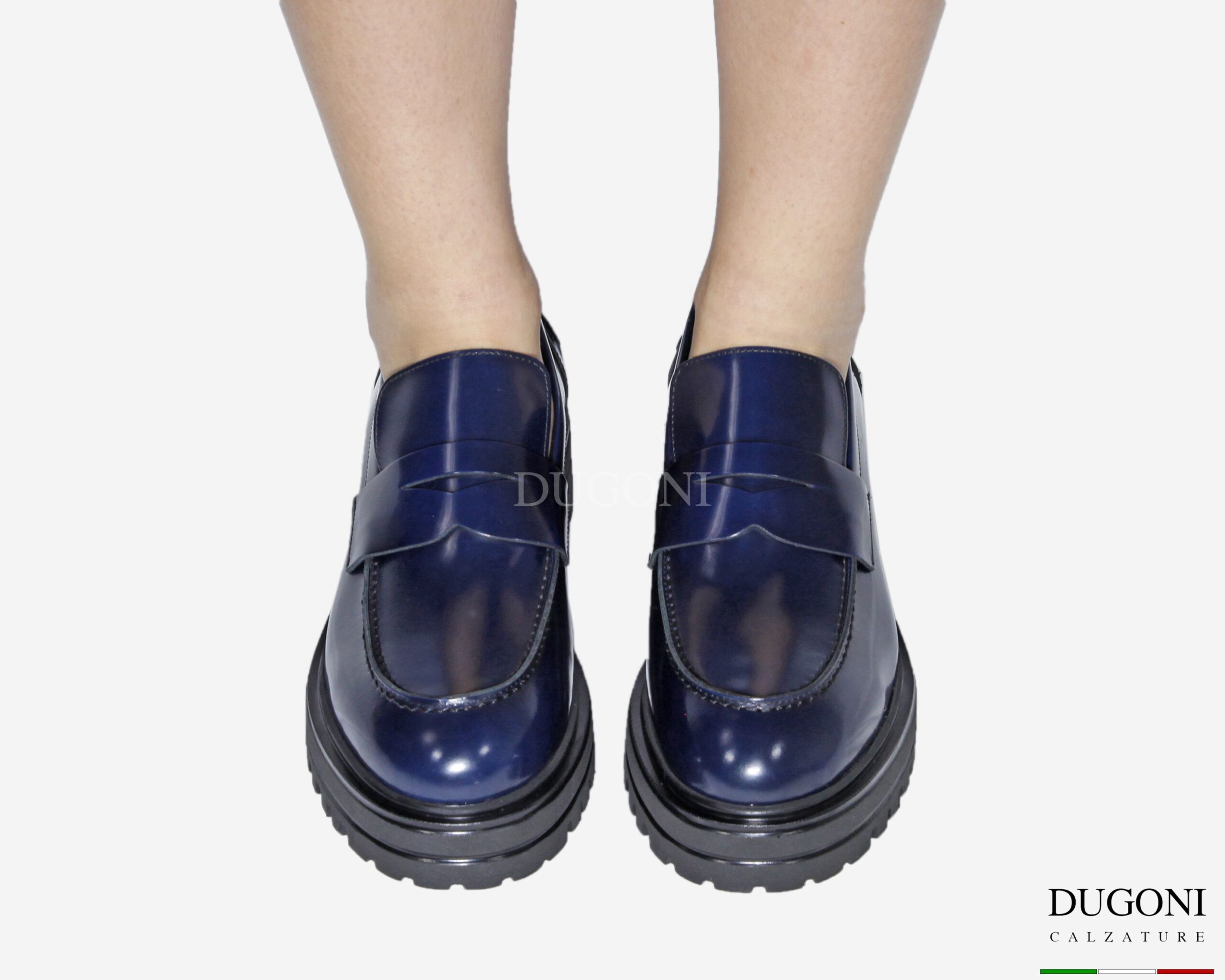 Mocassino in pelle abrasivata blu . Suola in gomma Wellf-light
