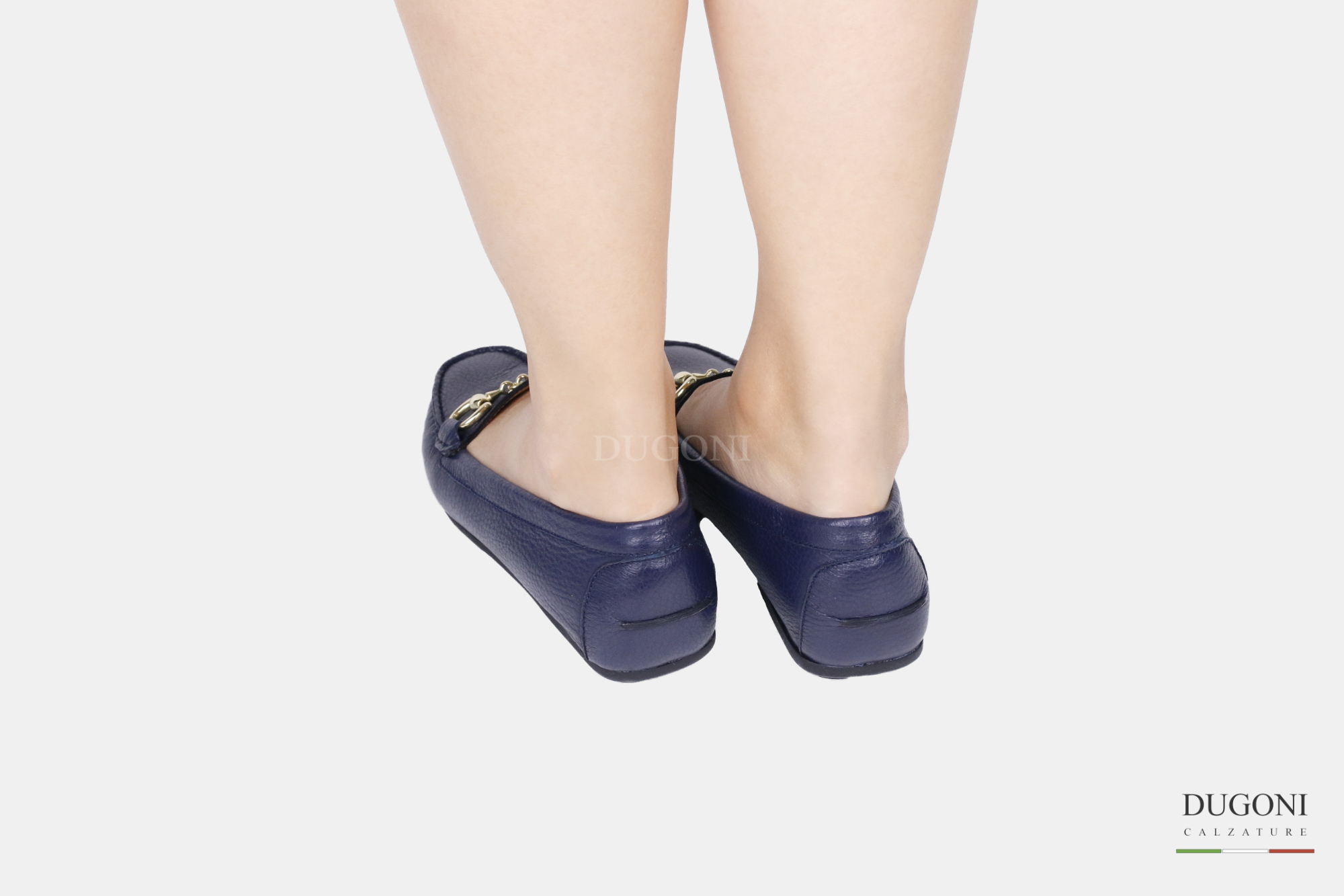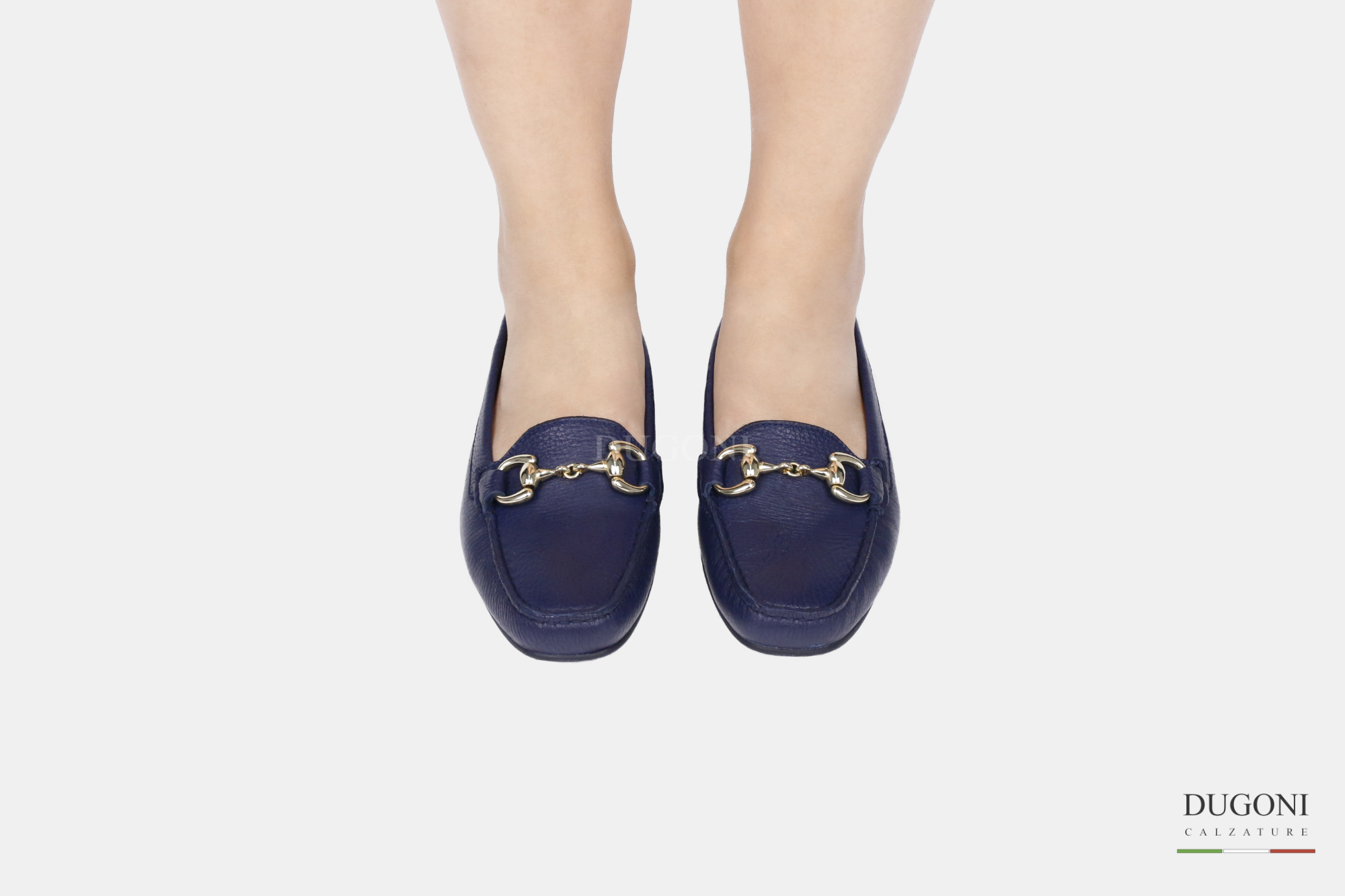 Mocassino in pelle di cervo morbida blu con accessorio color oro. Fondo in gomma morbida cucita.