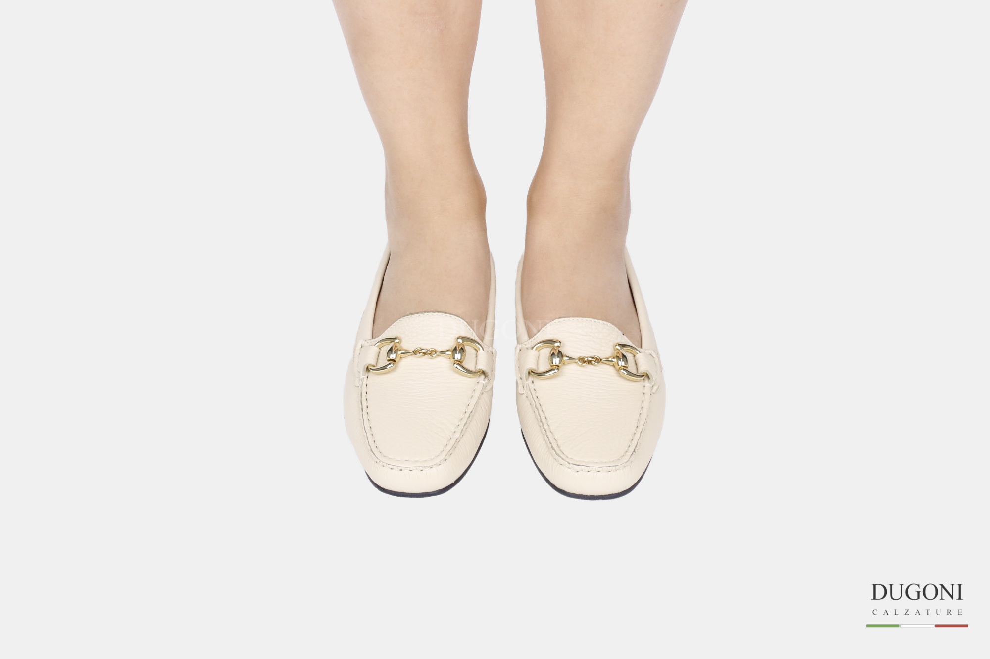 Mocassino in pelle di cervo morbida beige chiaro con accessorio color oro. Fondo in gomma morbida cucita.