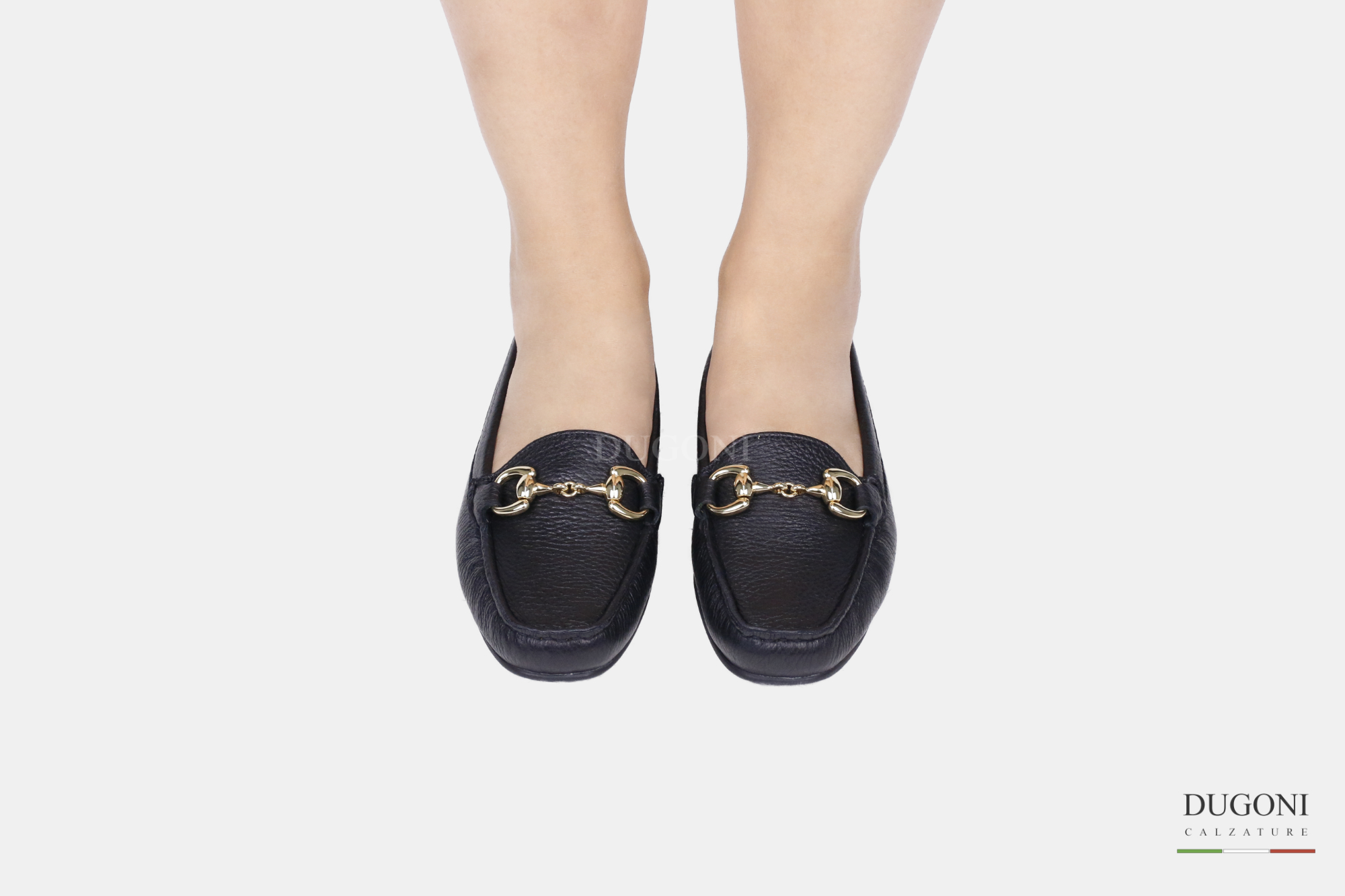 Mocassino in pelle di cervo morbida nera con accessorio color oro. Fondo in gomma morbida cucita.