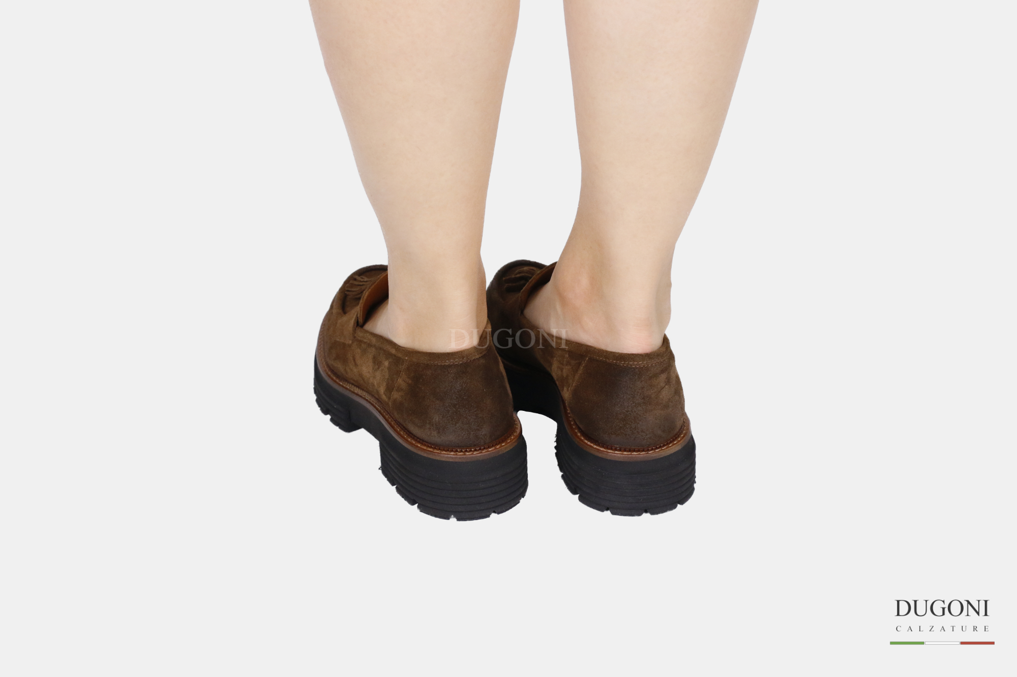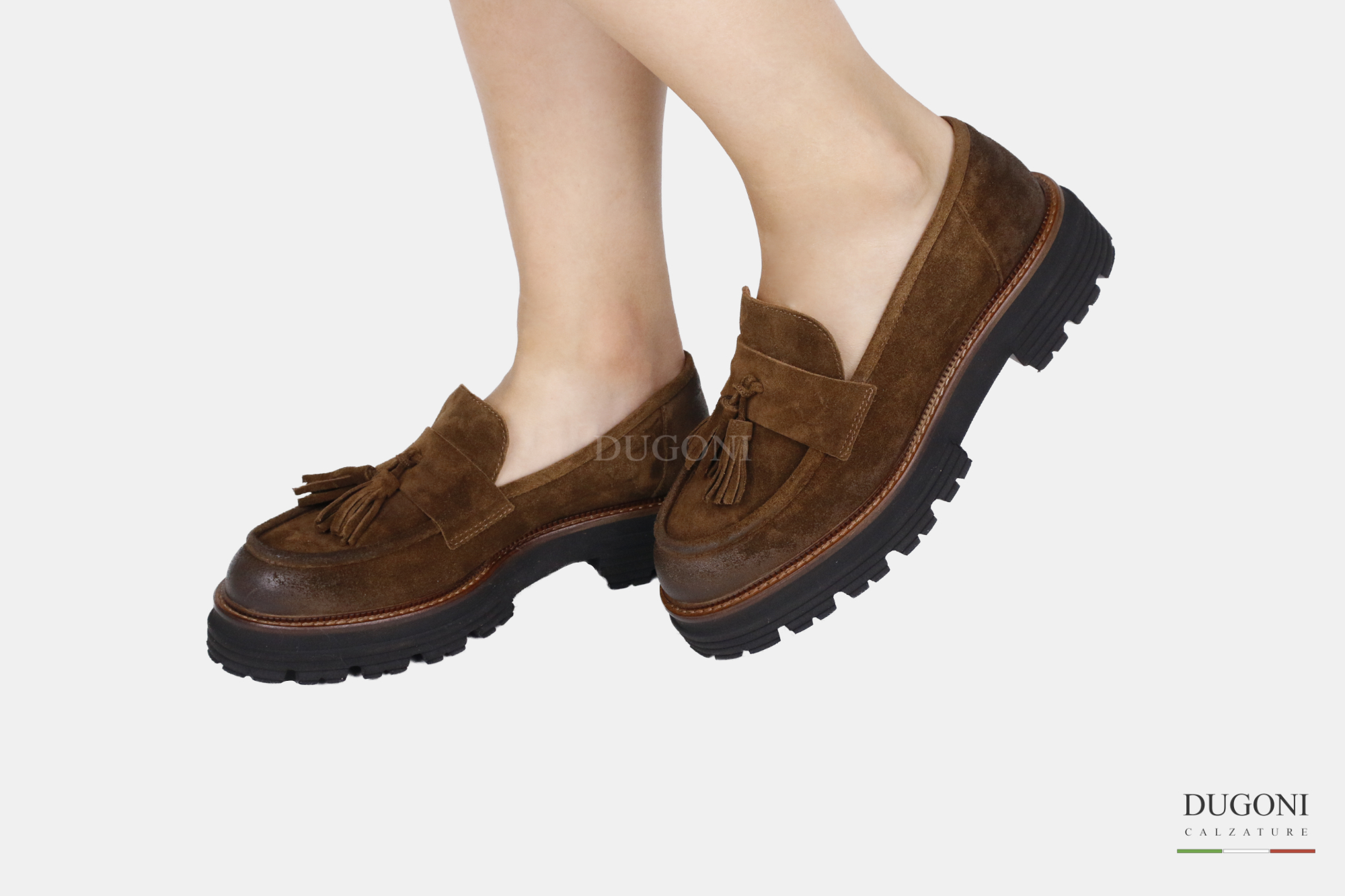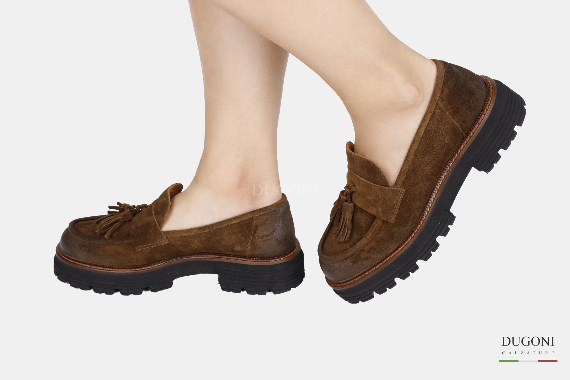 Mocassino in pelle scamosciata marrone vintage con nappine. Guardolo in cuoio cucito, suola in gomma carrarmato ExtraLight.