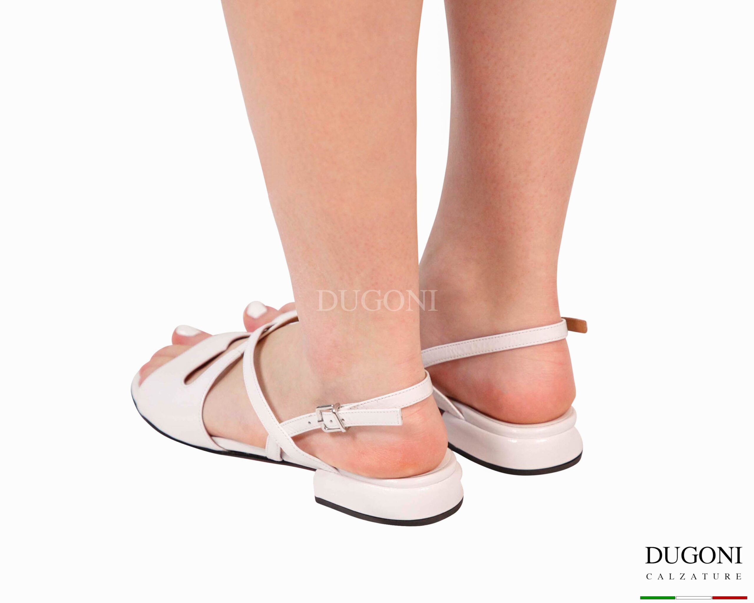 Sandalo in pelle verlux bianco  con cinturino regolabile. Tacco 20mm  ricoperto in tinta. Suola in cuoio.