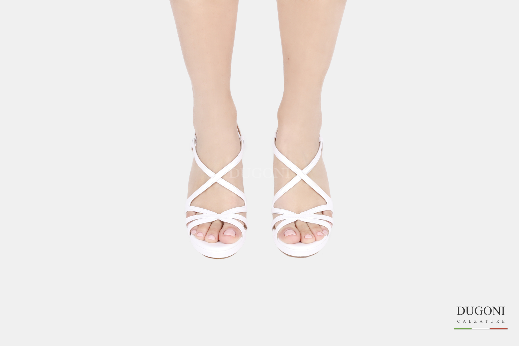 Sandalo mignon  in pelle bianca, con cinturini cuciti in tinta a unico taglio con incrocio libero sul collo piede. Fibbia in metallo color argento 15 mm .