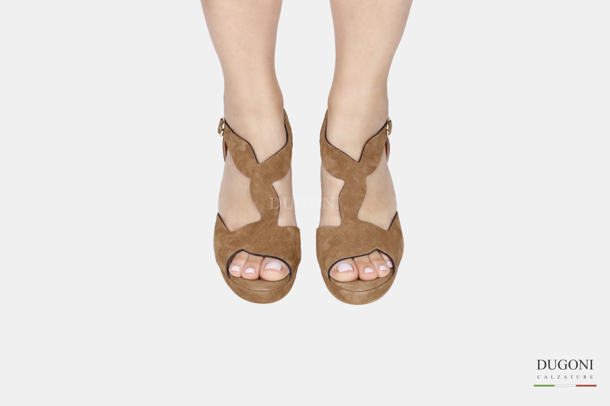 Sandalo in camoscio color marrone seppia con plateau e cinturino regolabile. Tacco largo e ricoperto in tinta.