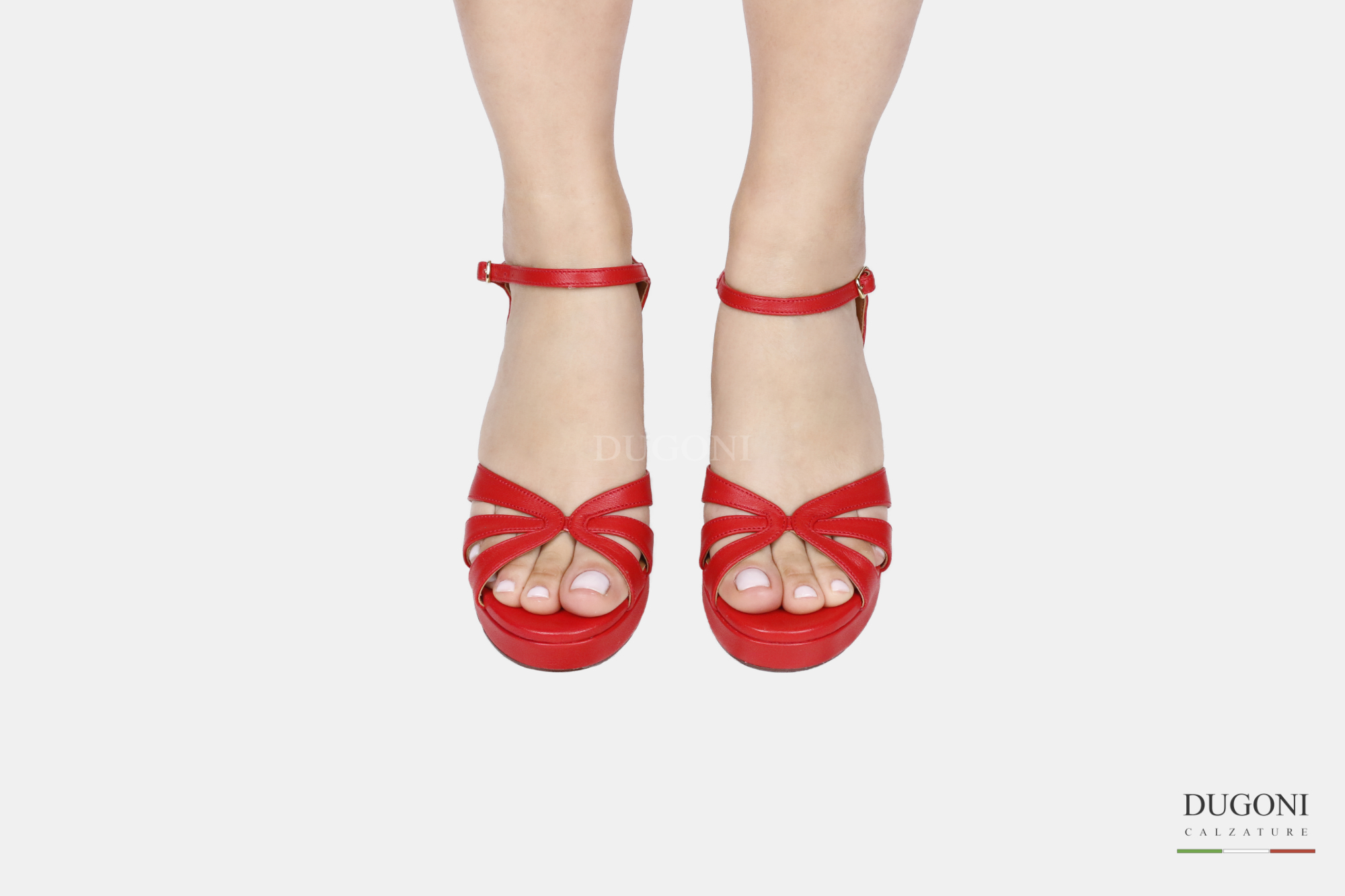 Sandalo in pelle rosso con plateau e cinturino regolabile. Tacco ricoperto in tinta.