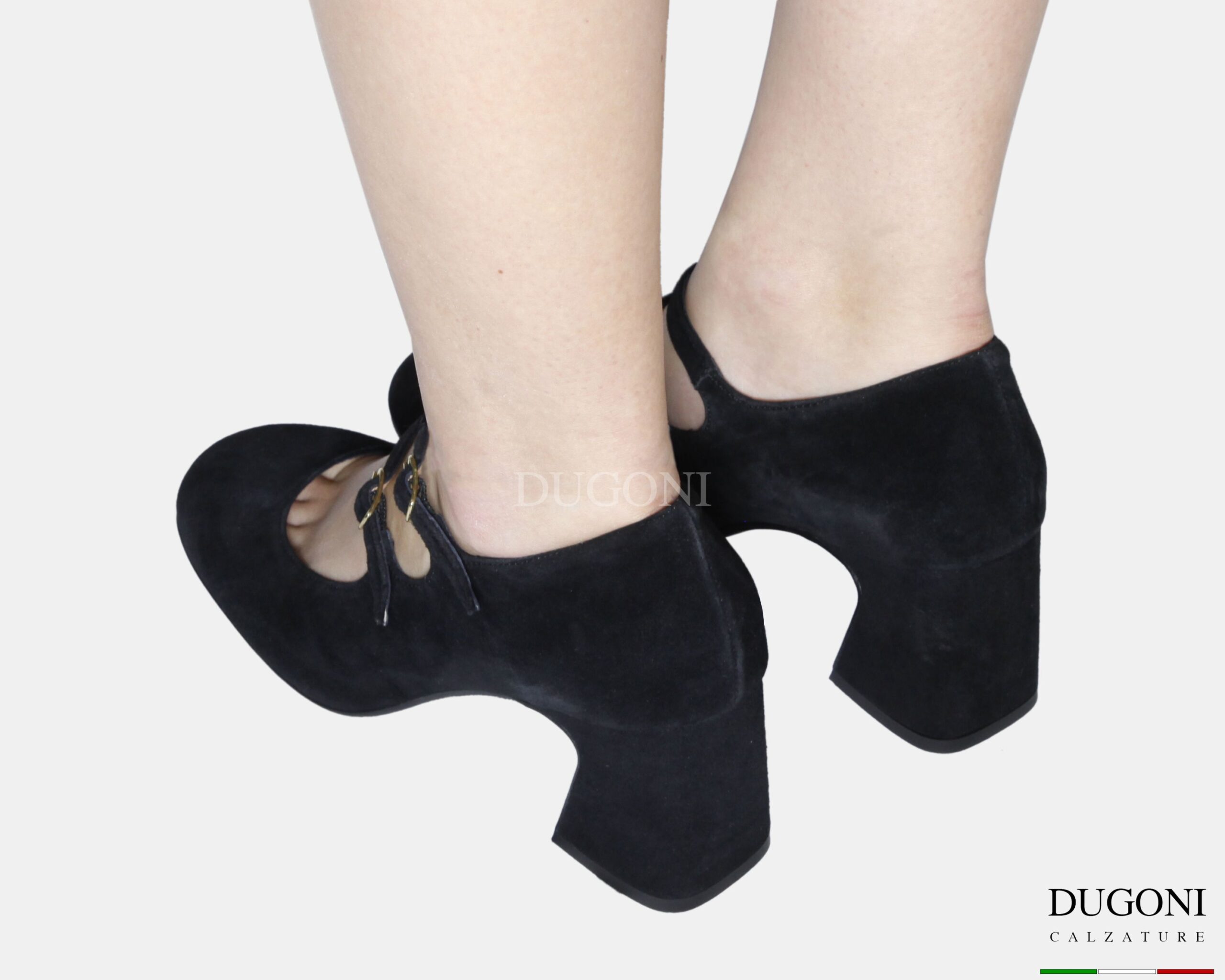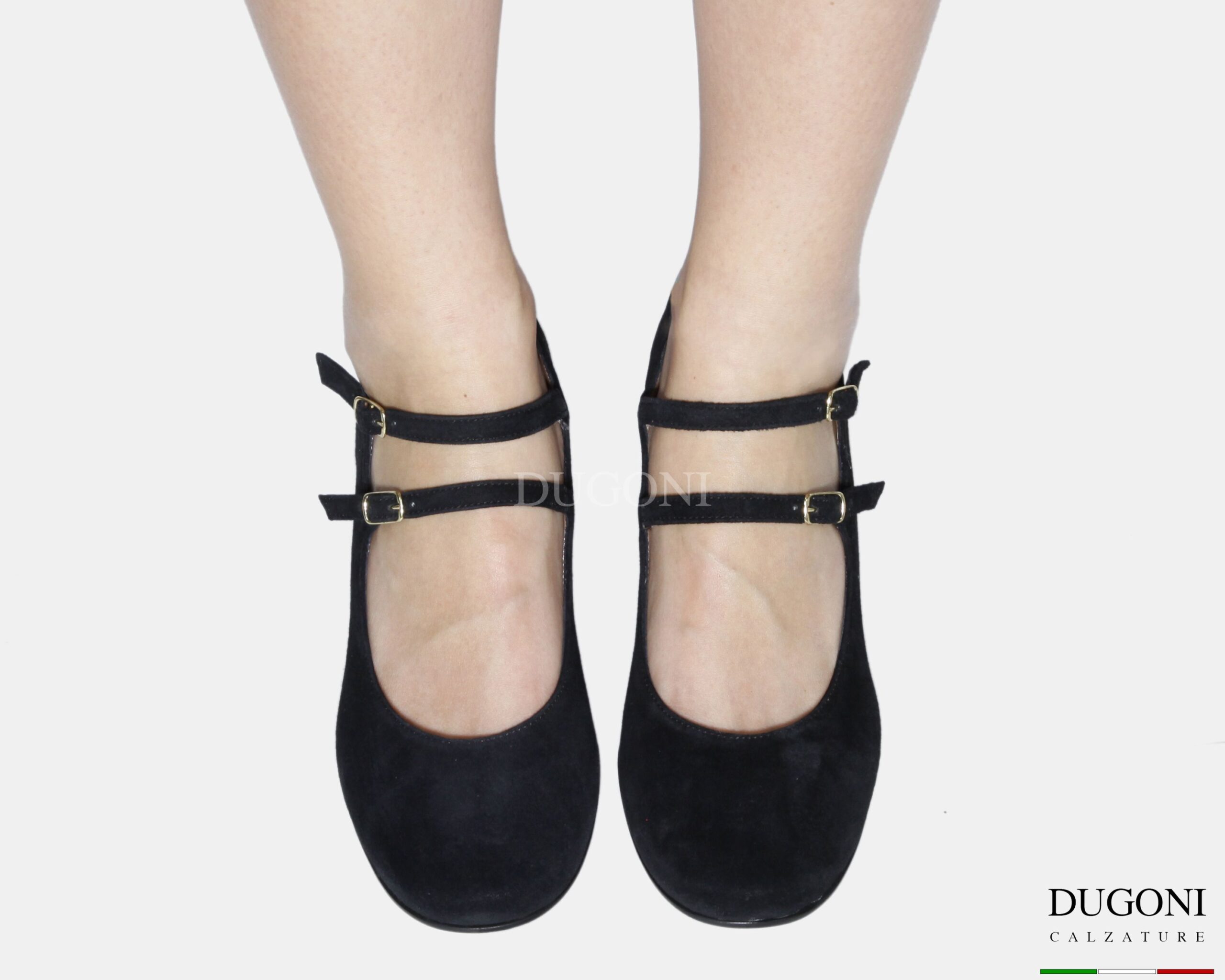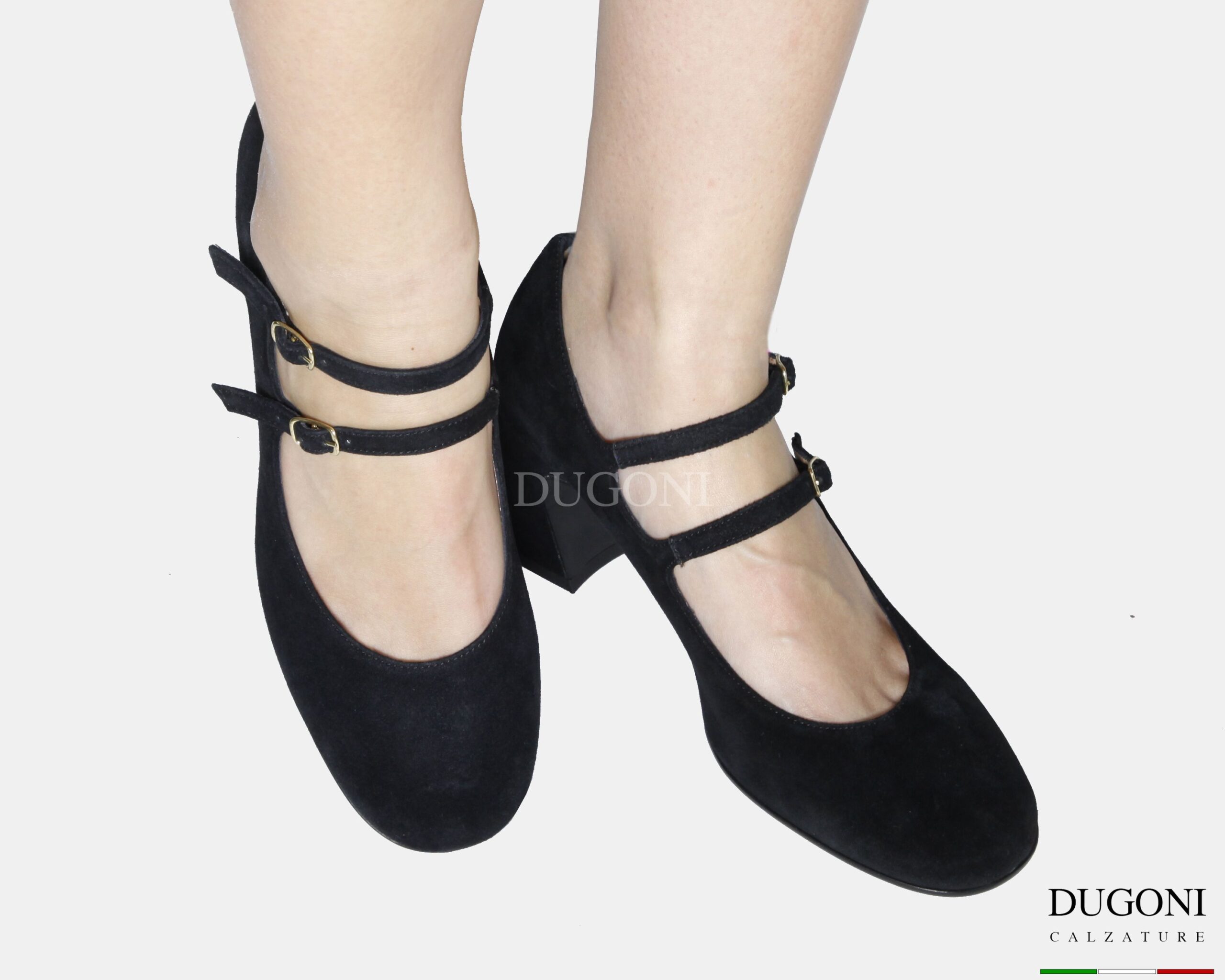 Mary Jane in camoscio nero con  doppi cinturini regolabili e con elastico. Fibbiette dorata . Tacco a coda svasato.