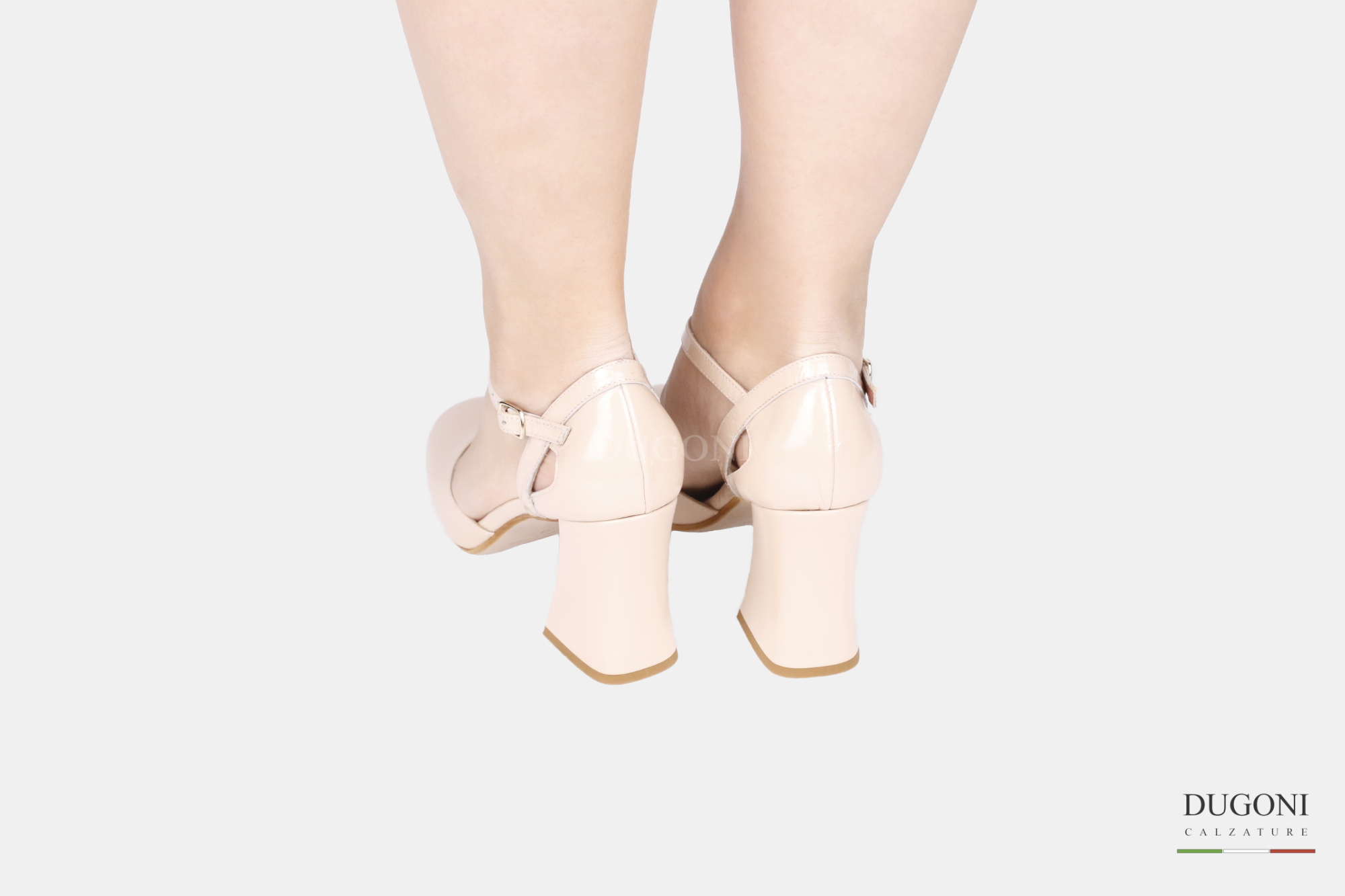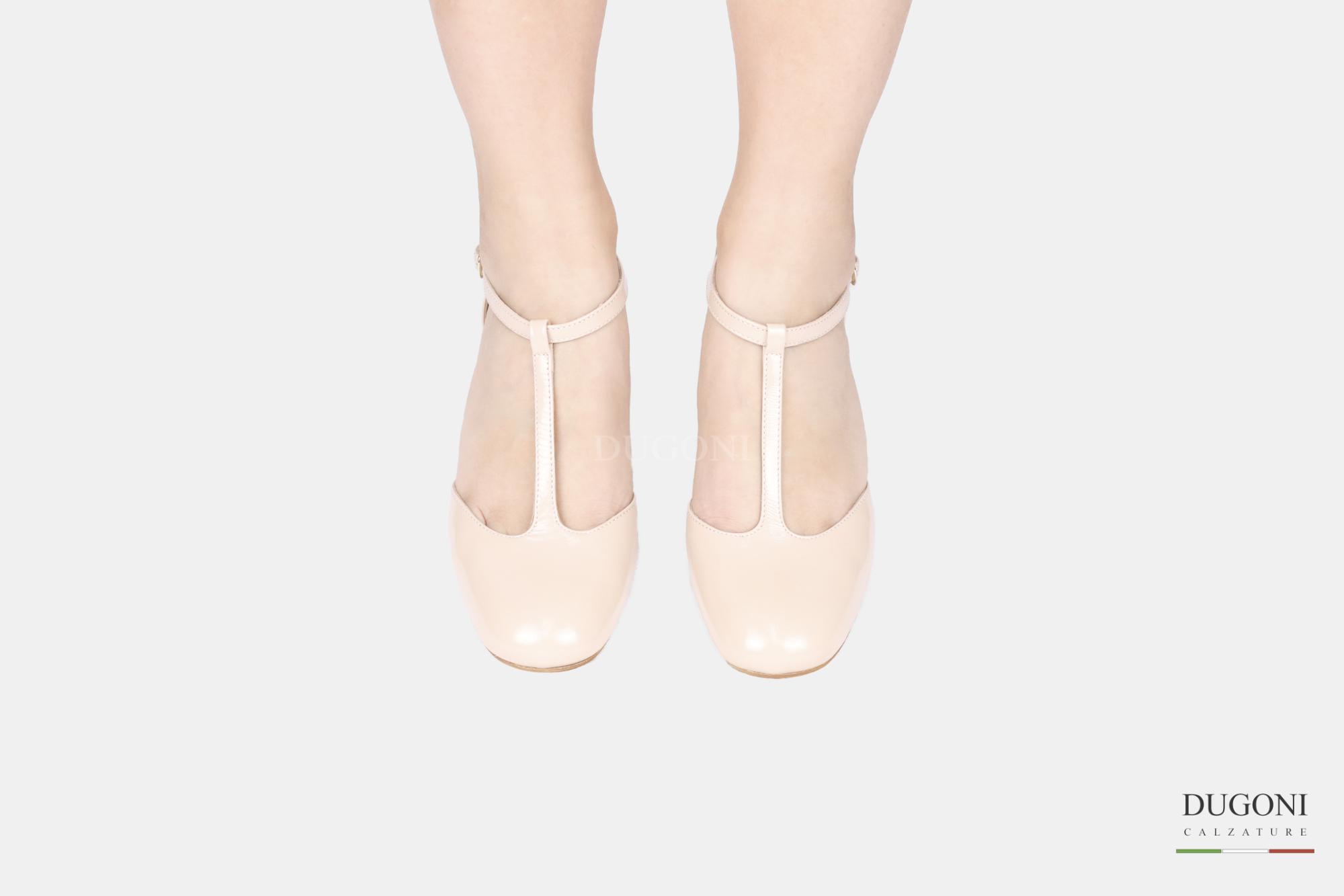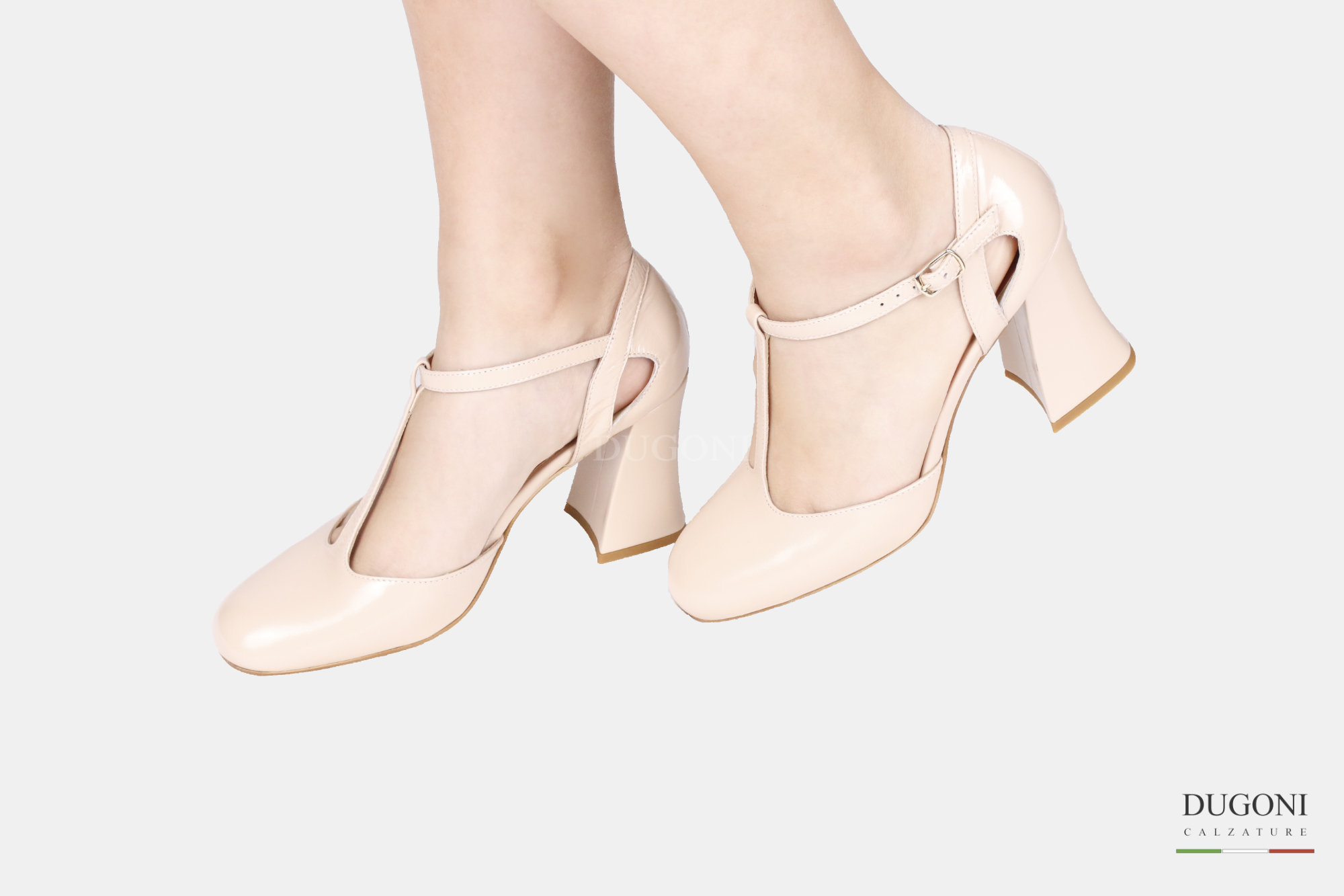Décolleté in naplak beige, cinturino a T . Tacco svasato ricoperto in tinta.