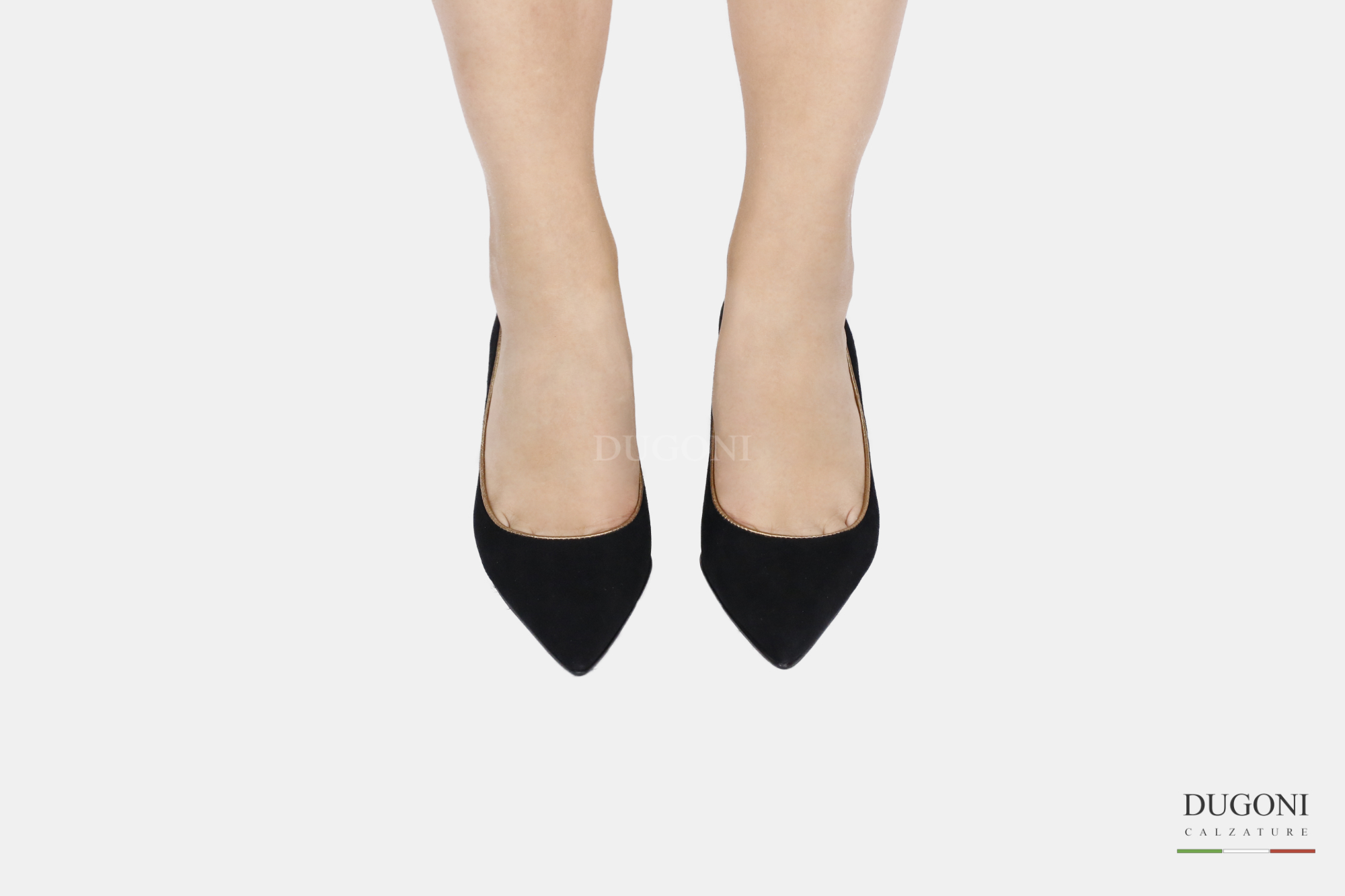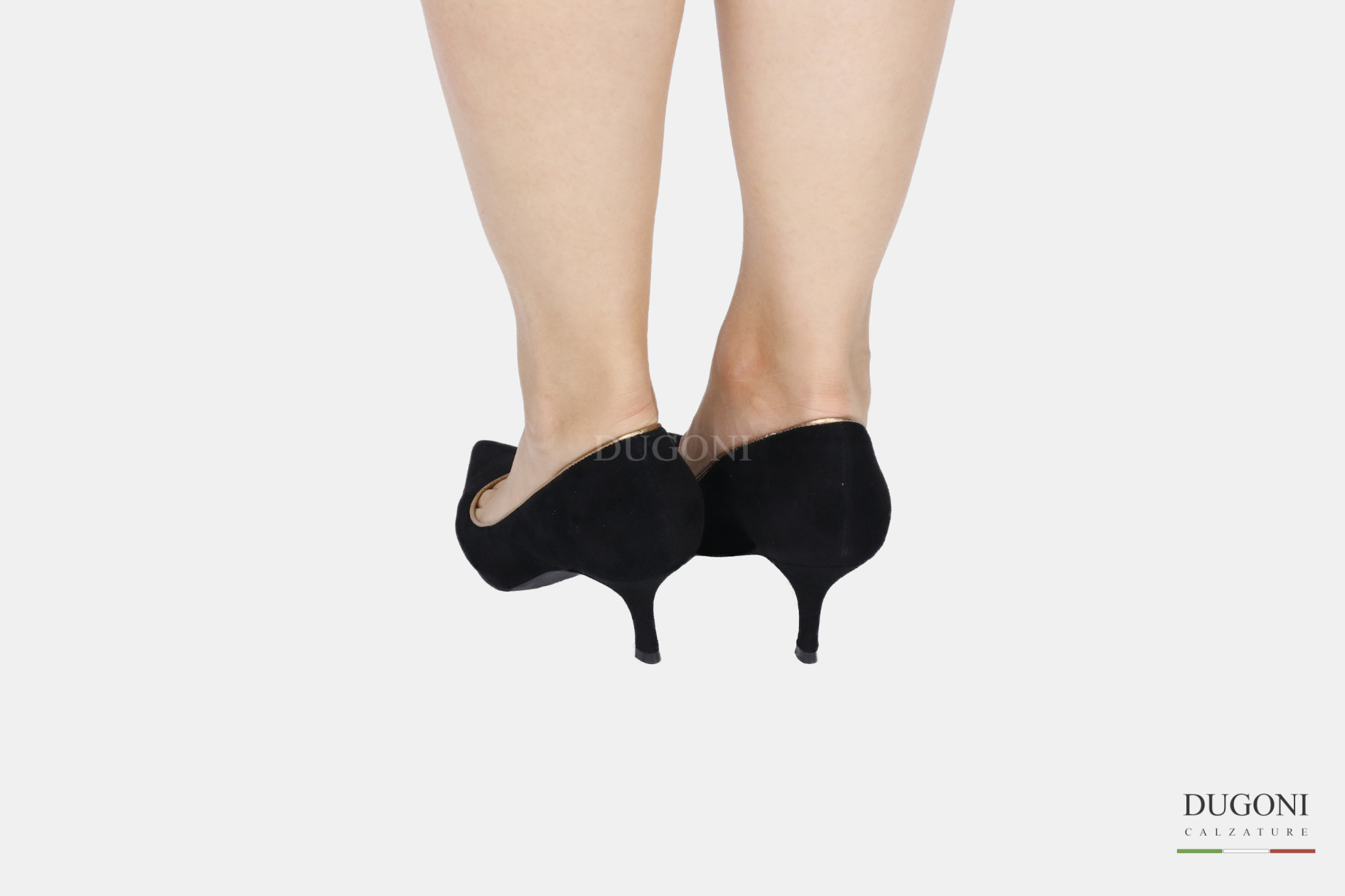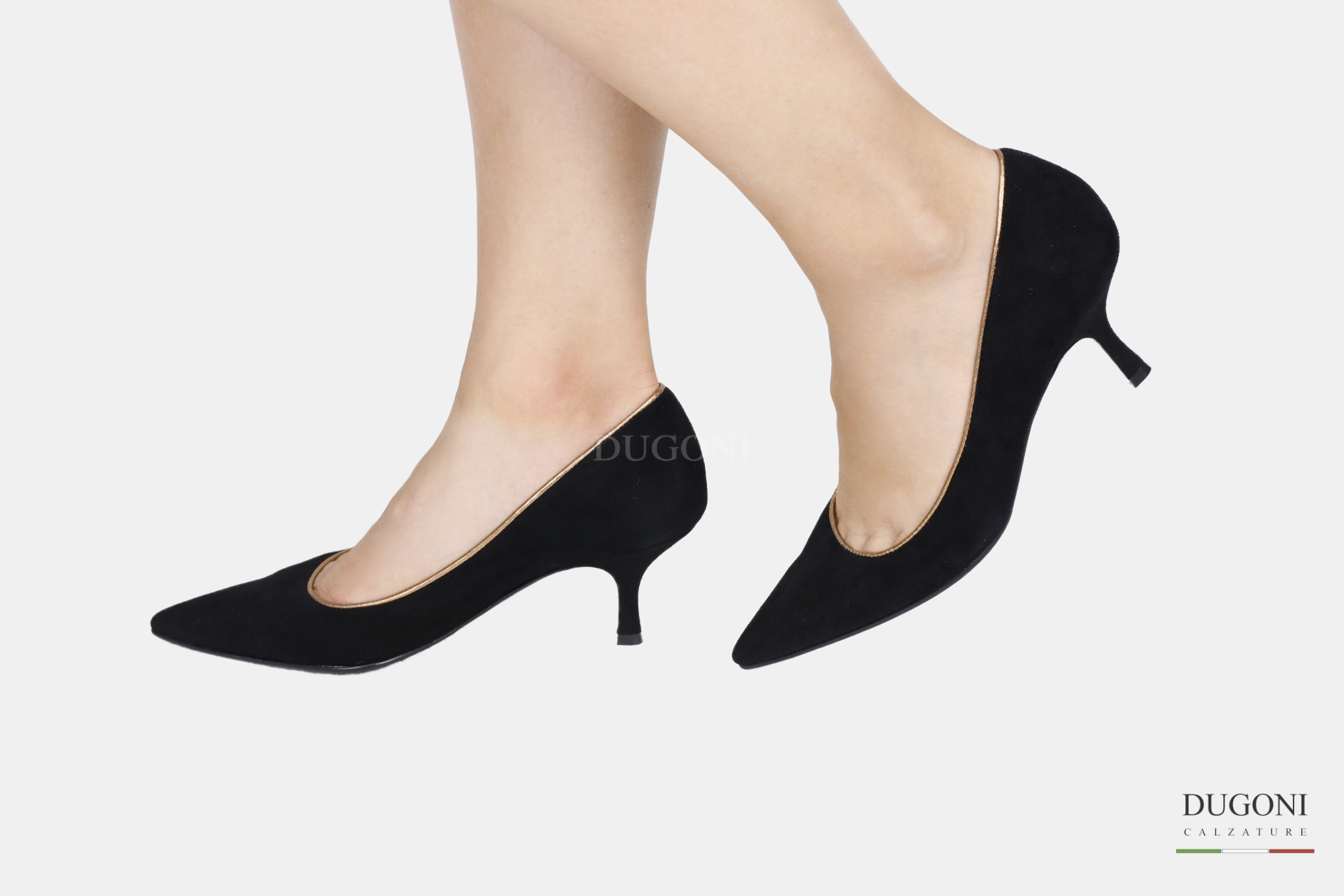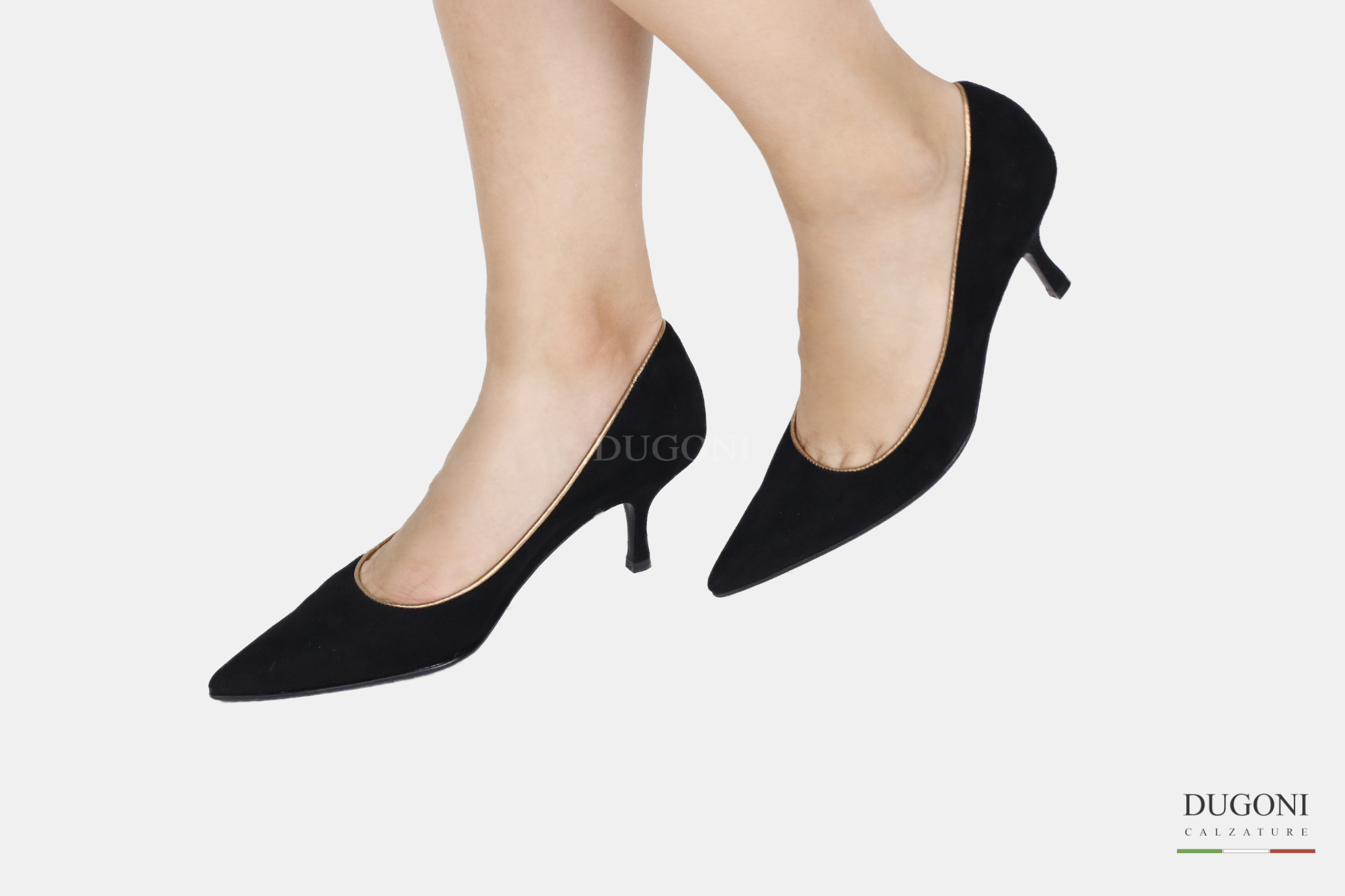 Décolleté in camoscio nero con profilo dorato . Lavorazione a sacchetto. Suola in cuoio con mezza gomma, tacco ricoperto in tinta.