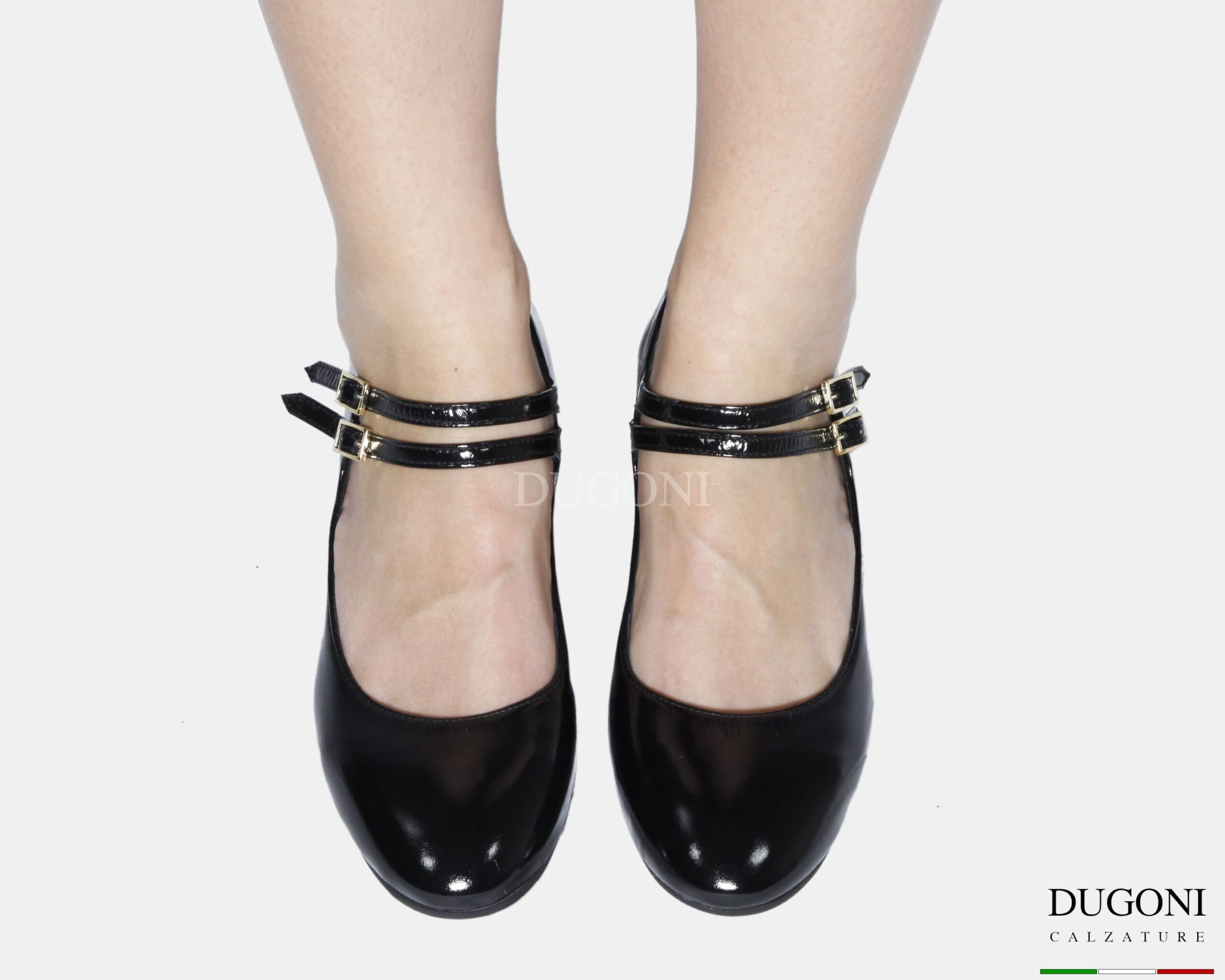 Mary Jane in naplak nero, *lavorazione a sacchetto con cinturini regolabili ed elastico. Fibbiette dorata . Tacco ricoperto in tinta, suola gomma.