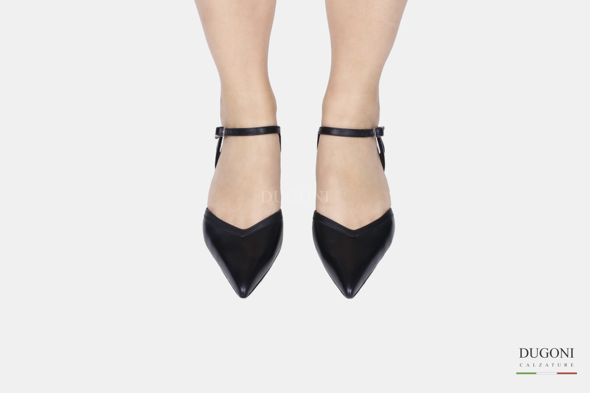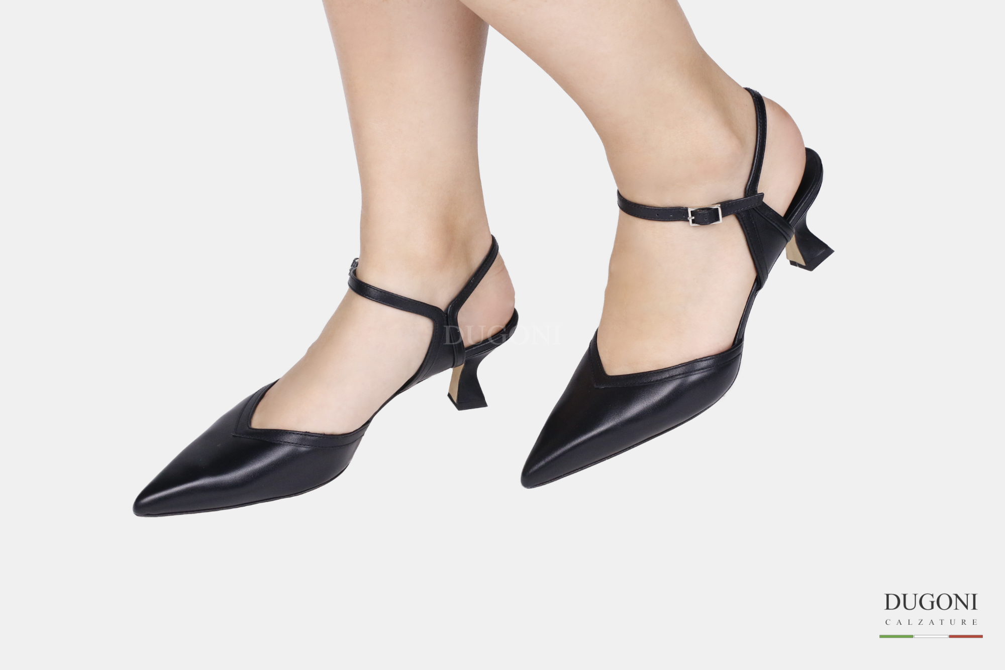 Mary Jane con scollo a cuore in pelle nera e cinturino regolabile. Tacco a rocchetto ricoperto in tinta.