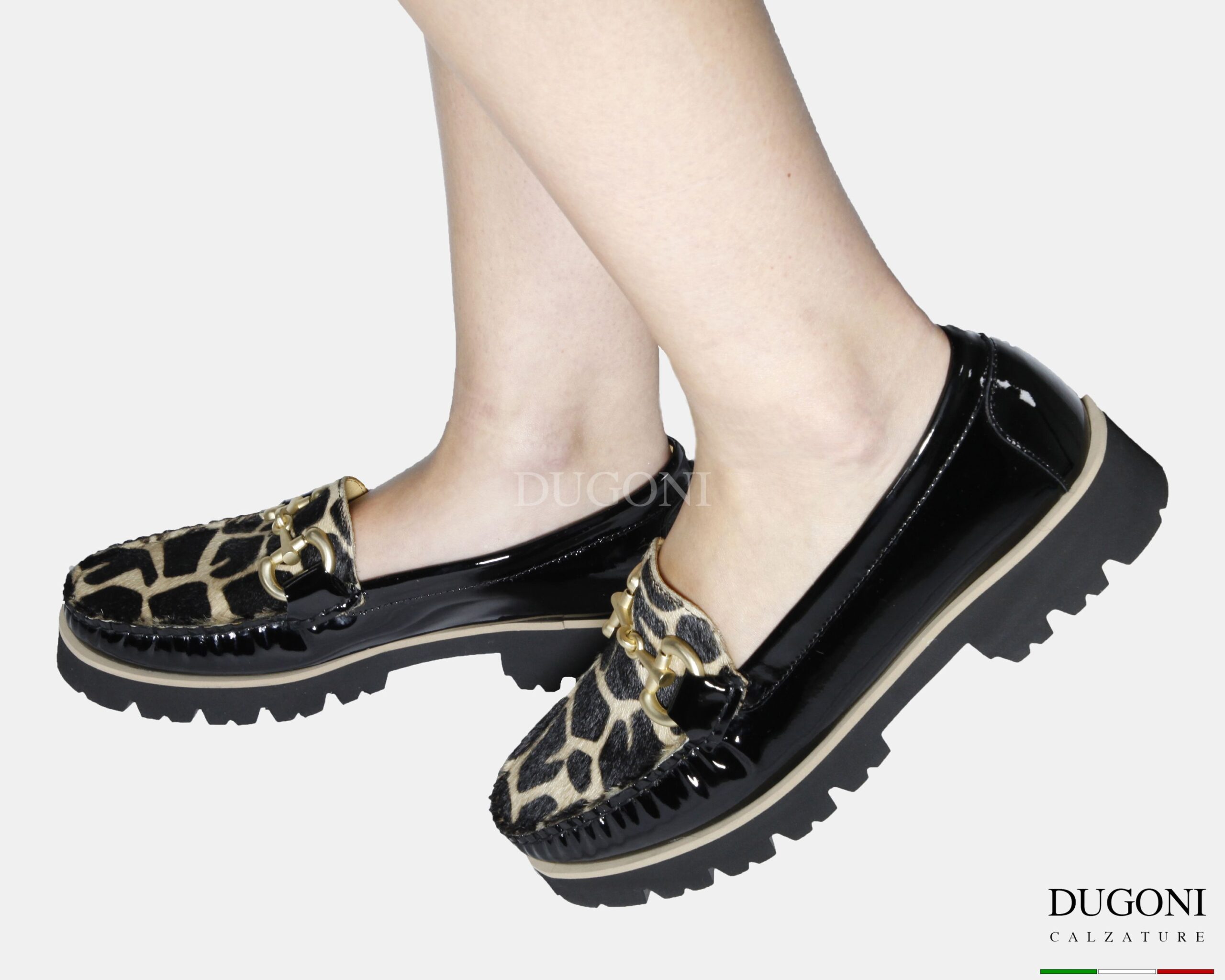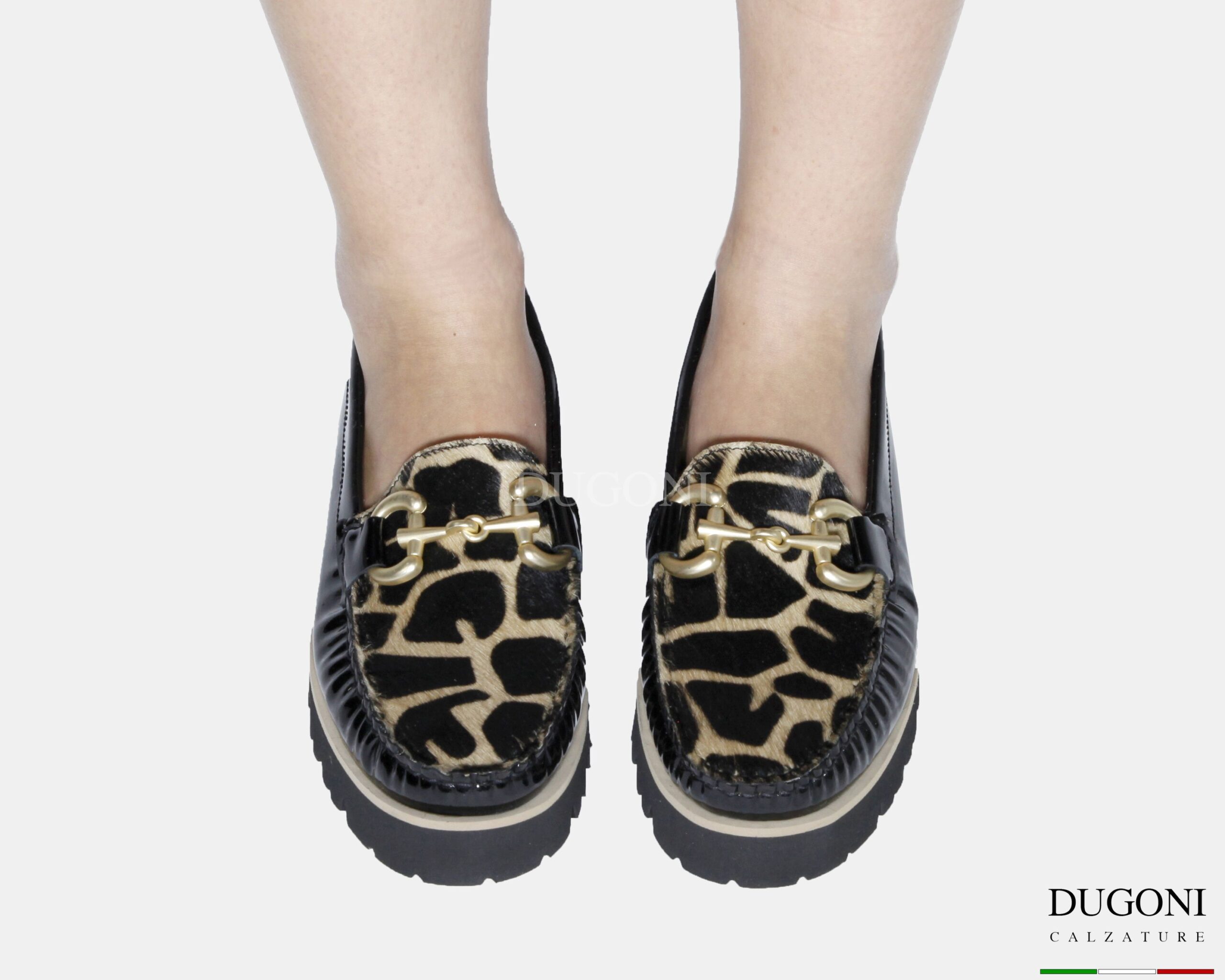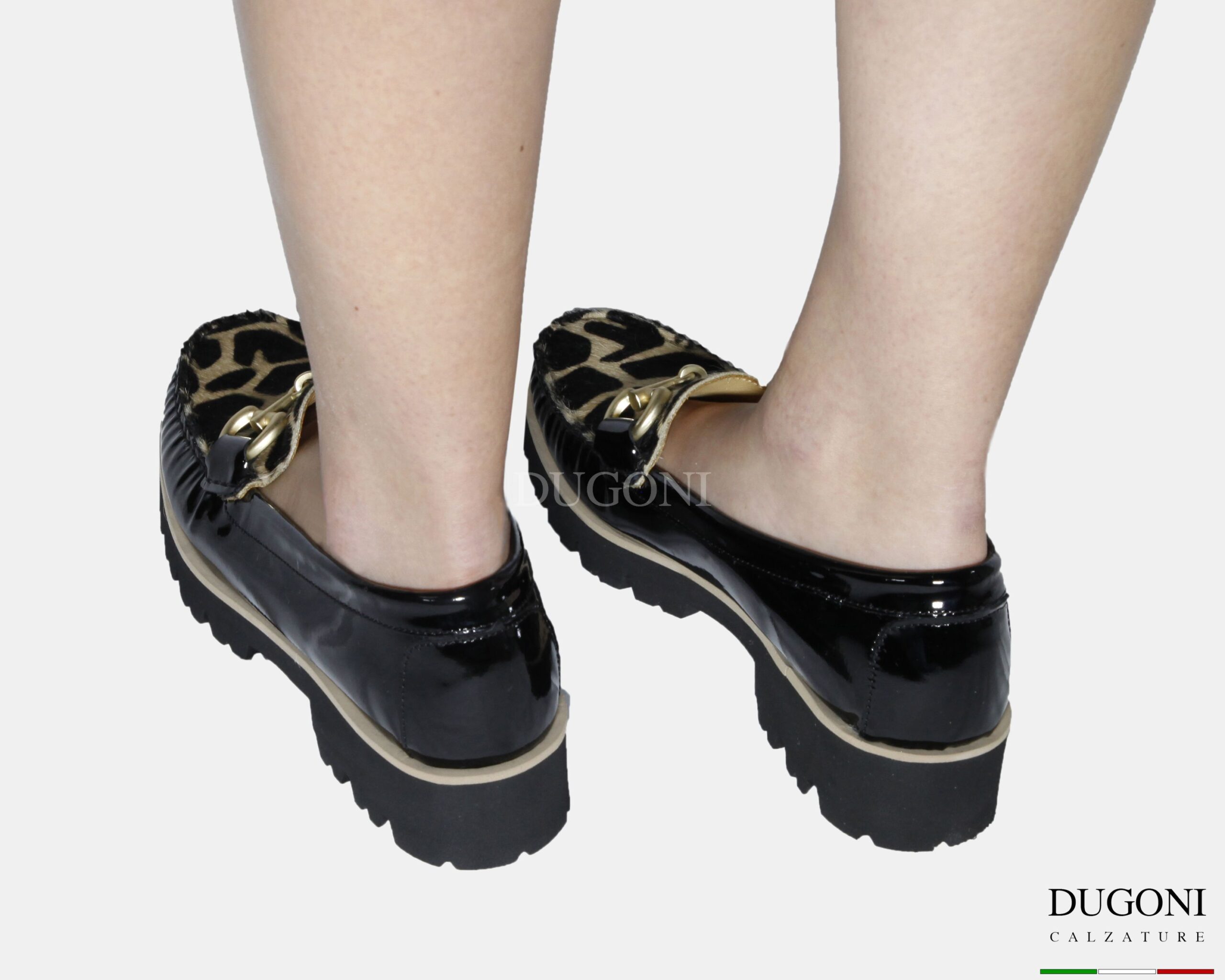 Mocassino in vernice nera , animalier in cavallino con accessorio dorato satinato. Suola carrarmato in extralight con profilo beige.