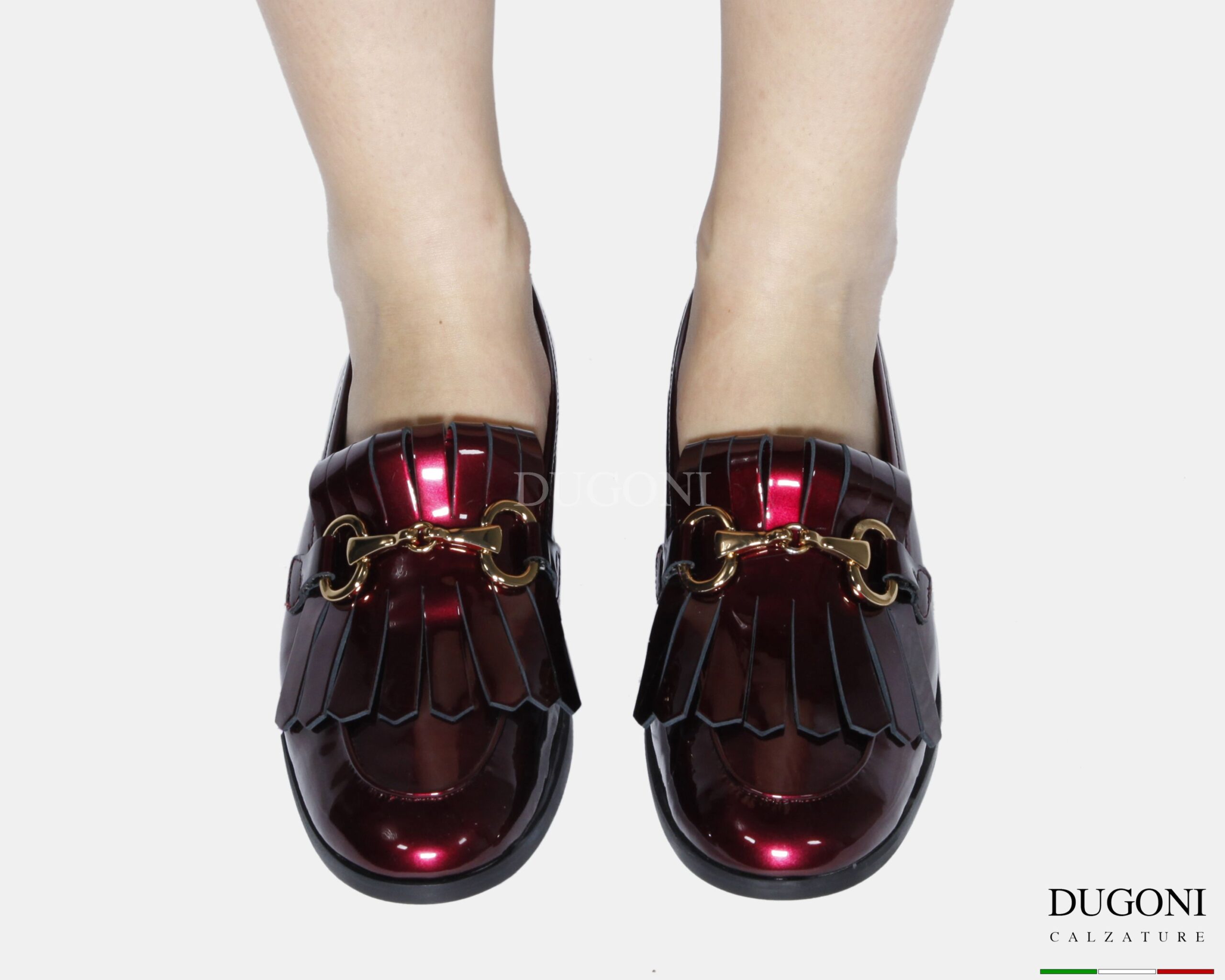 Mocassino in vernice galassia bordeaux, frangia in tinta e accessorio bronzo. Tacco cuoio, suola in gomma.