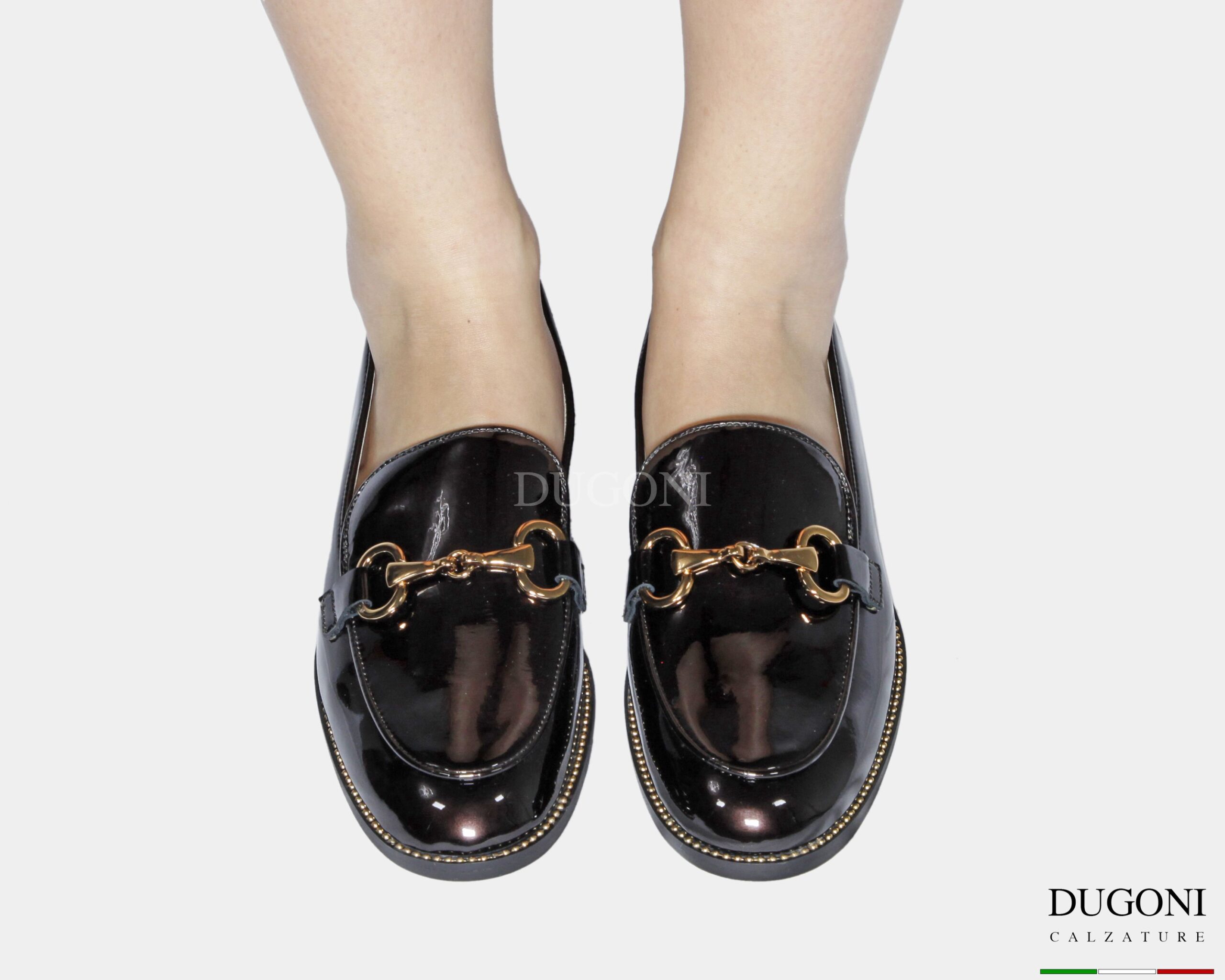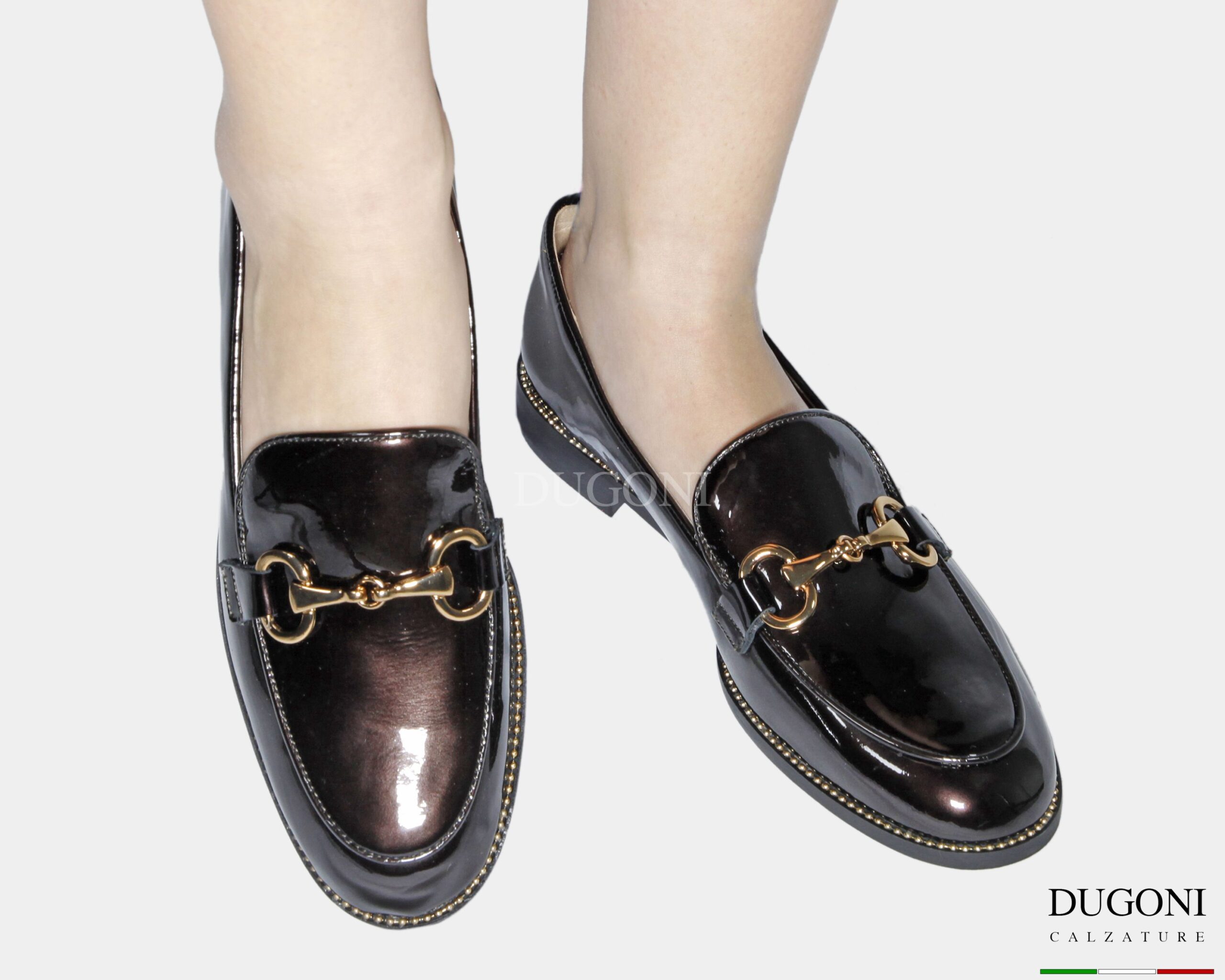Mocassino catenella in vernice galassia marrone con accessorio bronzo. Catenella dorata sul profilo. Tacco cuoio, suola in gomma.