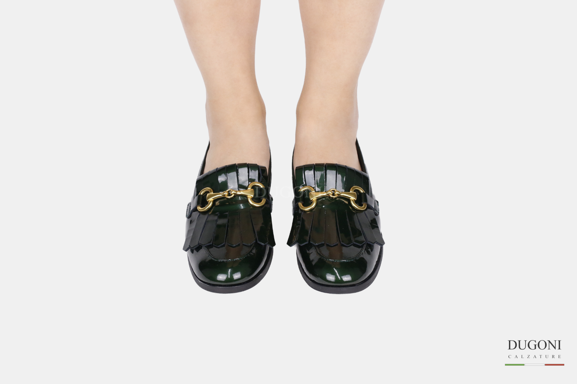 Mocassino in vernice galassia verde con frangia e accessorio dorato . Tacco in cuoio, suola in gomma .