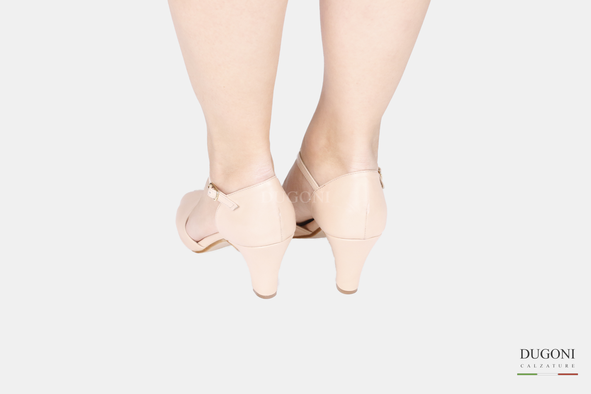 Mary Jane in pelle beige, spuntata con cinturino a T . Cinturino e profili in verlux beige .