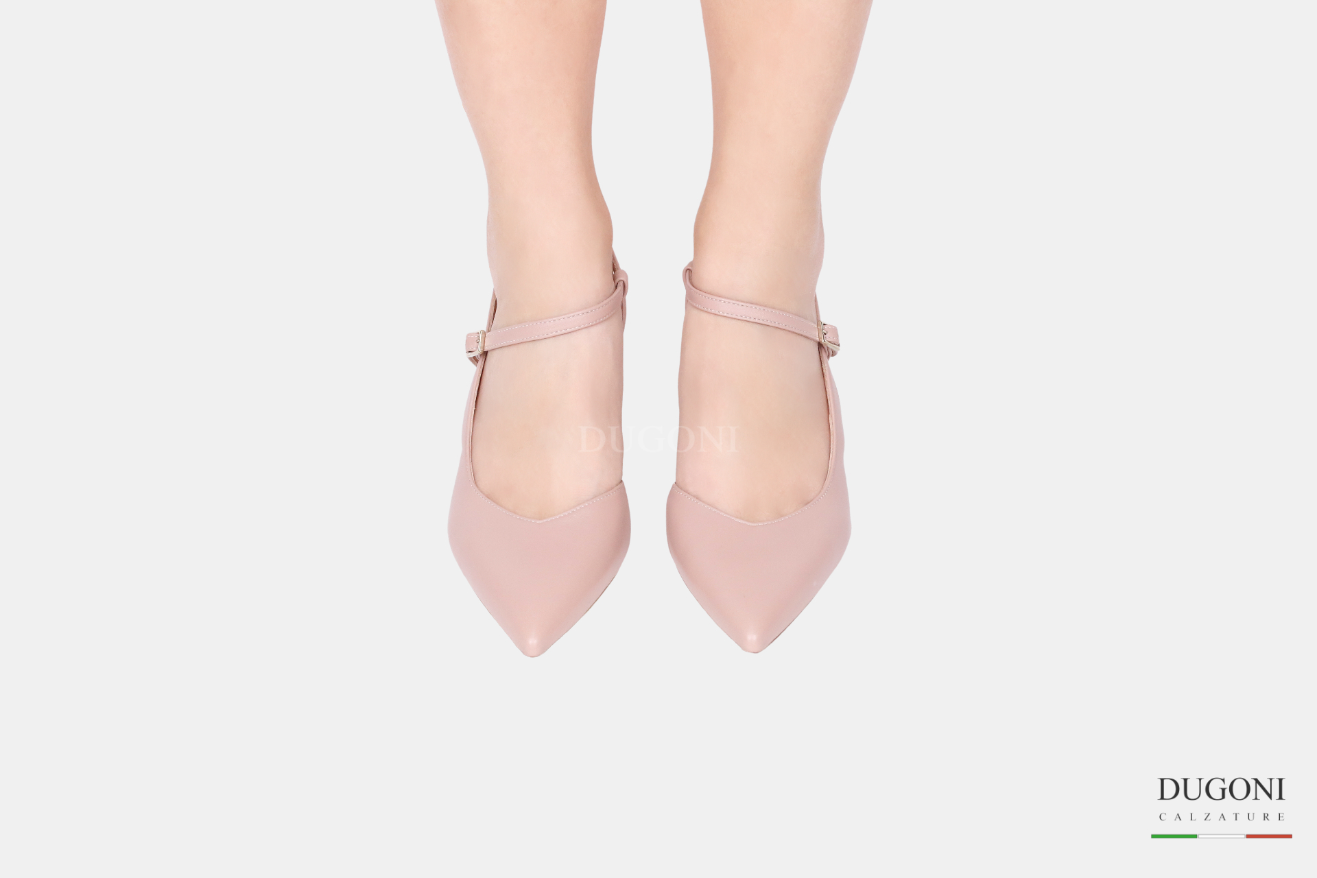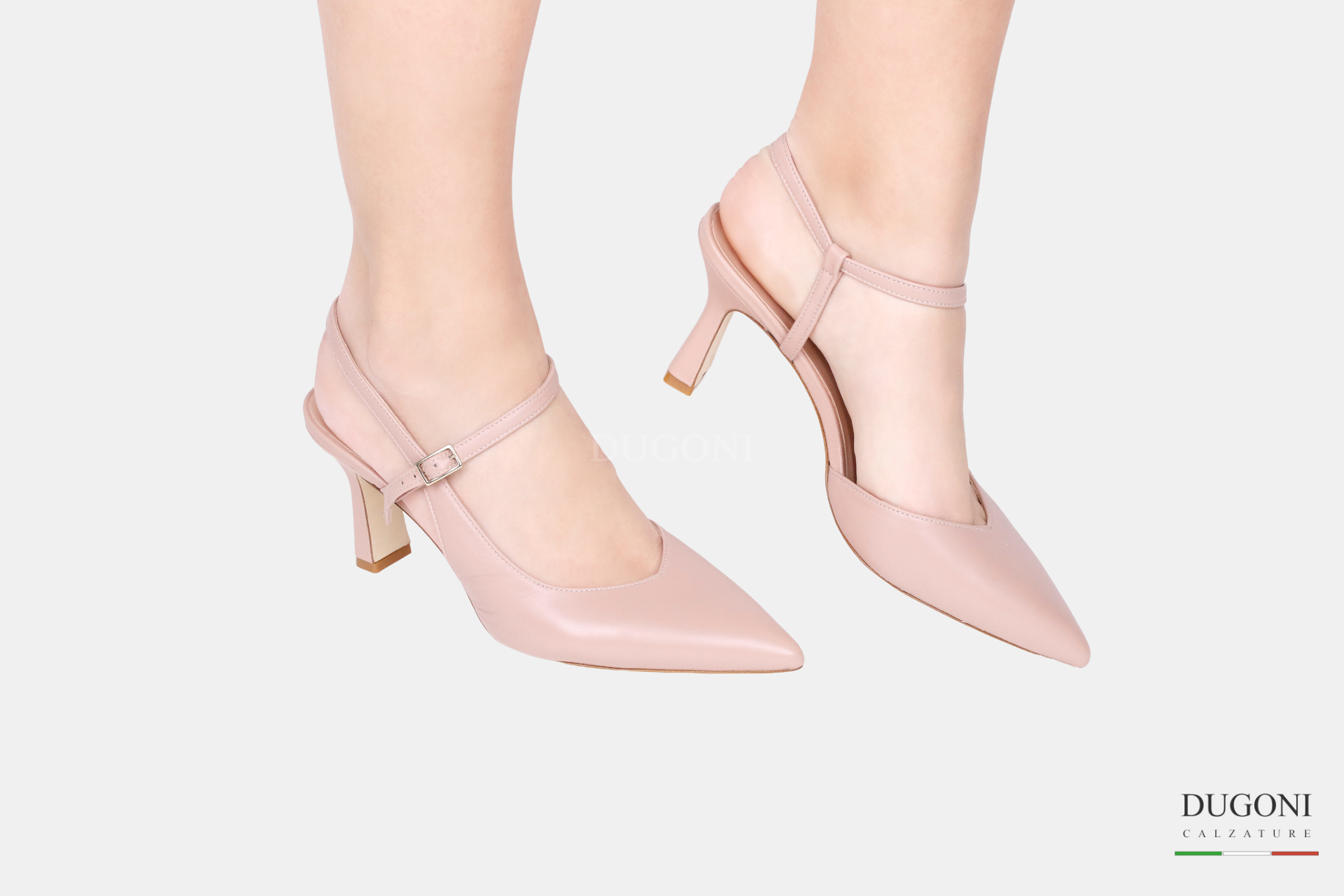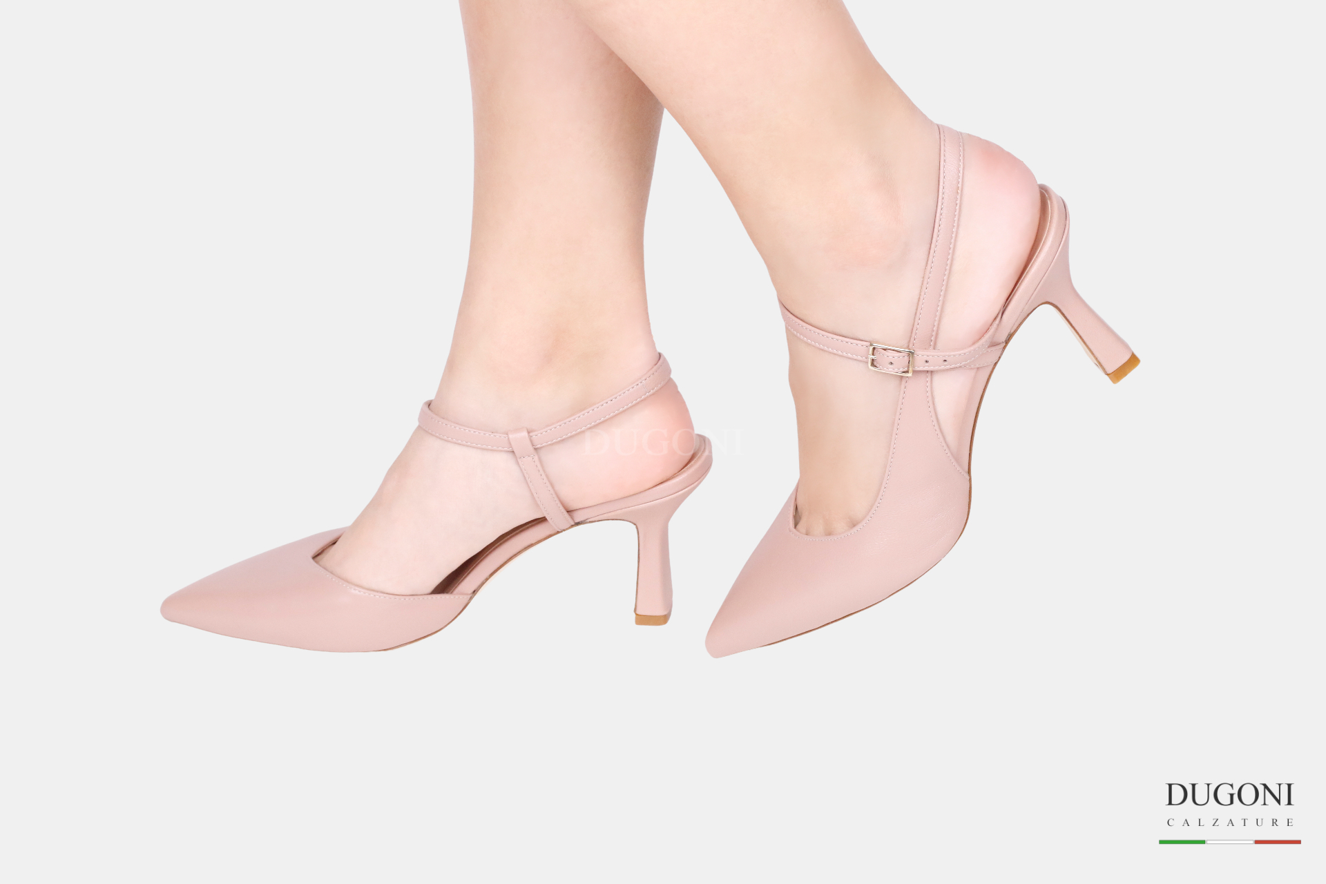 Slingback con forma sfilata in pelle morbida colore cipria. Cinturino regolabile. Tacco rivestito e a rocchetto.