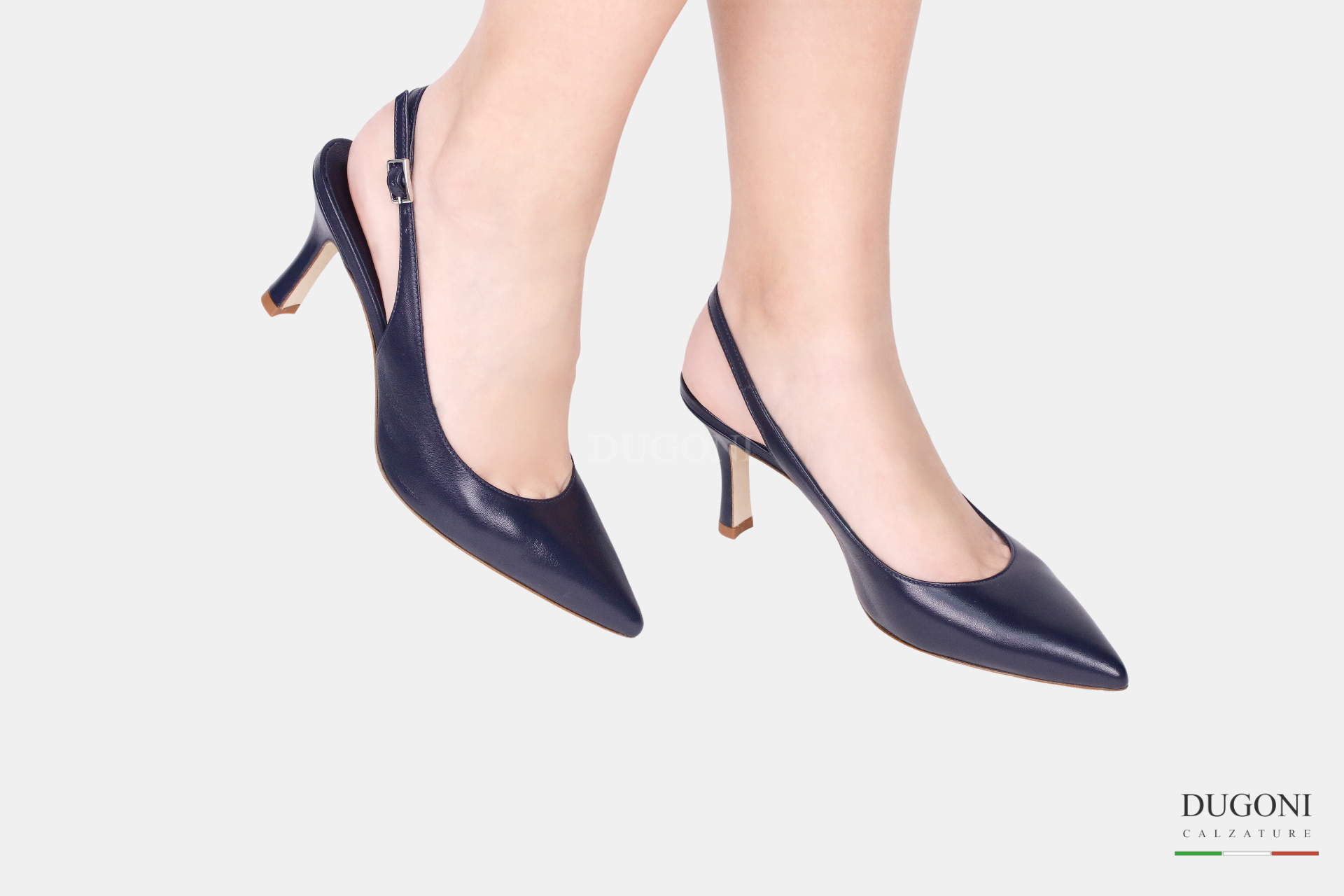 Slingback con forma sfilata in pelle morbida colore blu. Cinturino regolabile. Tacco rivestito e a stiletto.