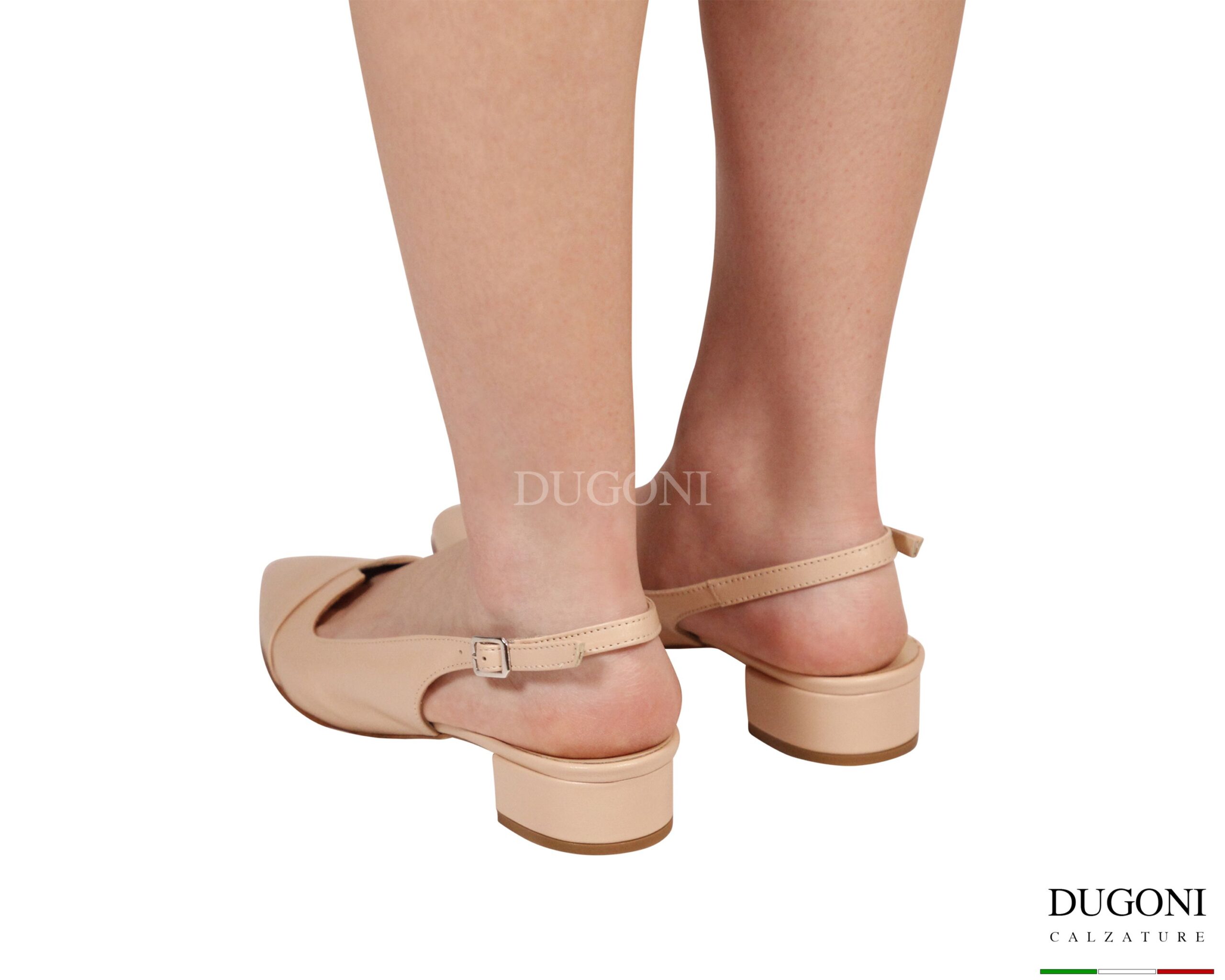 Sligback in pelle beige , con taglio a V sulla scollatura . Cinturino regolabile. Tacco mm 30 ricoperto in tinta. Suola in cuoio