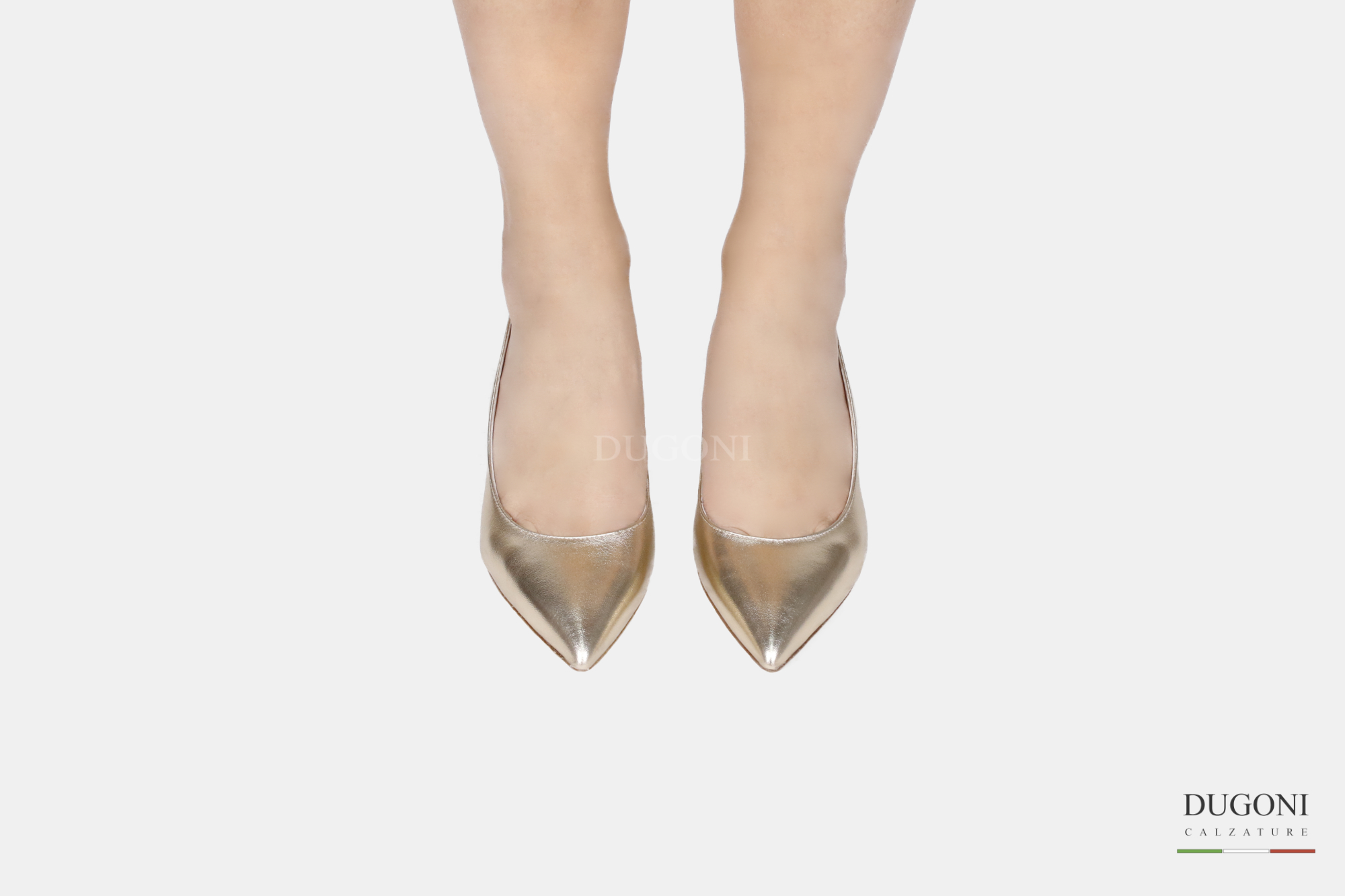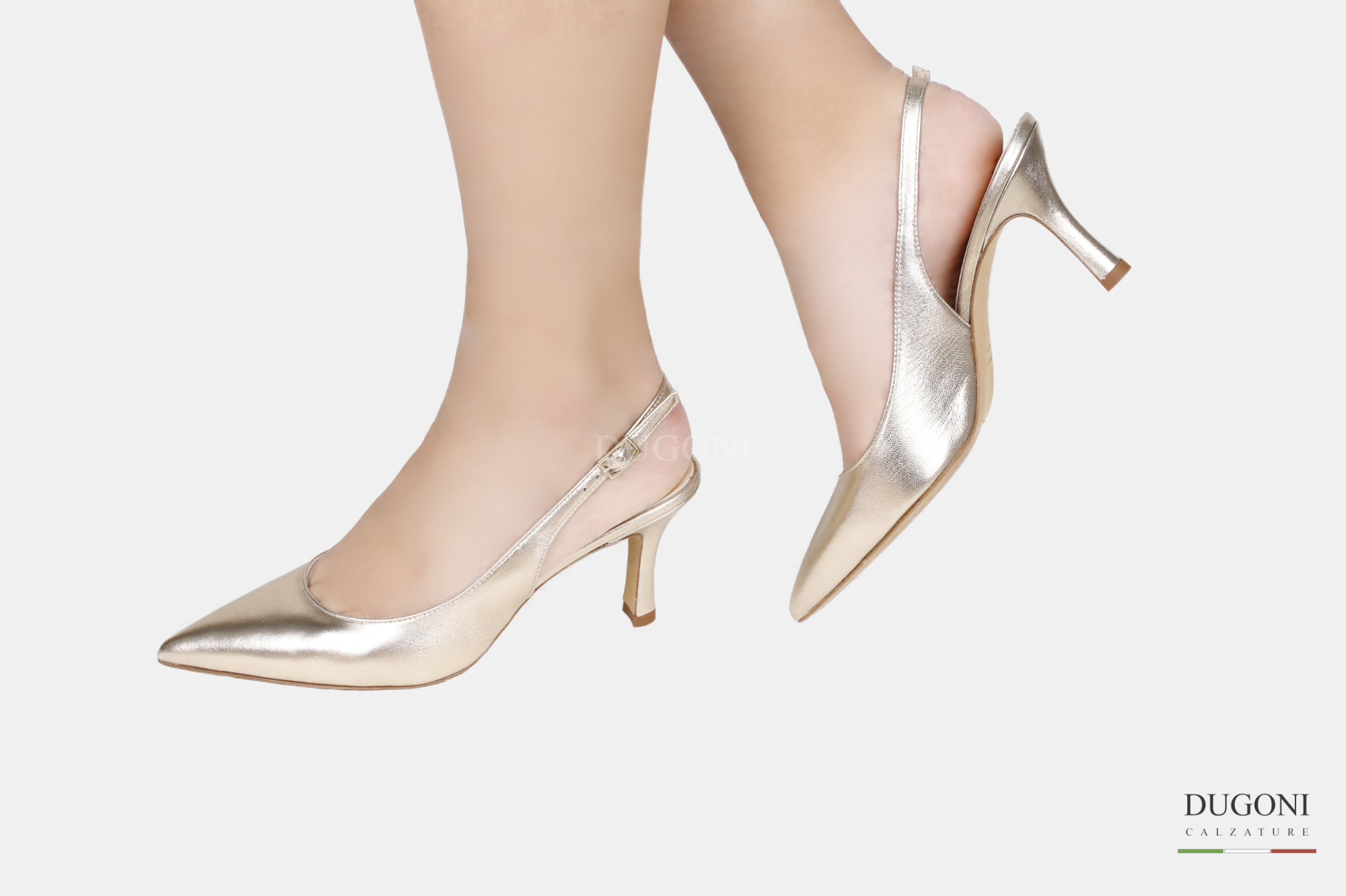 Slingback sulla forma sfilata in pelle oro, con fibbia laterale regolabile.