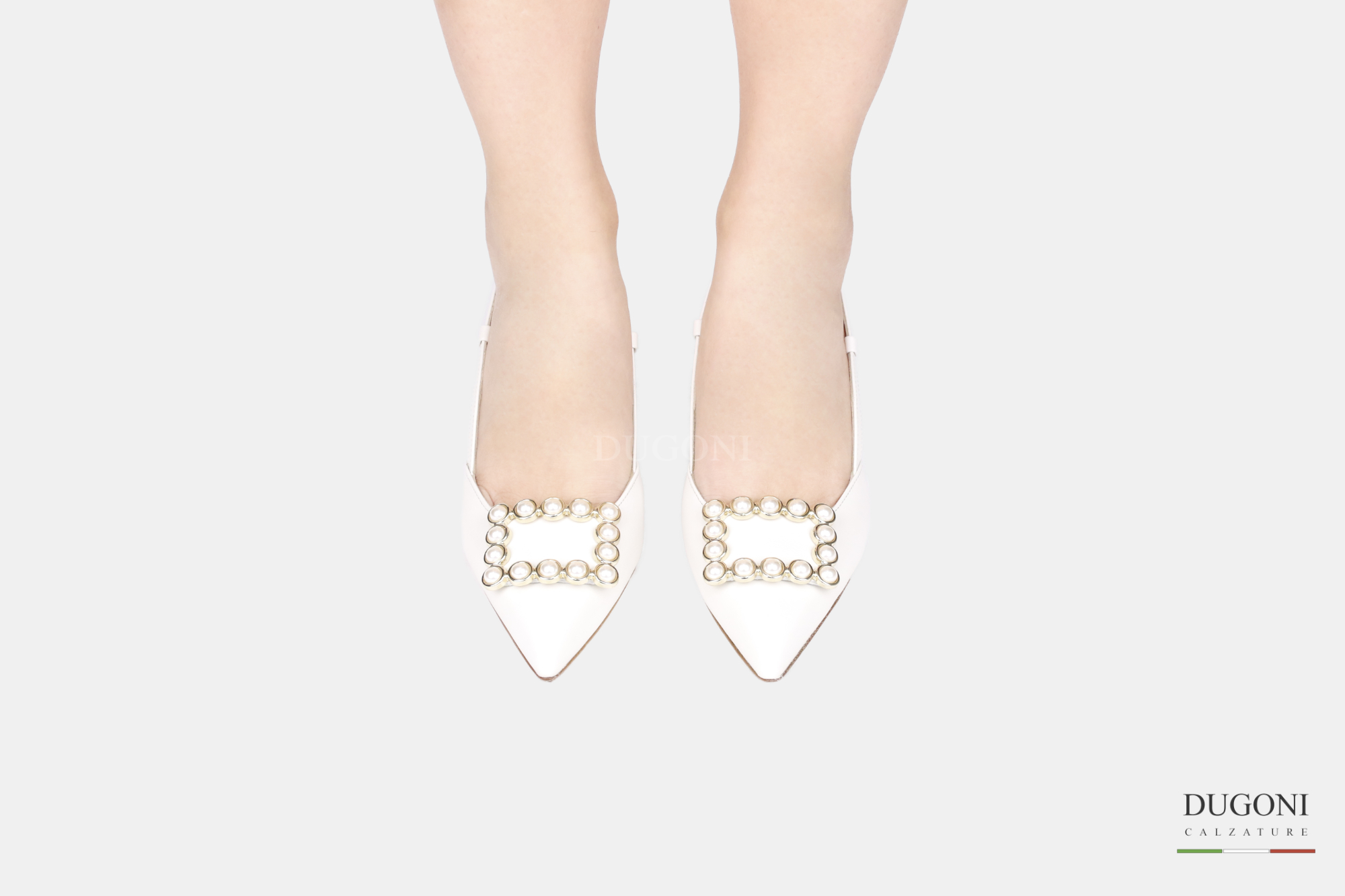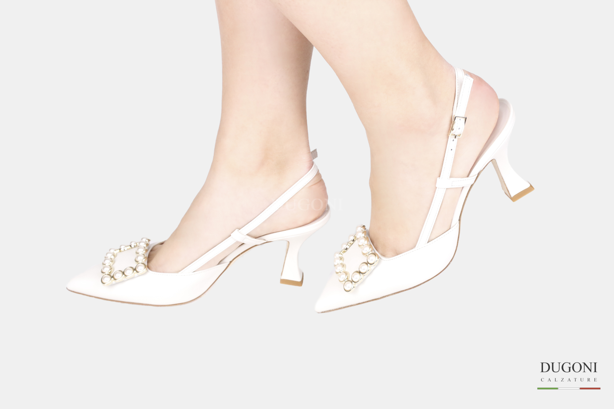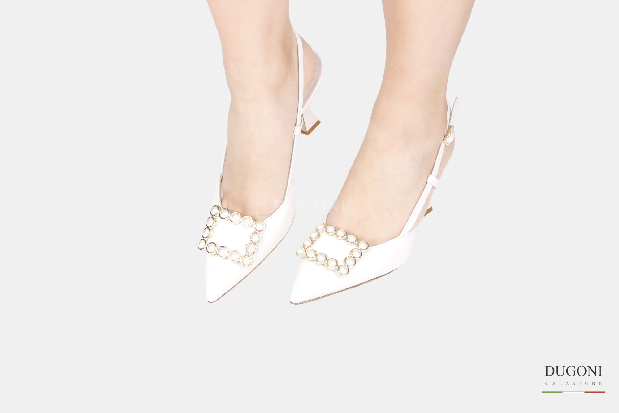 Slingback in pelle avorio con accessorio in perle su profilo oro. Cinturino regolabile. Tacco a rocchetto ricoperto in tinta.