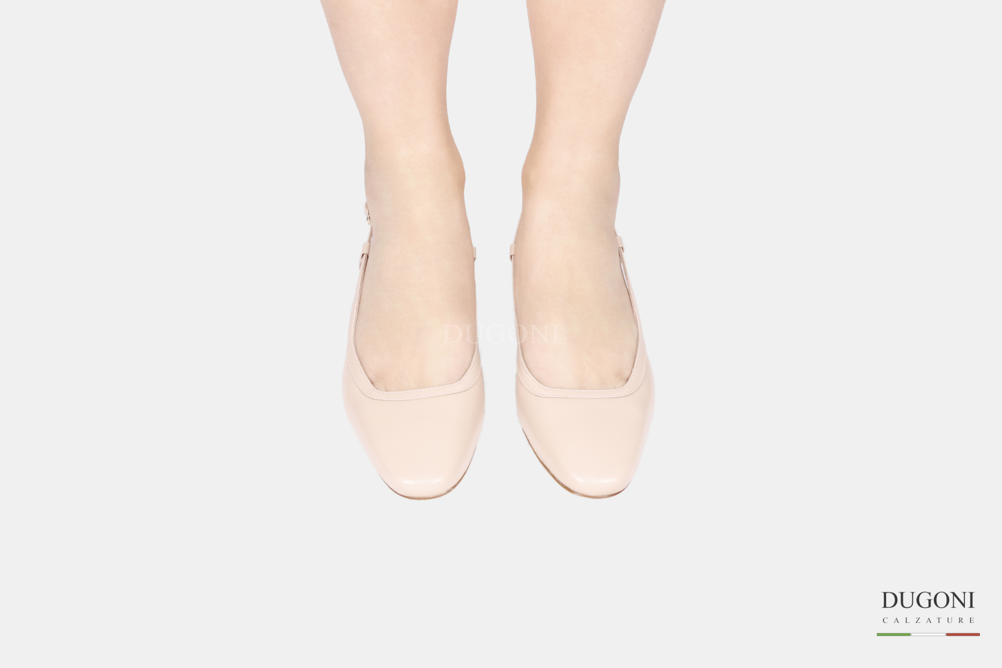 Slingback con forma tonda in pelle morbida colore beige. Cinturino regolabile. Tacco ricoperto in tinta.