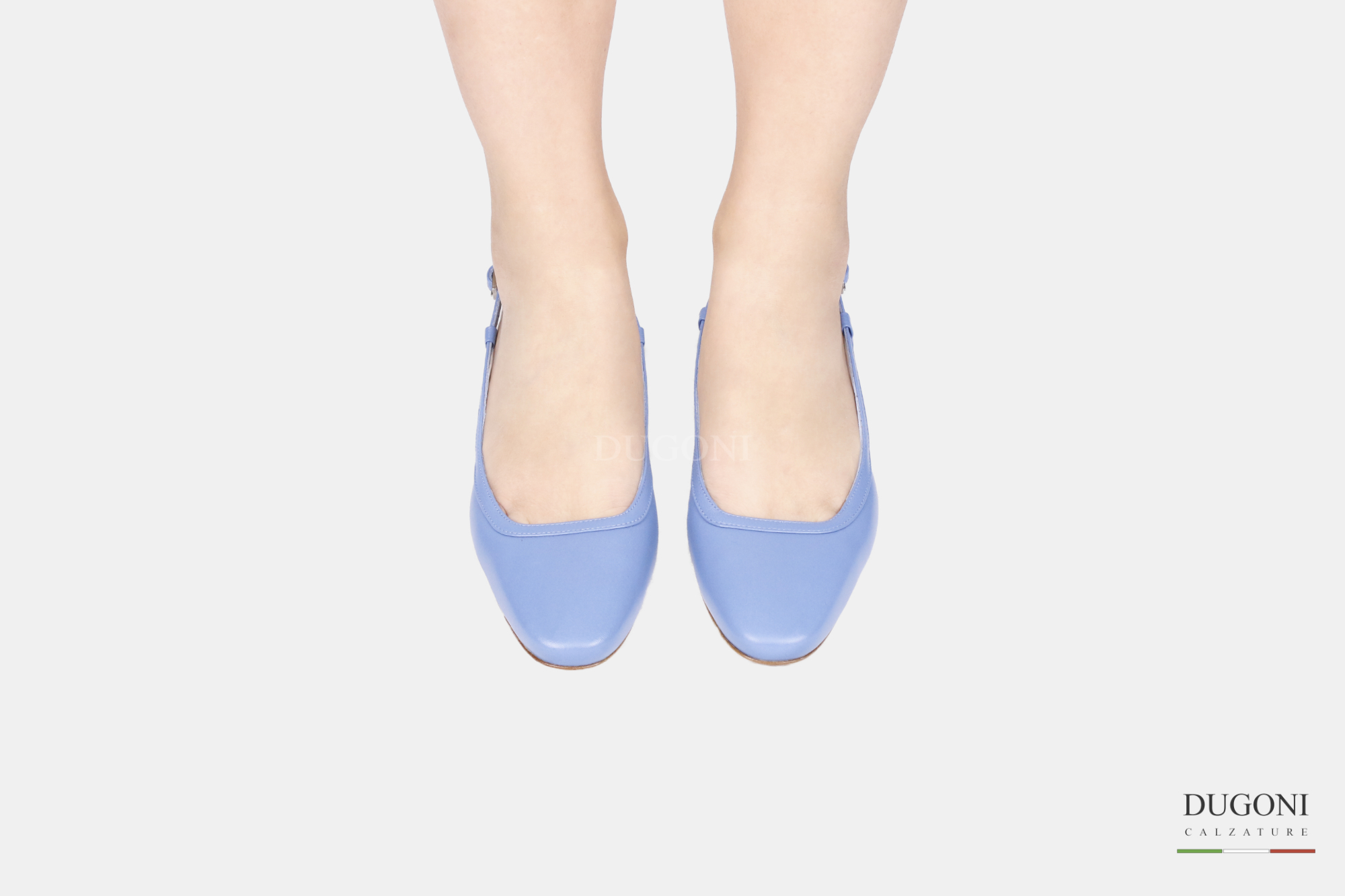 Slingback con forma tonda in pelle blu fiordaliso. Cinturino regolabile. Tacco ricoperto in tinta.