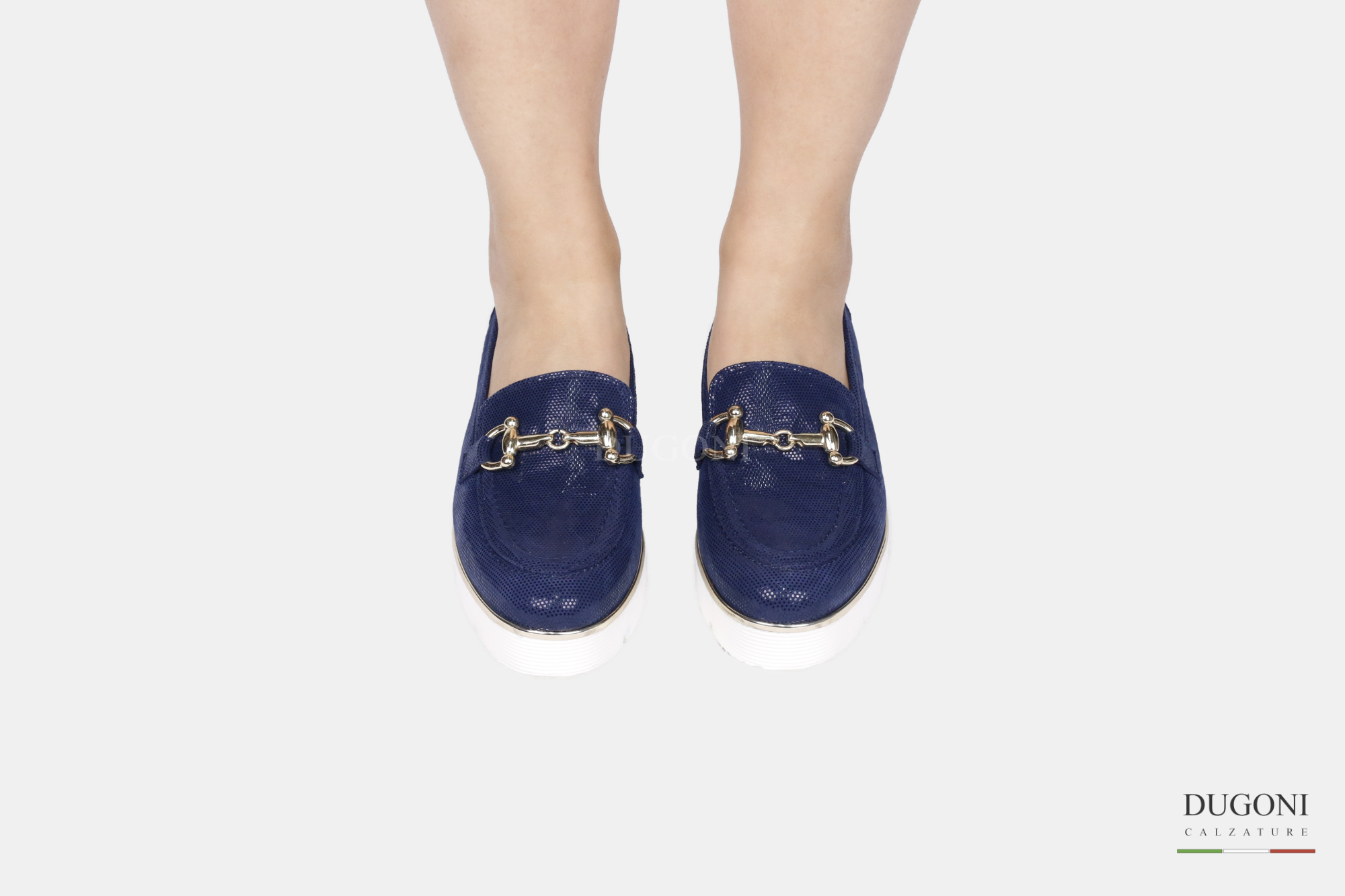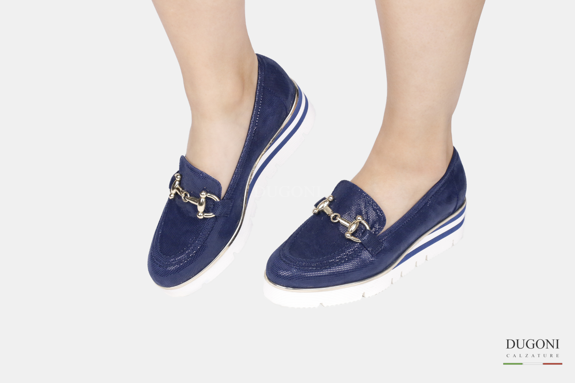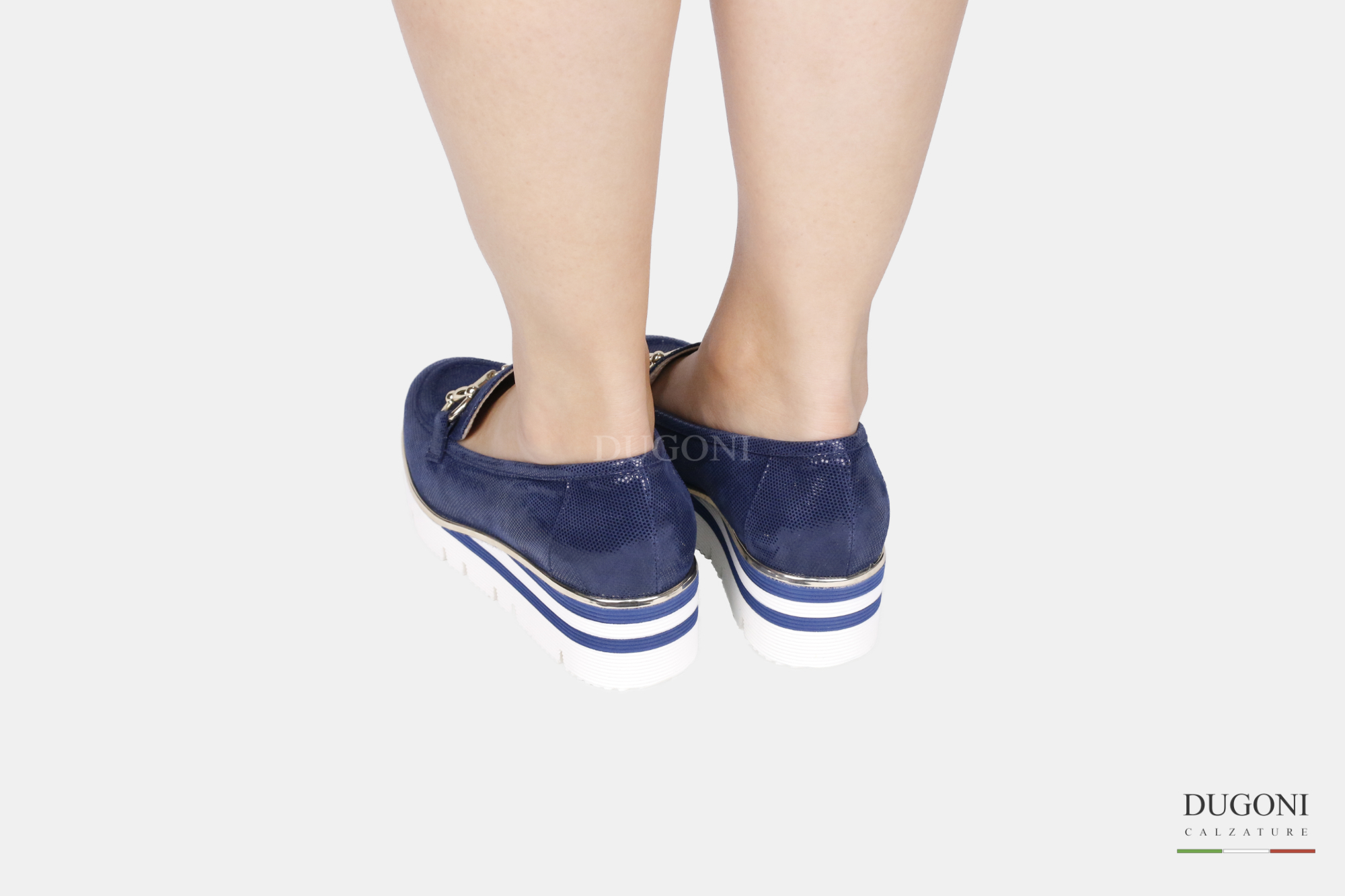 Mocassino  in camoscio fish blu con  accessorio d’orato. Zeppa 40 mm bianca e blu.