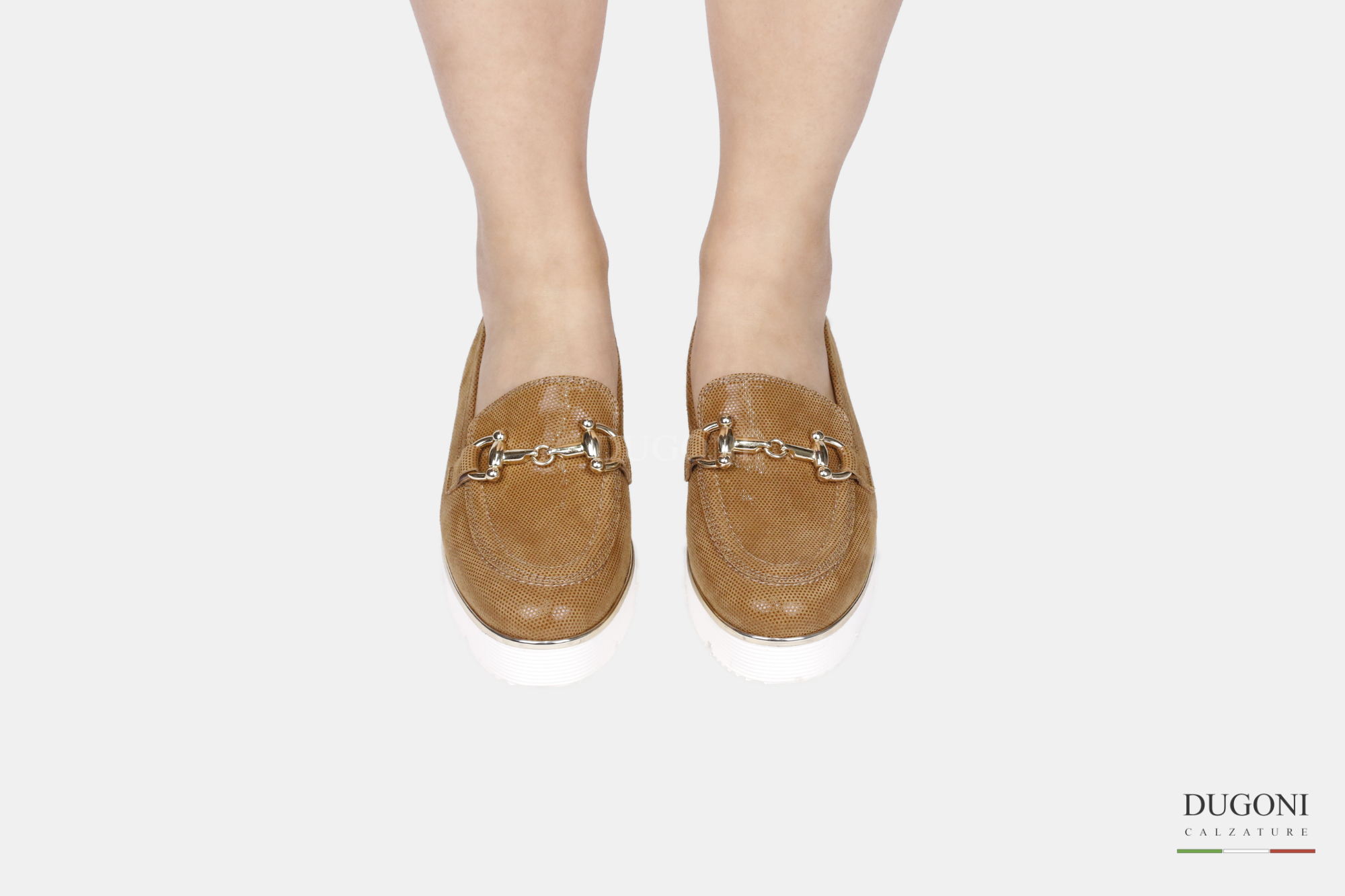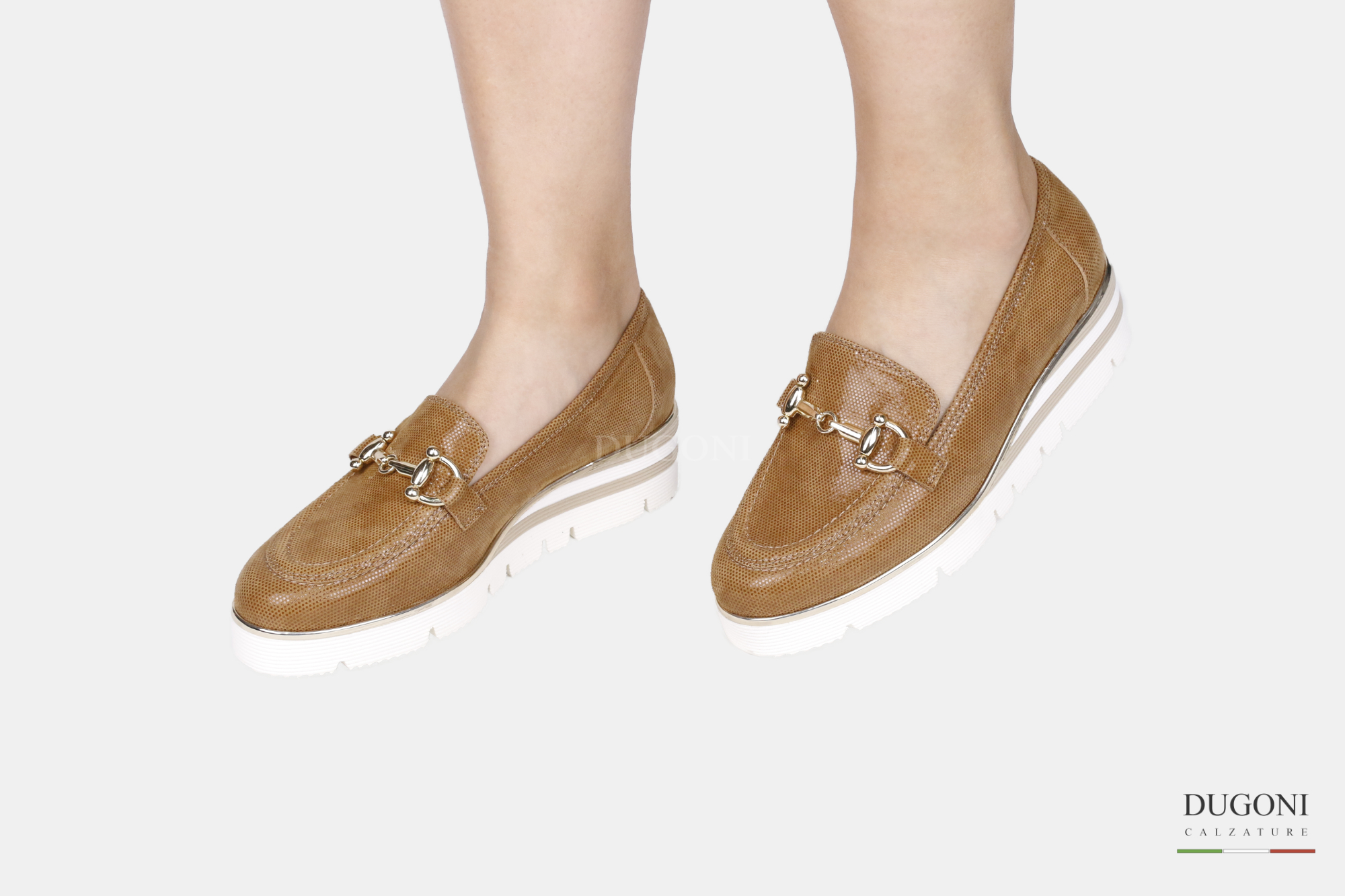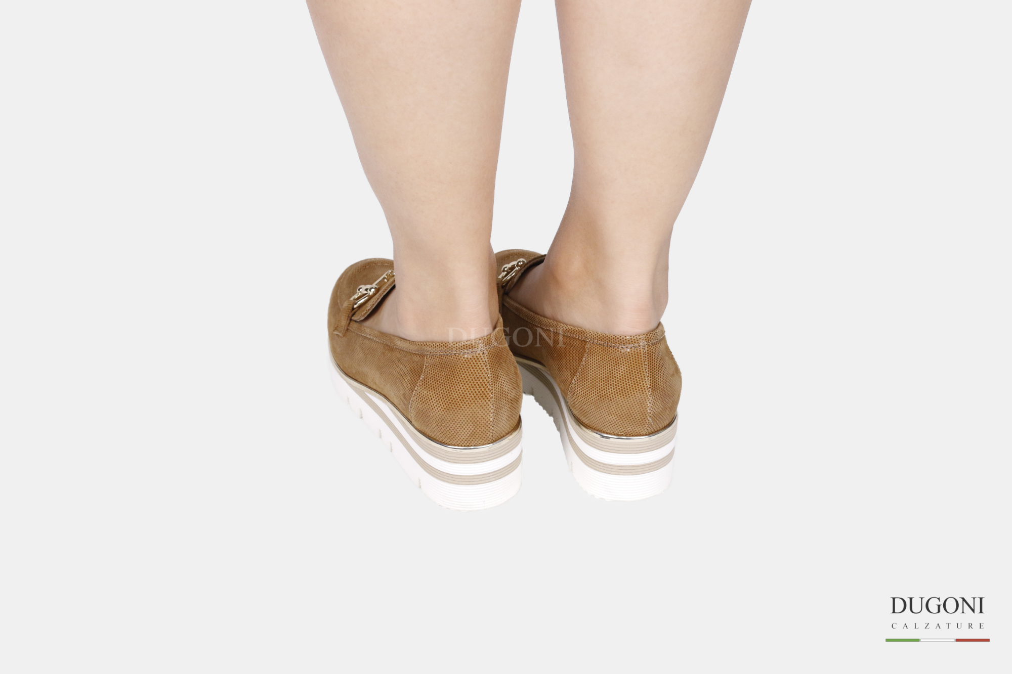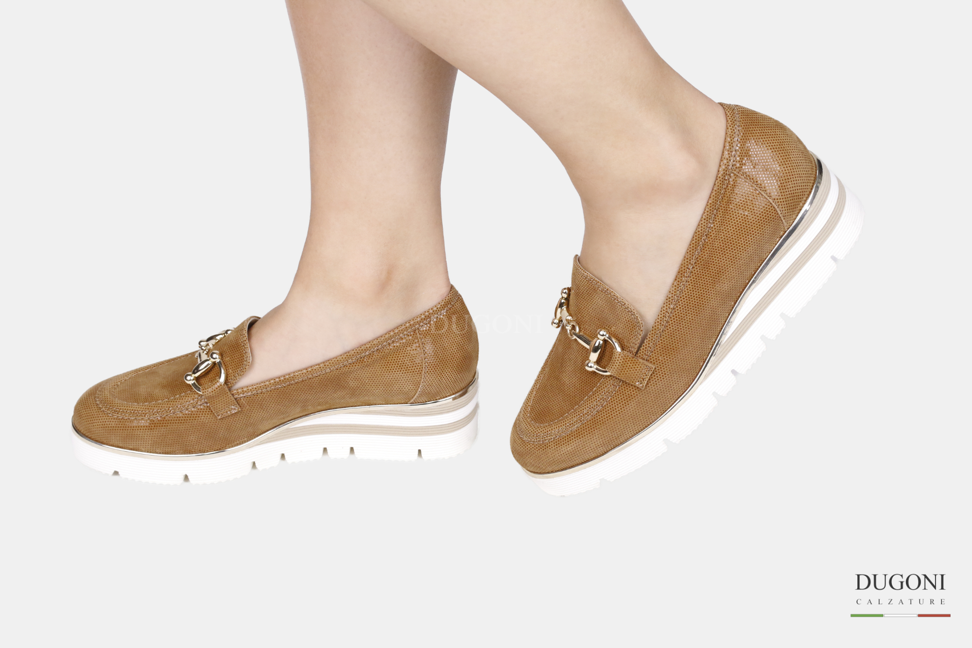 Mocassino in camoscio fish marrone cuoio e accessorio color oro. Zeppa bianca e beige con profilo d’orato.