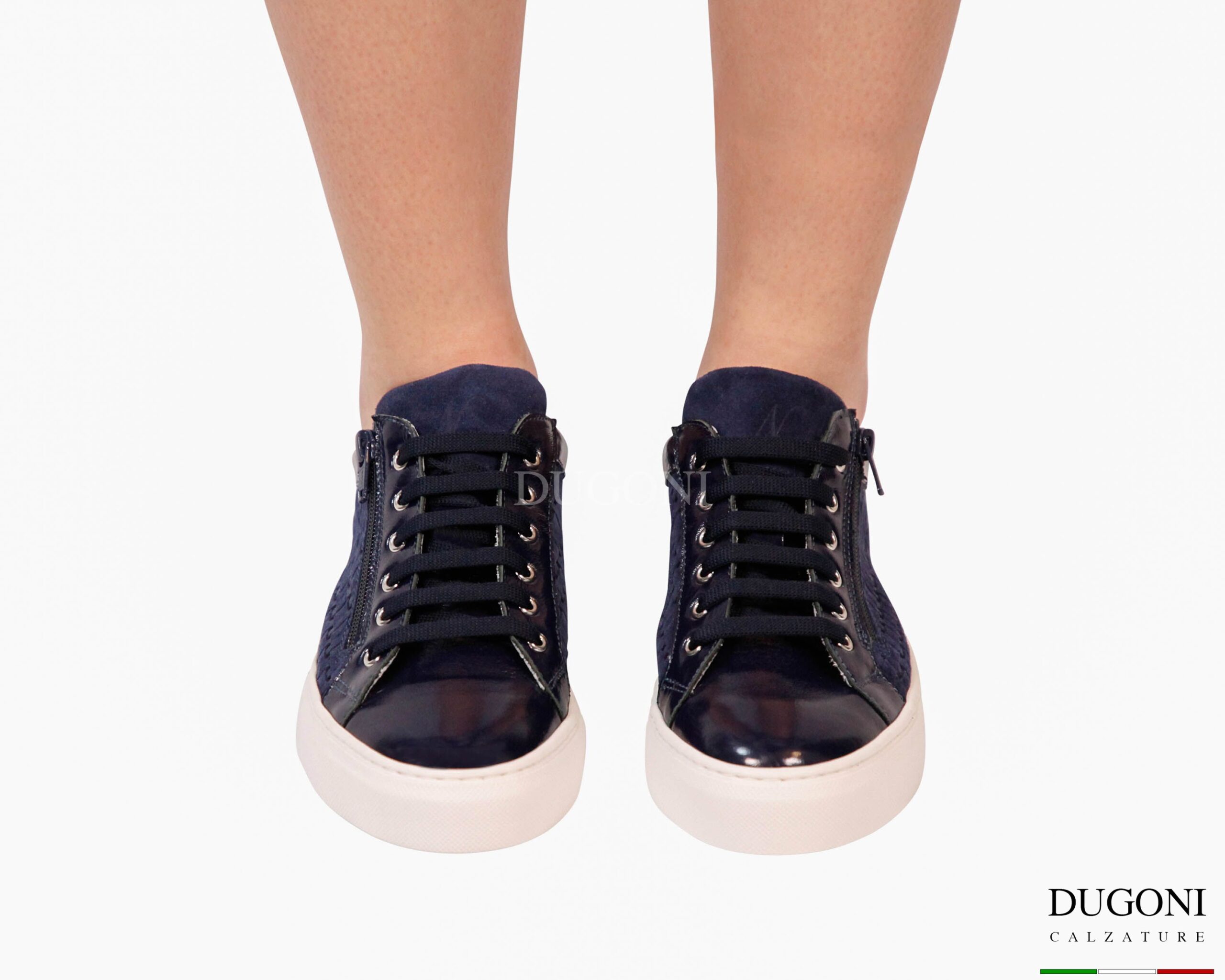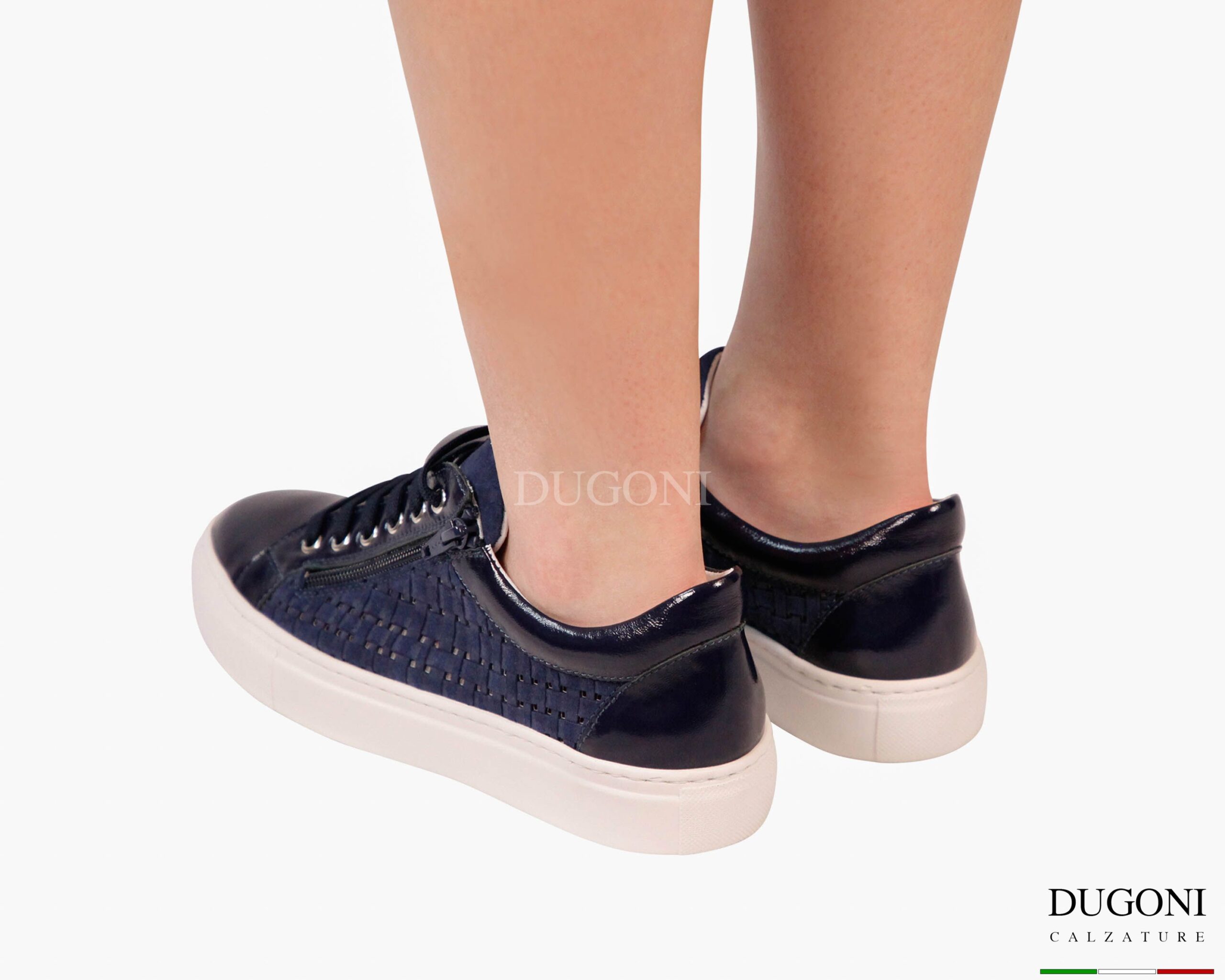 Sneakers con zip laterale bianca , in pelle verlux blu e camoscio blu traforato . Plantare estraibile. Suola in gomma Up Light bianca a cassetta .