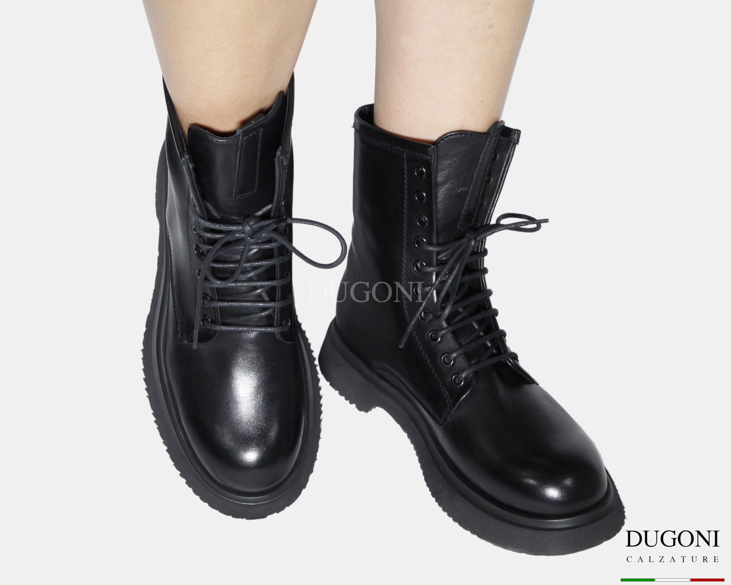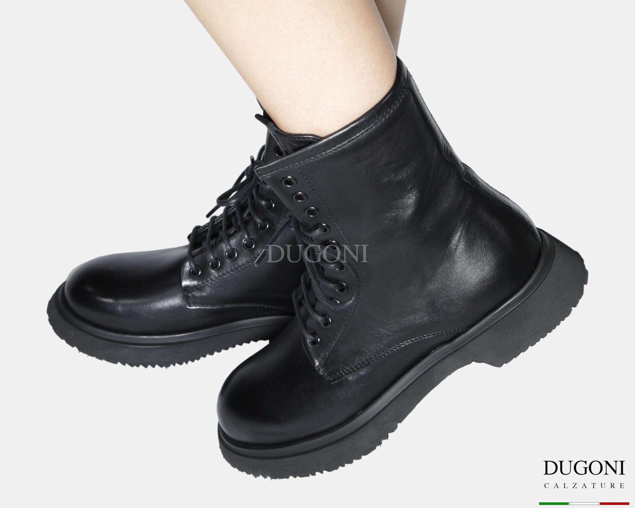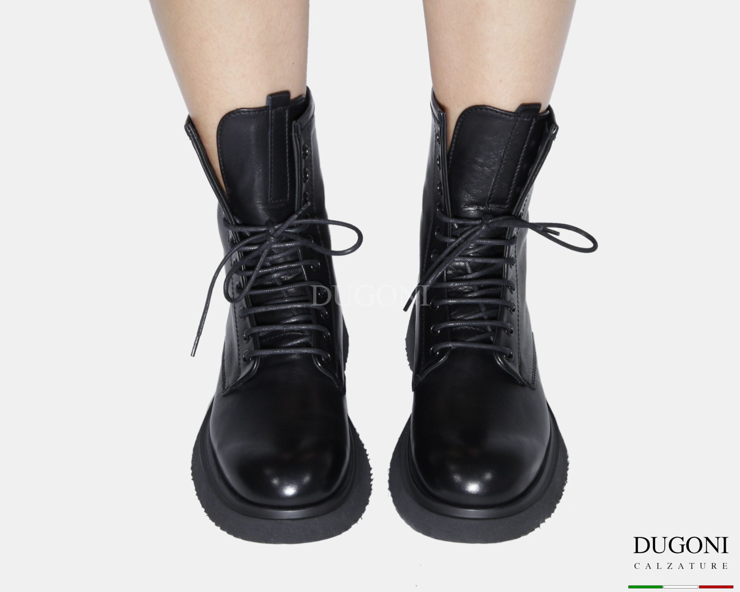 Anfibio bombato in pelle nero. 10 occhielli con cuciture in tinta.  Suola  in gomma con forma leggermente svasata.