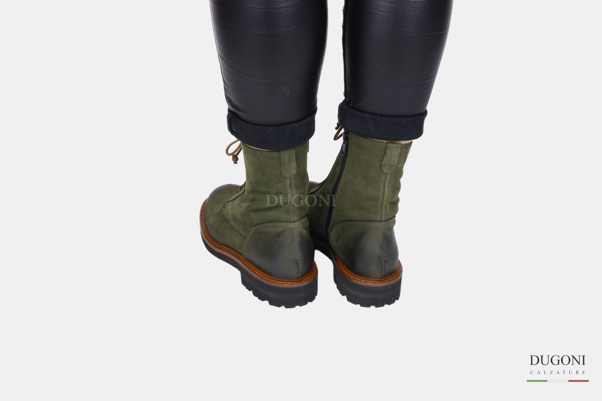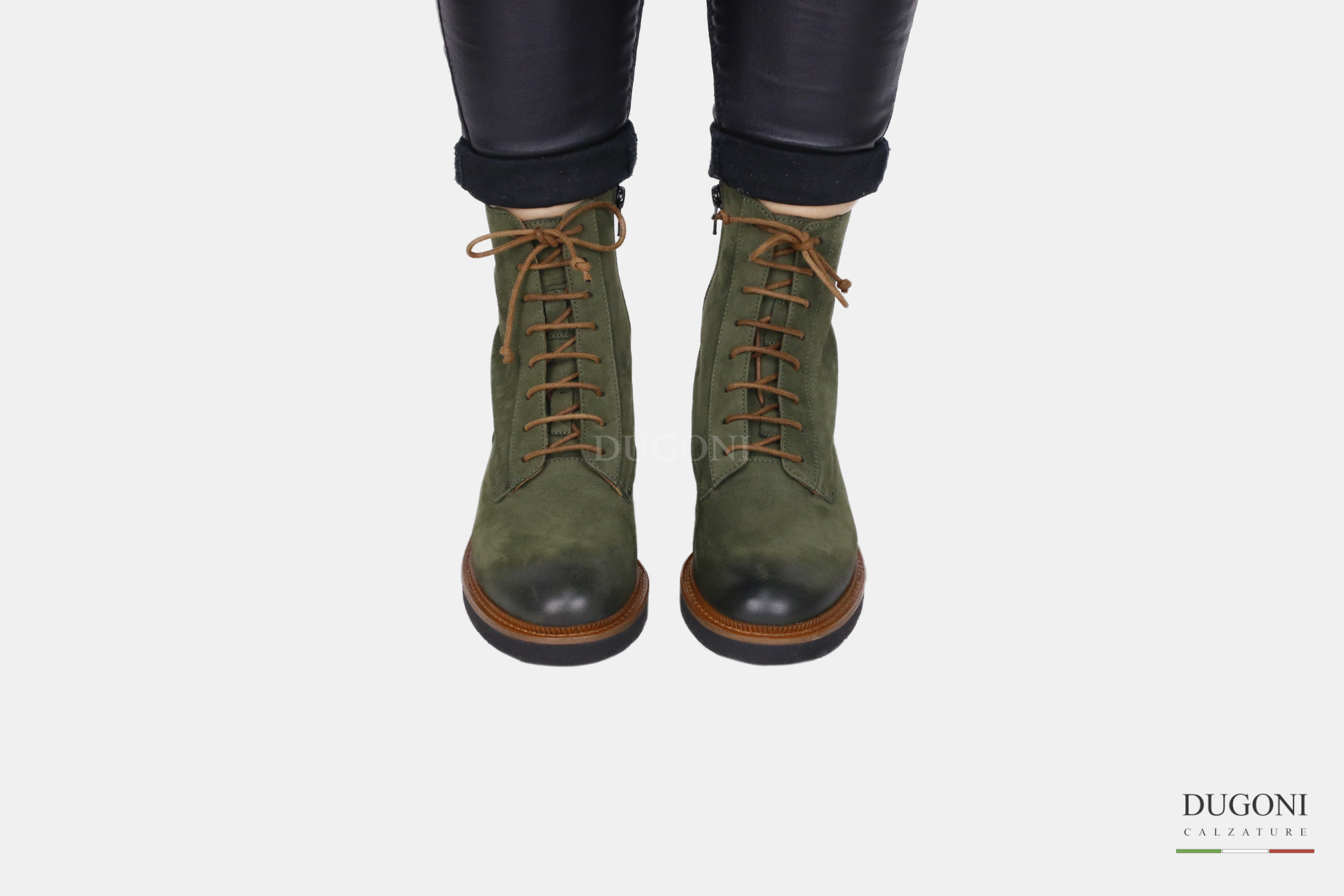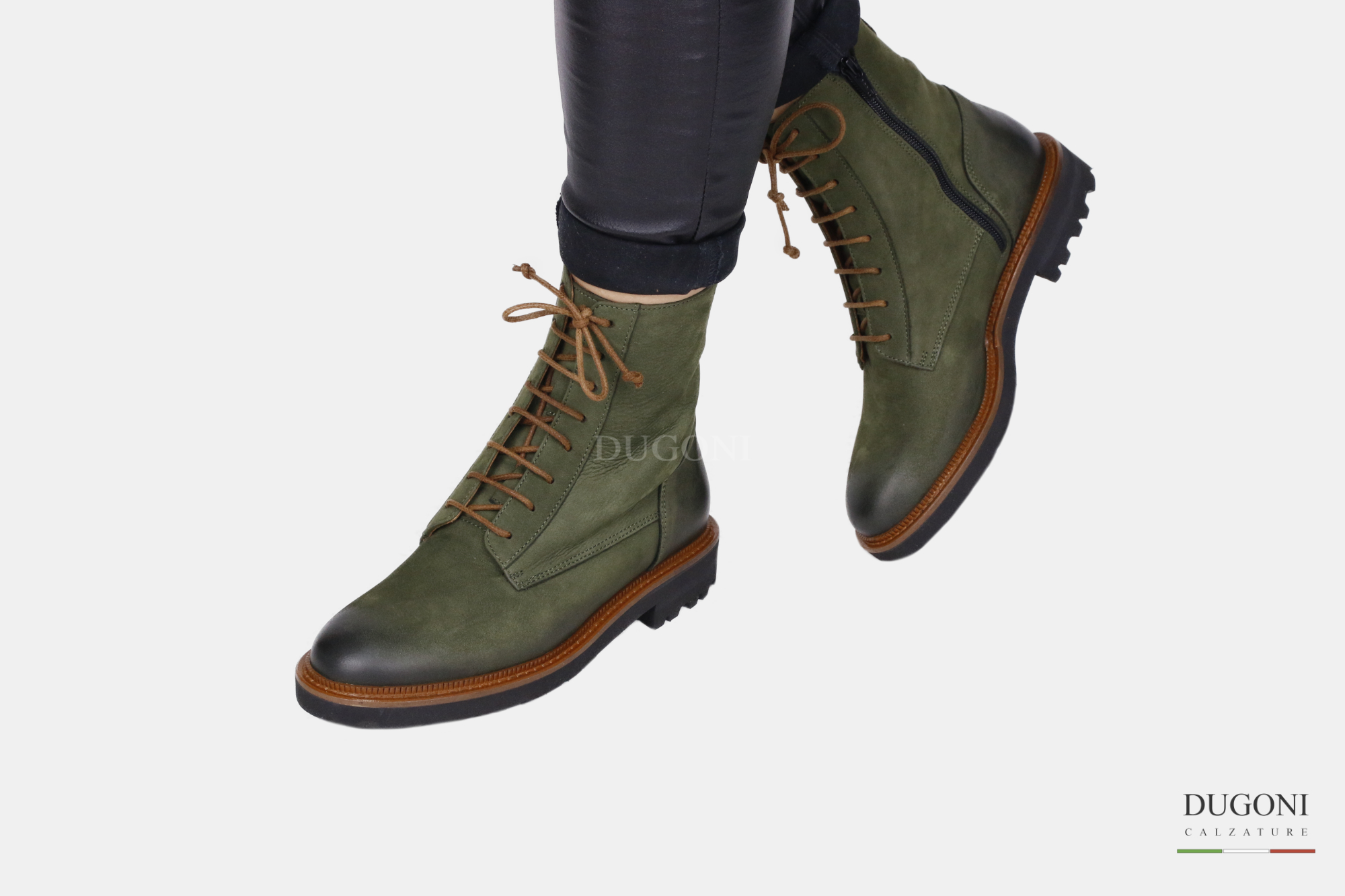 Anfibio in nabuk verde con lacci colorati. Cerniera interna. Profilo suola in cuoio con cucitura in tinta .