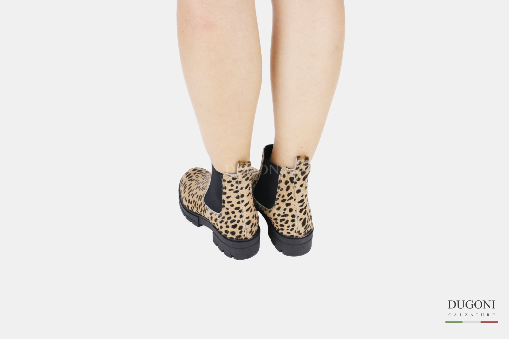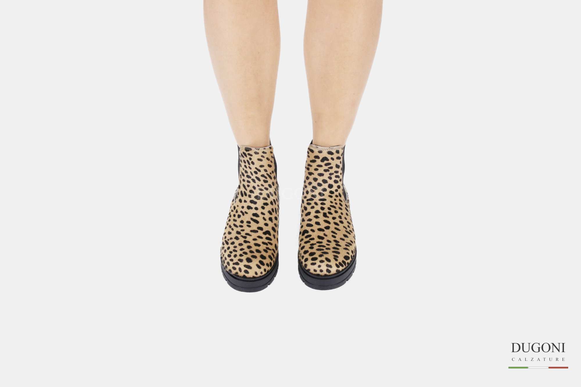 Stivaletto in cavallino leopardato con elastici . Suola carrarmato in gomma.