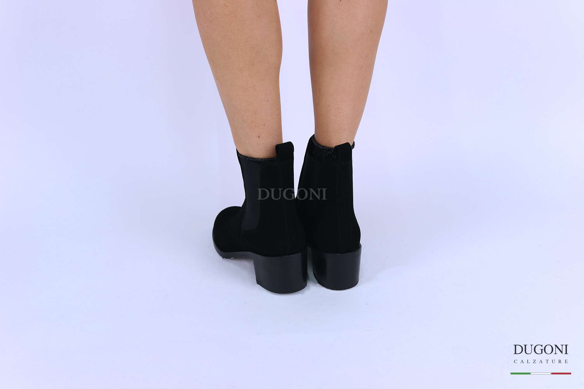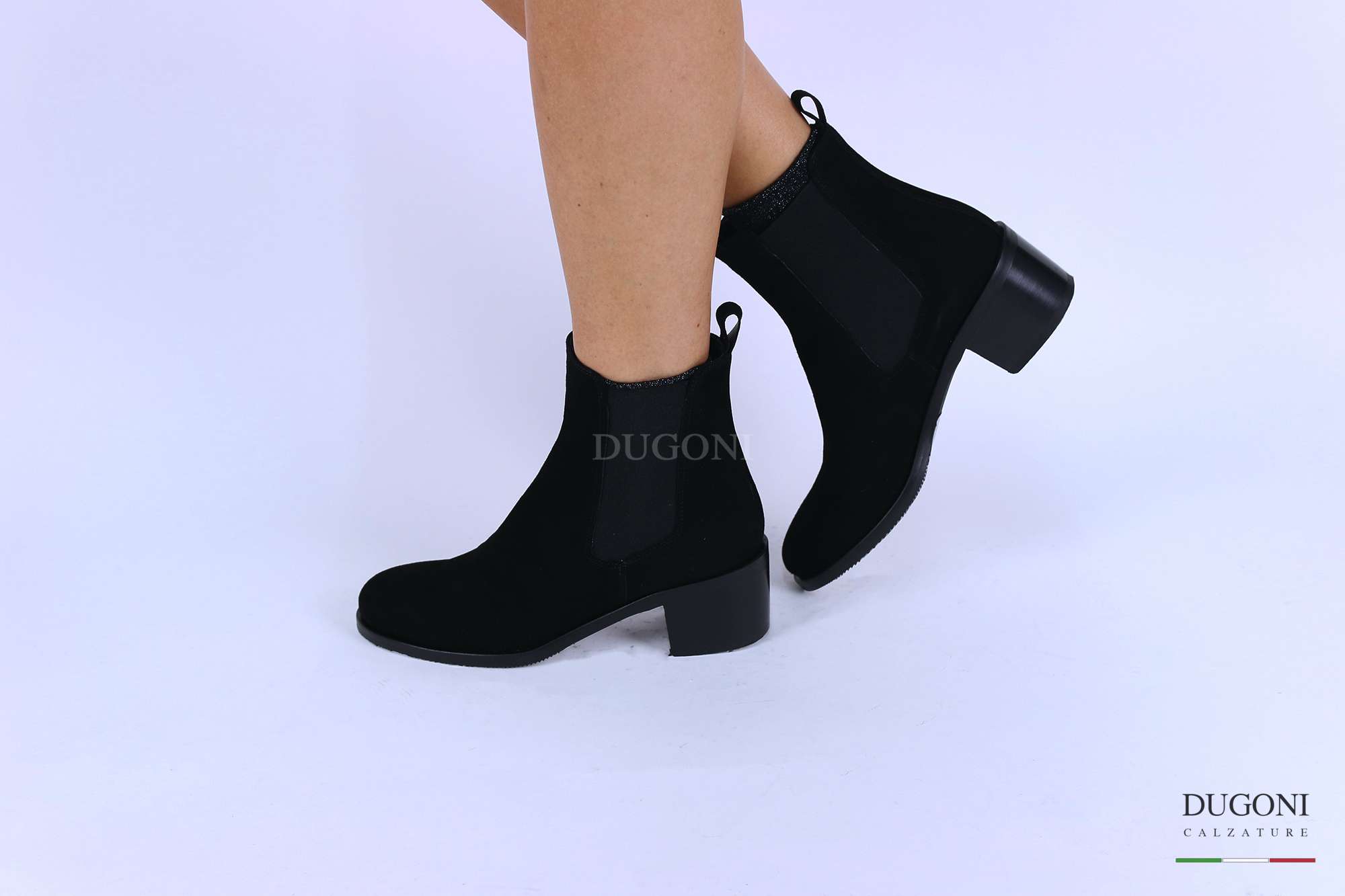 Stivaletto liscio in camoscio nero, con elastici laterali. Mezzo tacco in cuoio nero . Linguetta posteriore.