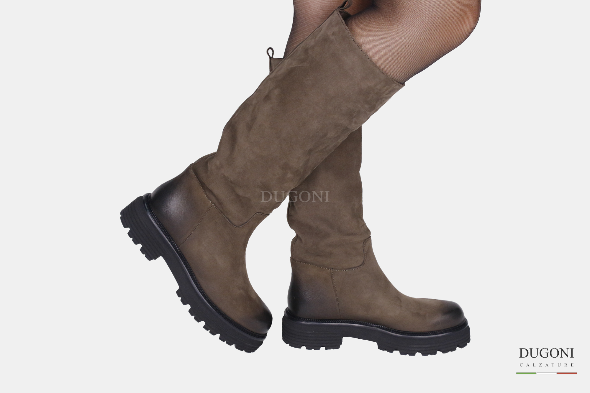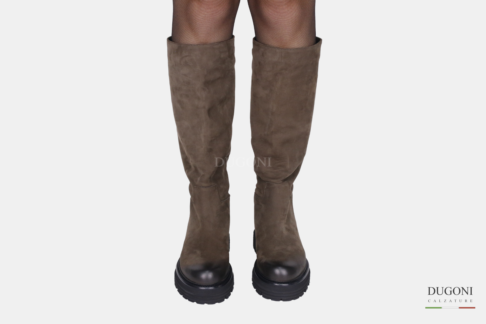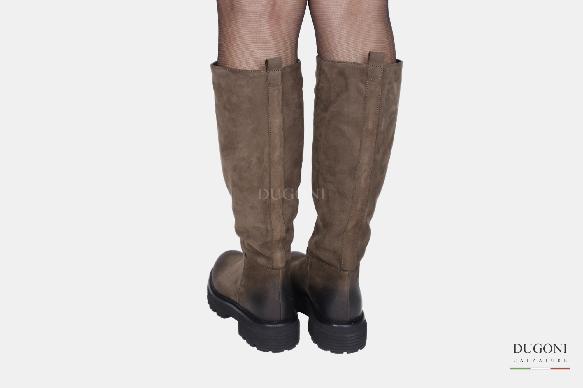 Stivale a tubo  in nabuk marrone -fango . Suola carrarmato in gomma extralight.
