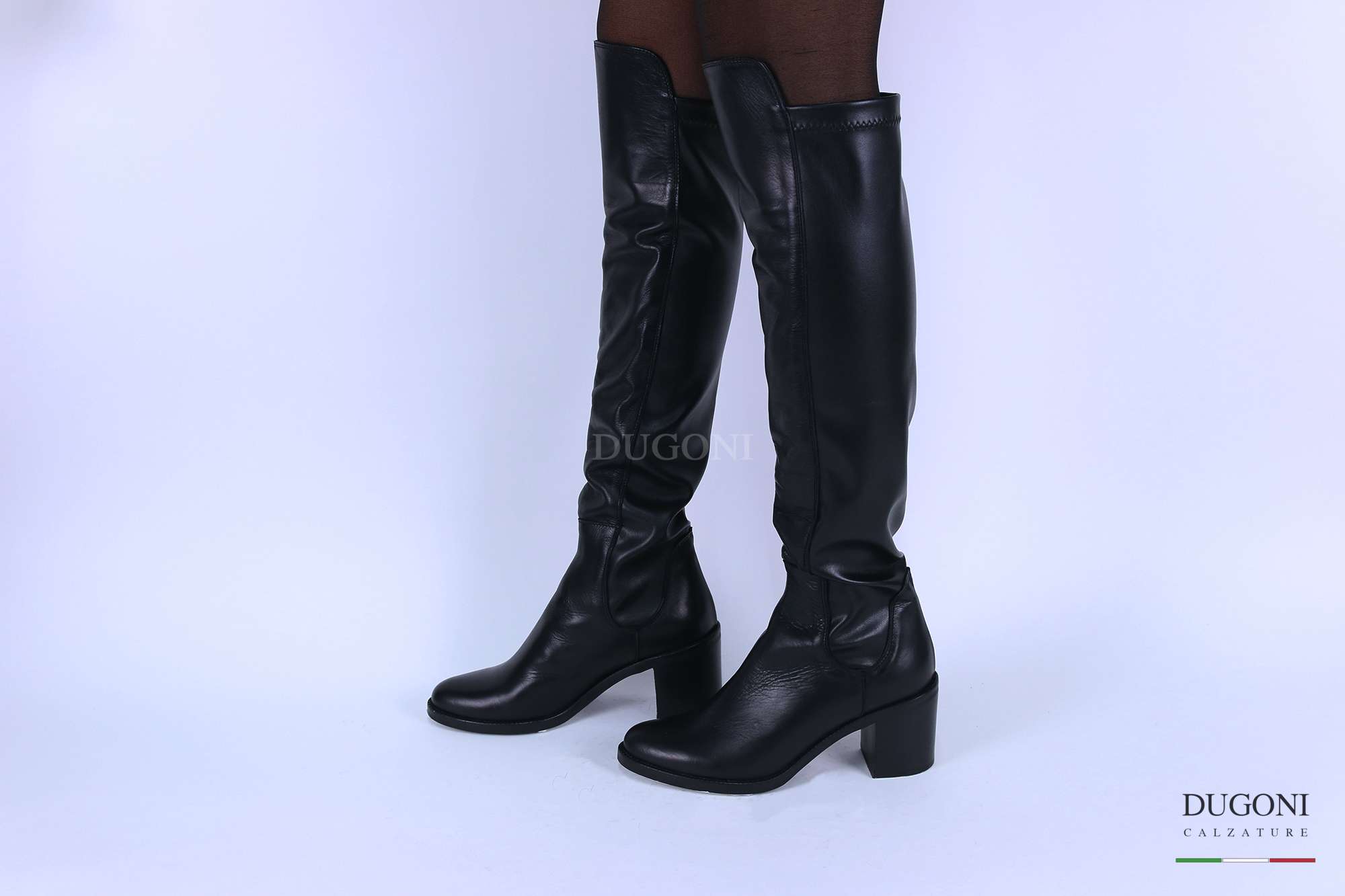 Stivale tipo cuissard – davanti al ginocchio –in pelle nera e materiale elasticizzato a calza (senza cerniere). Tacco cuoio.