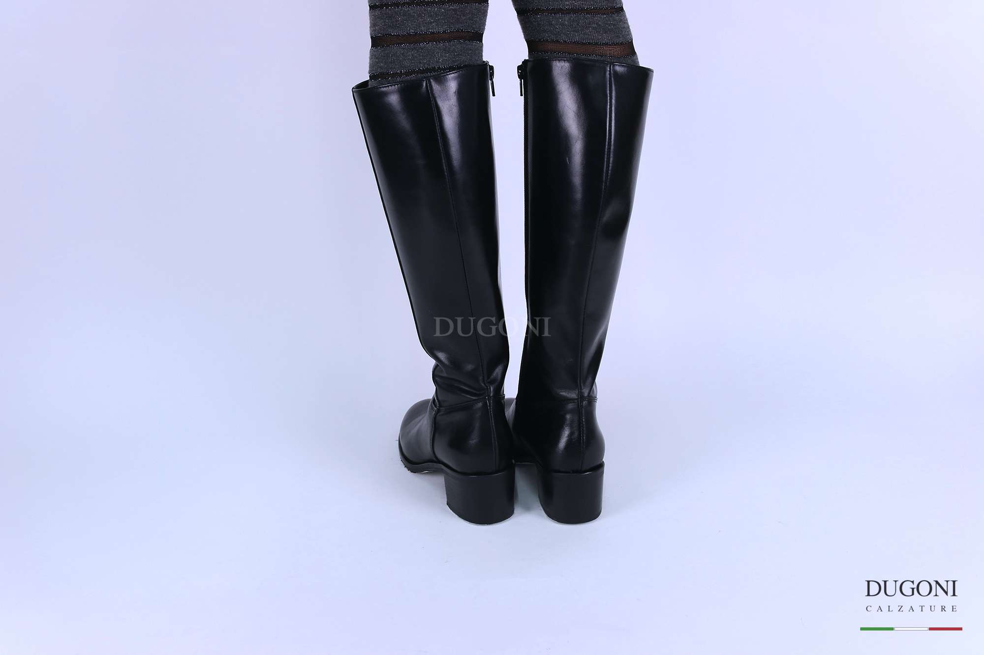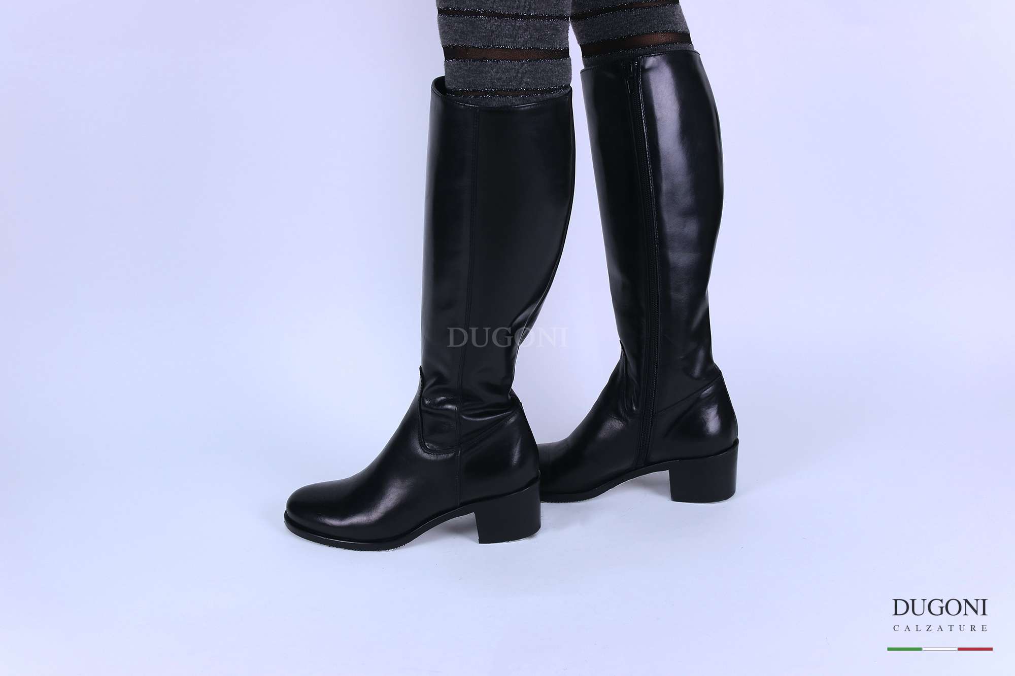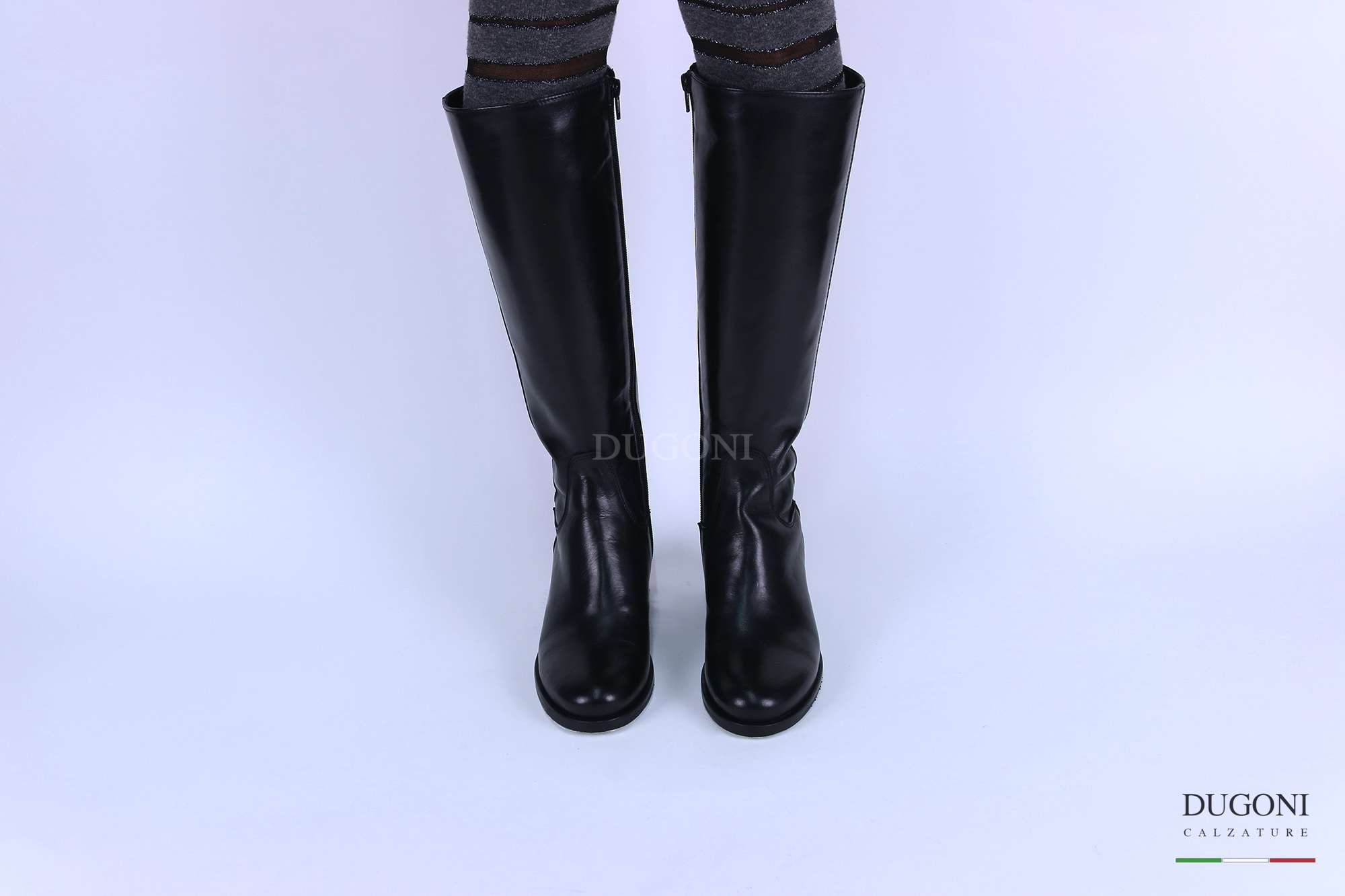 Stivale liscio in pelle nera tipo cavallerizzo. Cerniera interna tutta gamba. Mezzo tacco largo in cuoio.