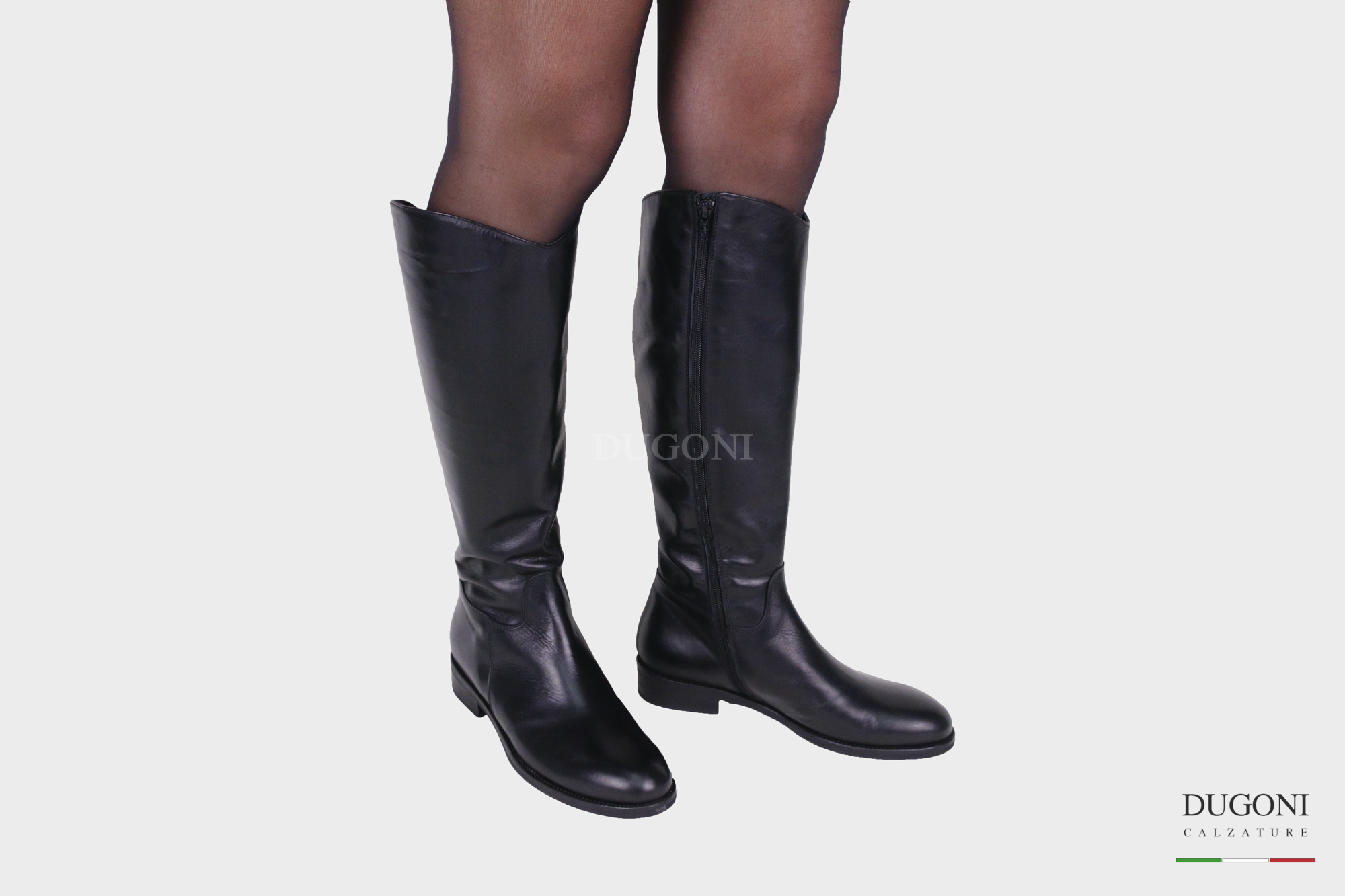 Stivale in pelle tipo cavallerizzo, sotto al ginocchio con scollo a V. Cerniera tutta gamba. Suola in gomma. Gambale XL: indicato per le gambe più formose.
