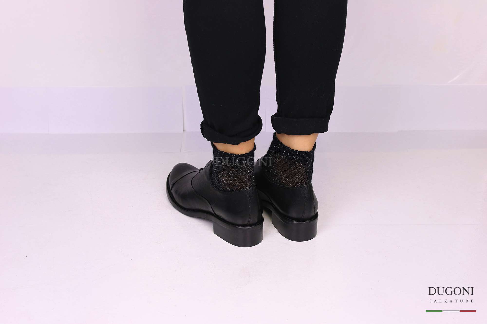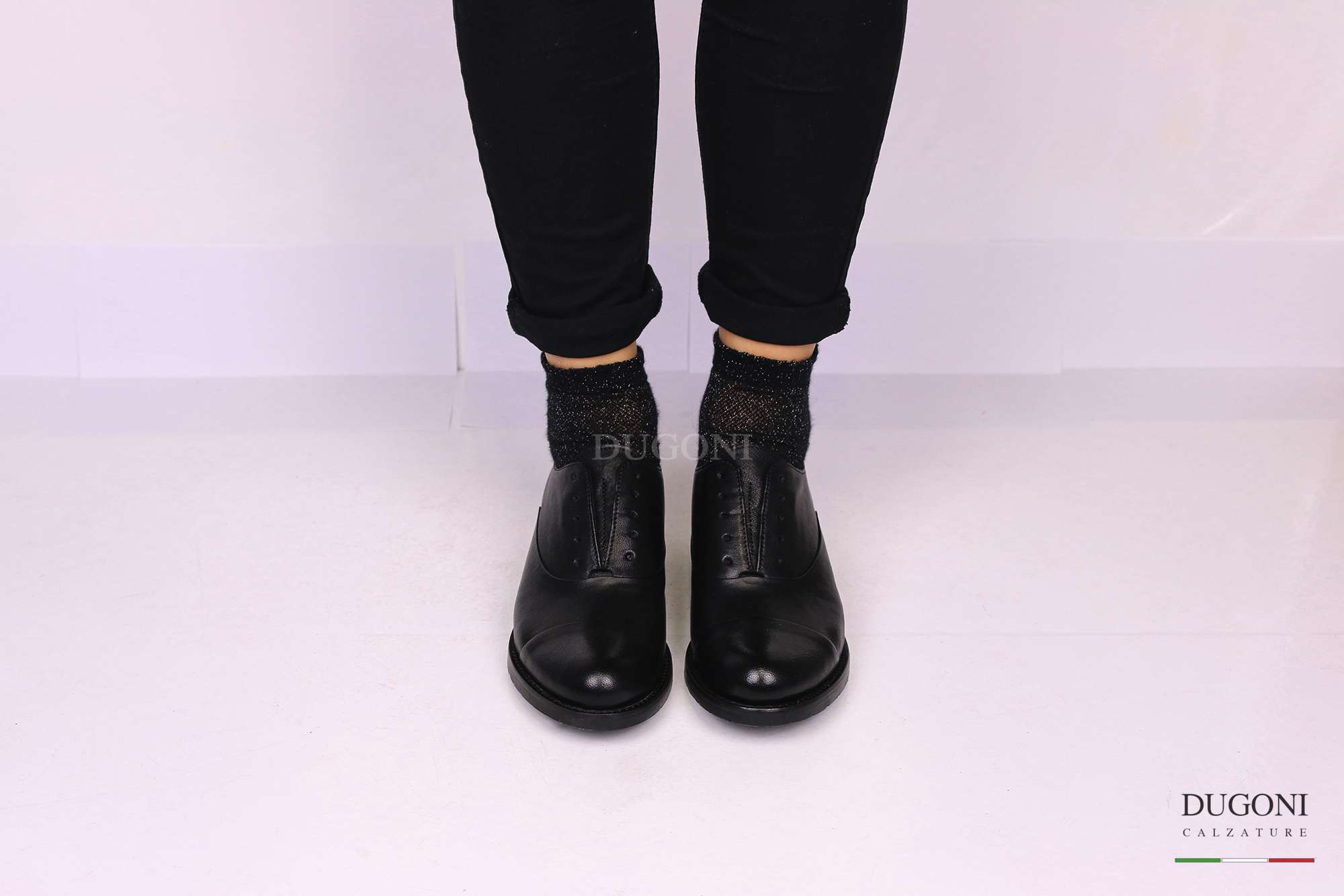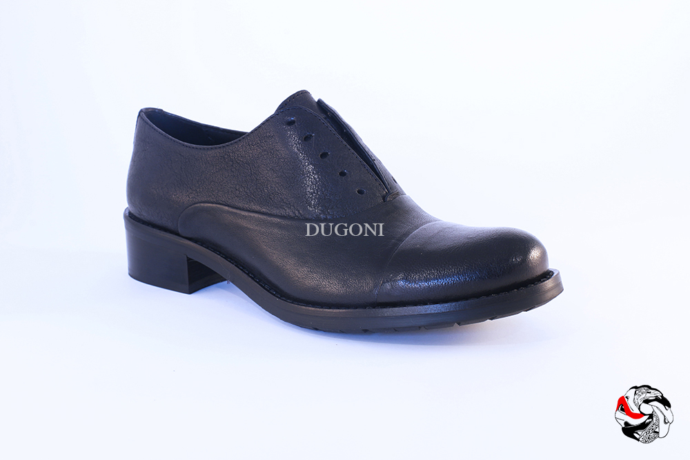 Slip on in pelle nera con puntale e cuciture rigirate . Suola in cuoio + gomma