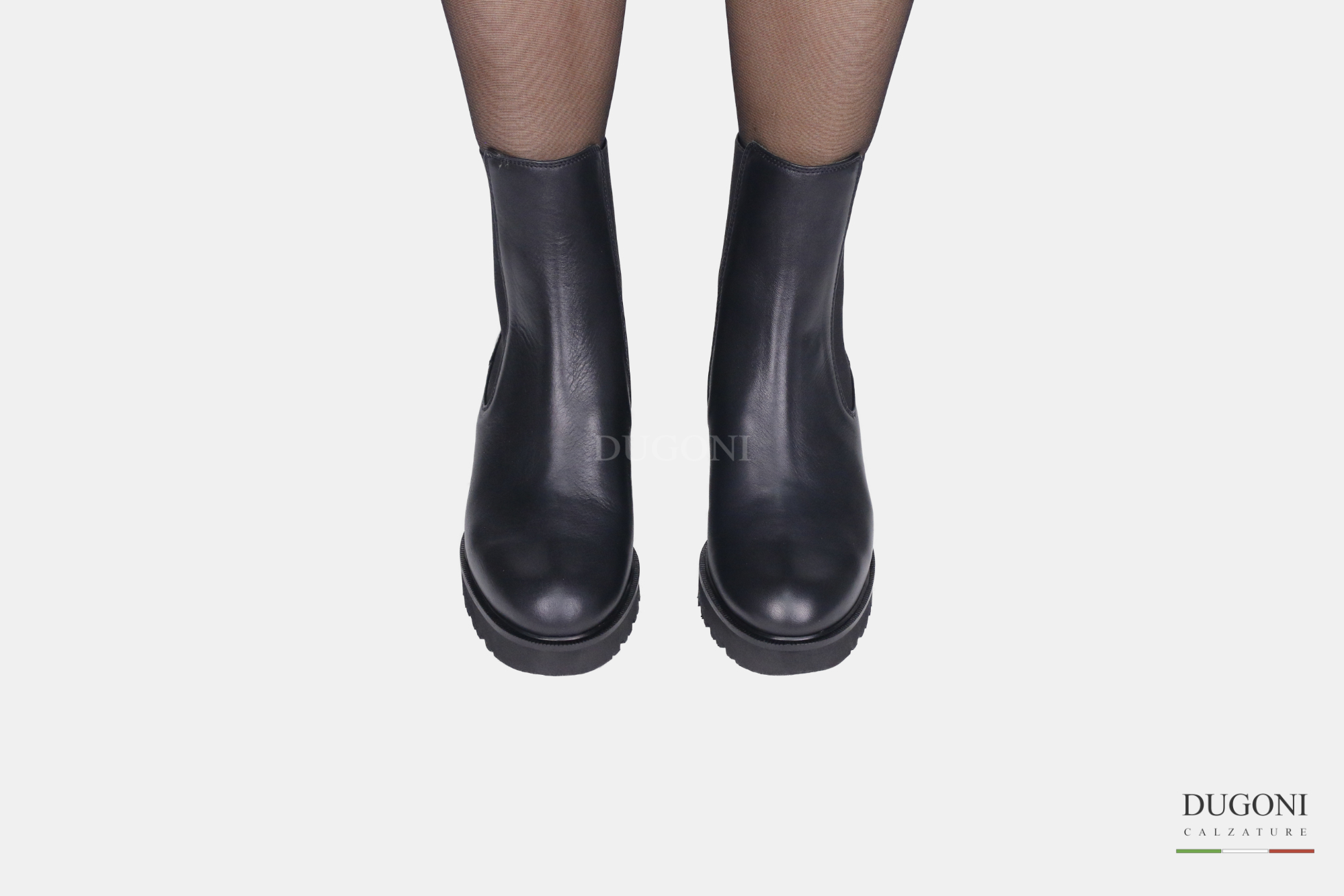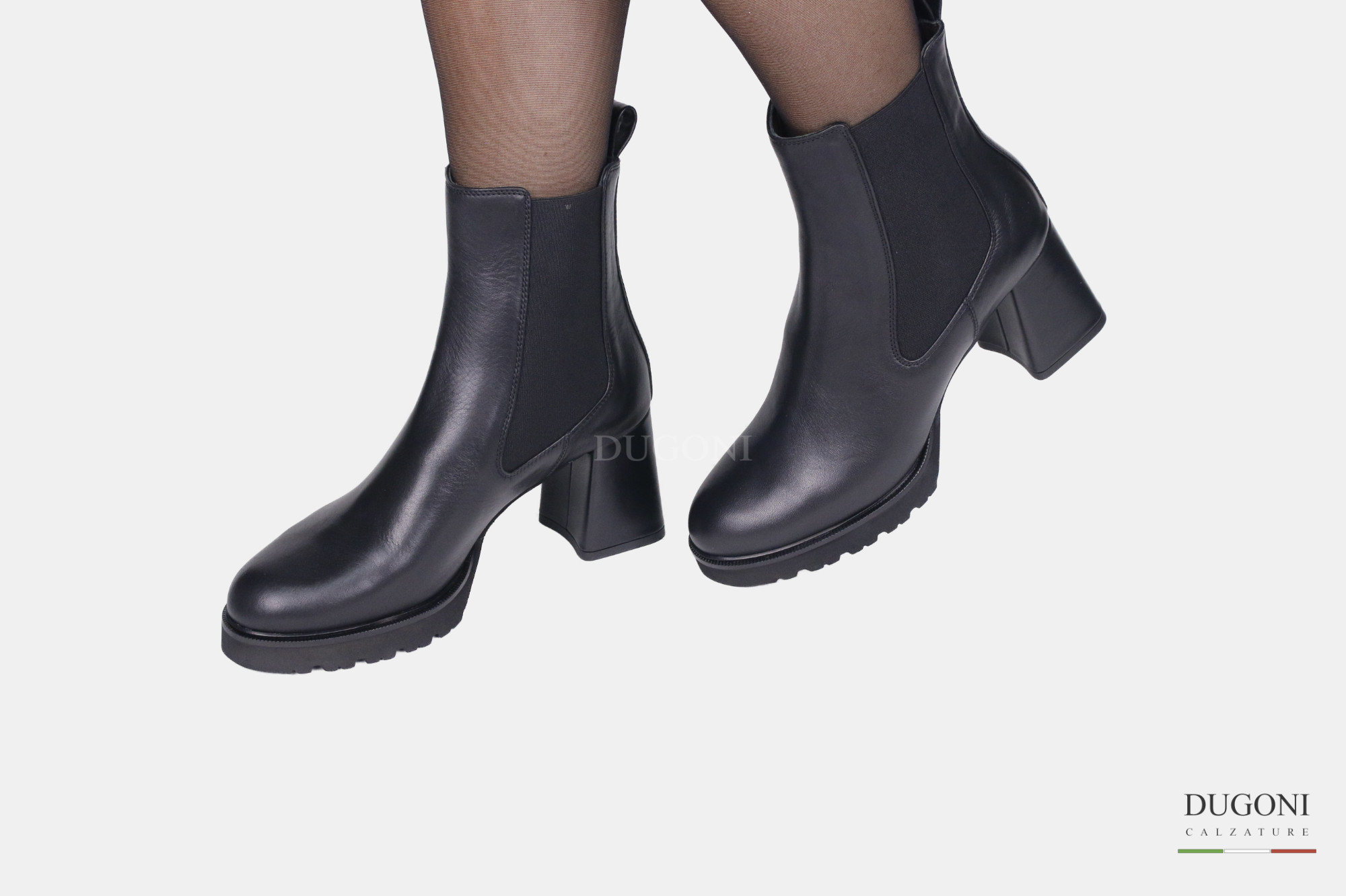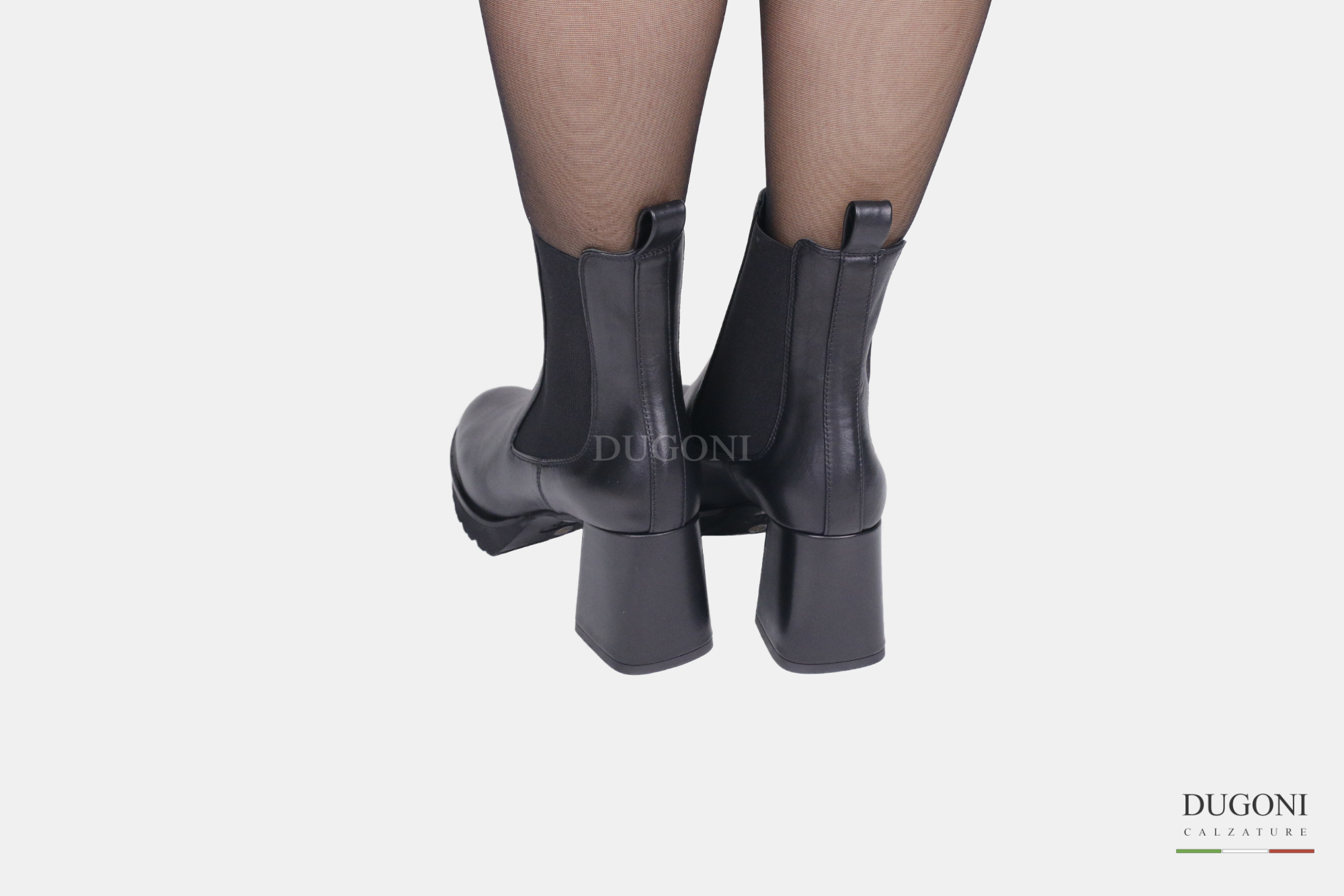 Stivaletto liscio in pelle nero con elastici. Suola con plateau in extra light. Tacco largo e ricoperto.