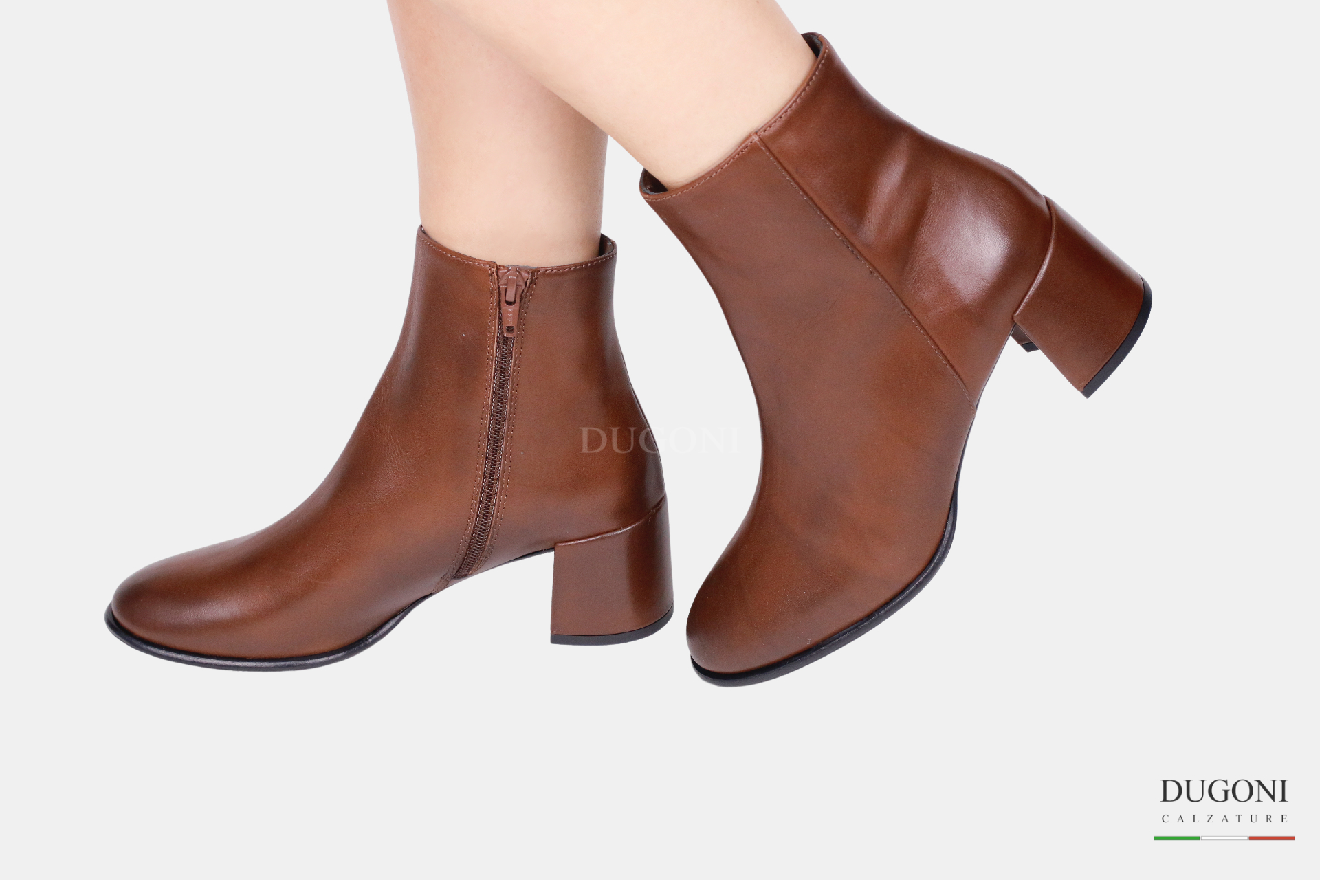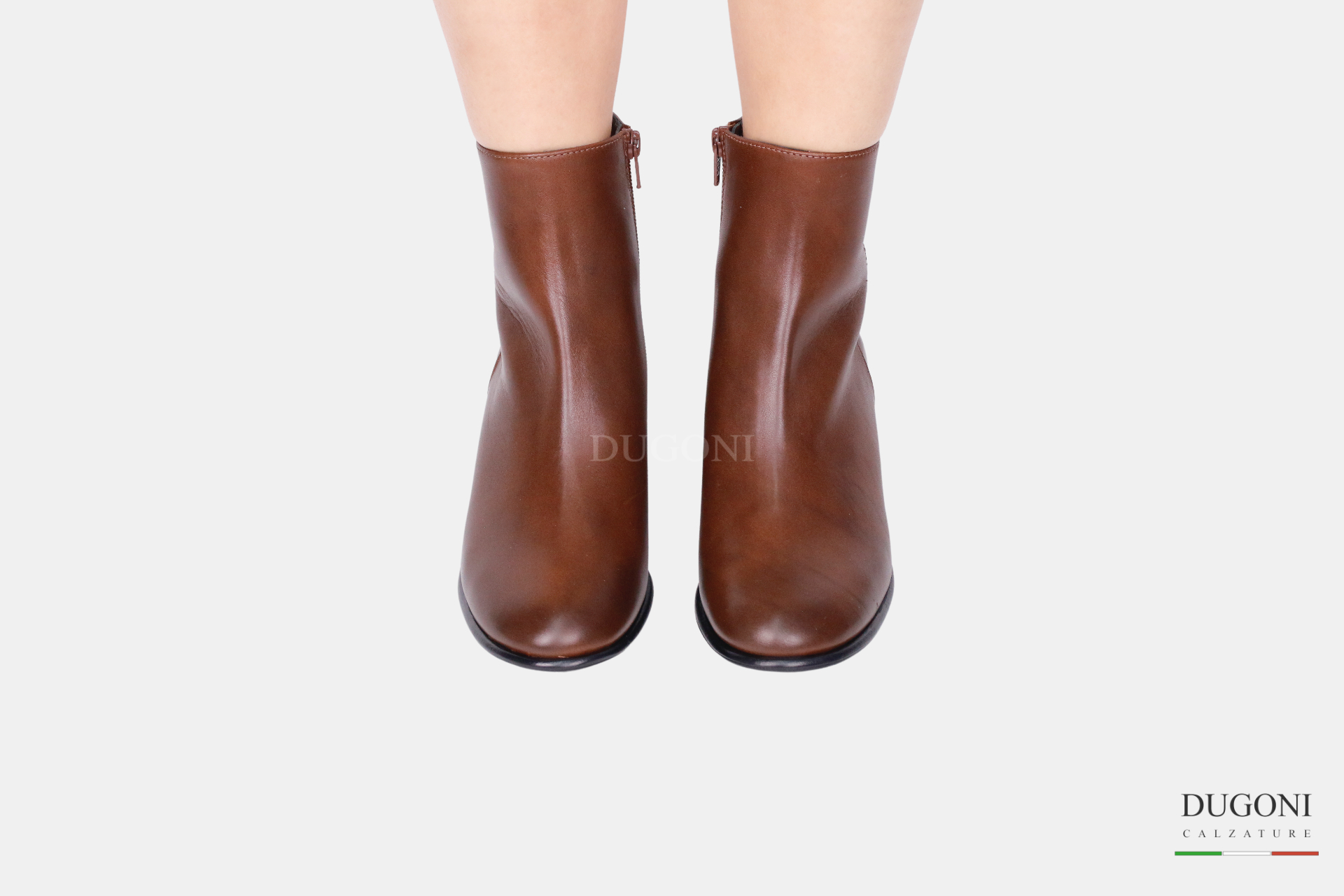 Tronchetto in pelle gange marrone, con cerniera interna. Tacco ricoperto in tinta , suola in gomma.