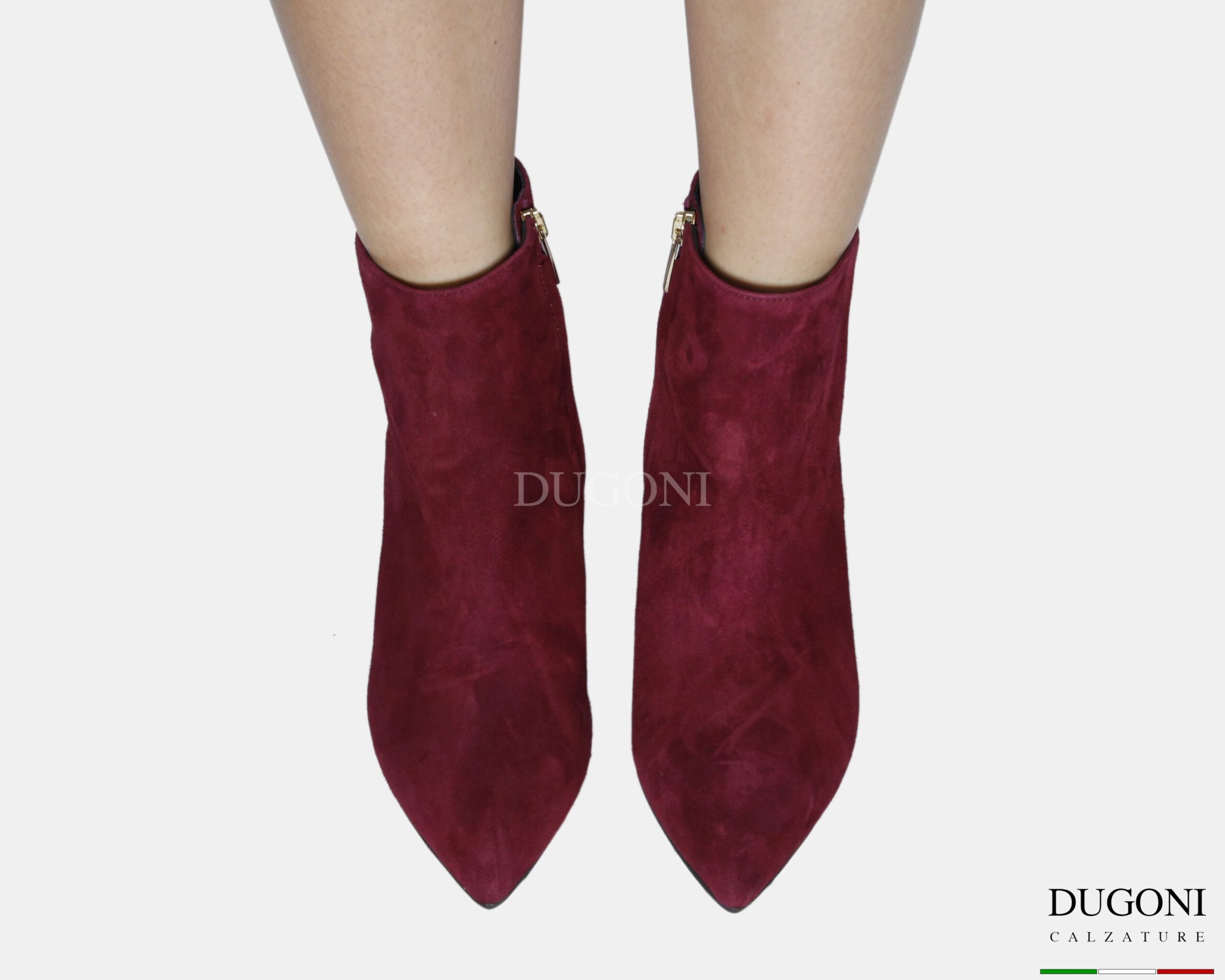 Tronchetto a sacchetto in camoscio bordeaux, tacco a coda. Cerniera laterale. Fondo gomma .