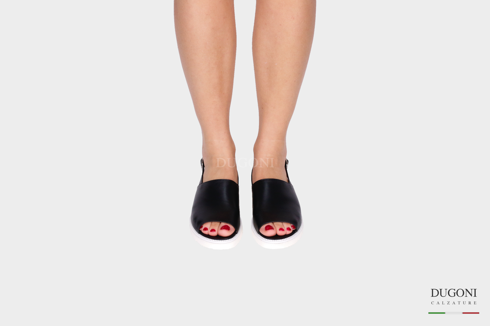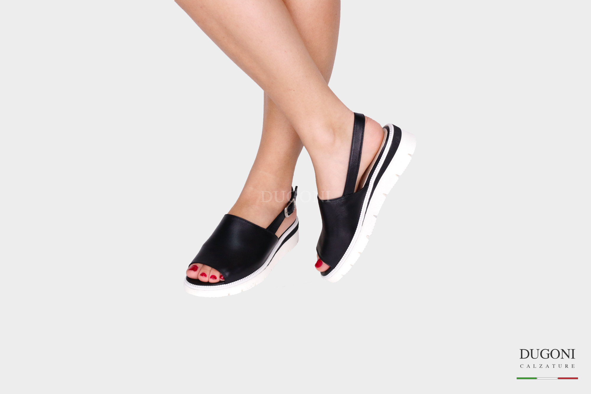 Sandalo con zeppa in pelle di nappa nera liscia. Fascia unica morbidissima sul collo del piede. Cinturino posteriore regolabile. Zeppa in gomma bicolor con profilo con dettagli puntinati argento.